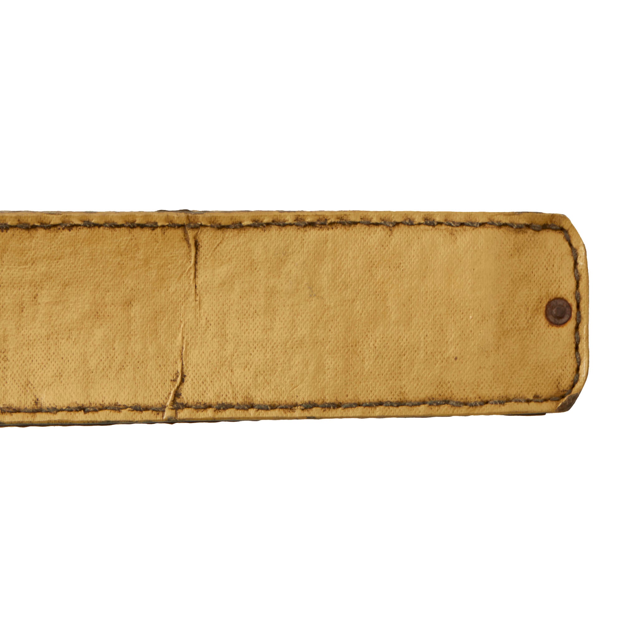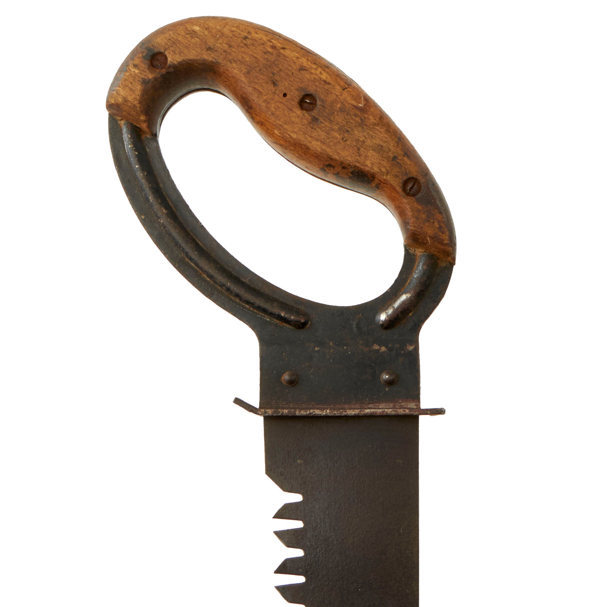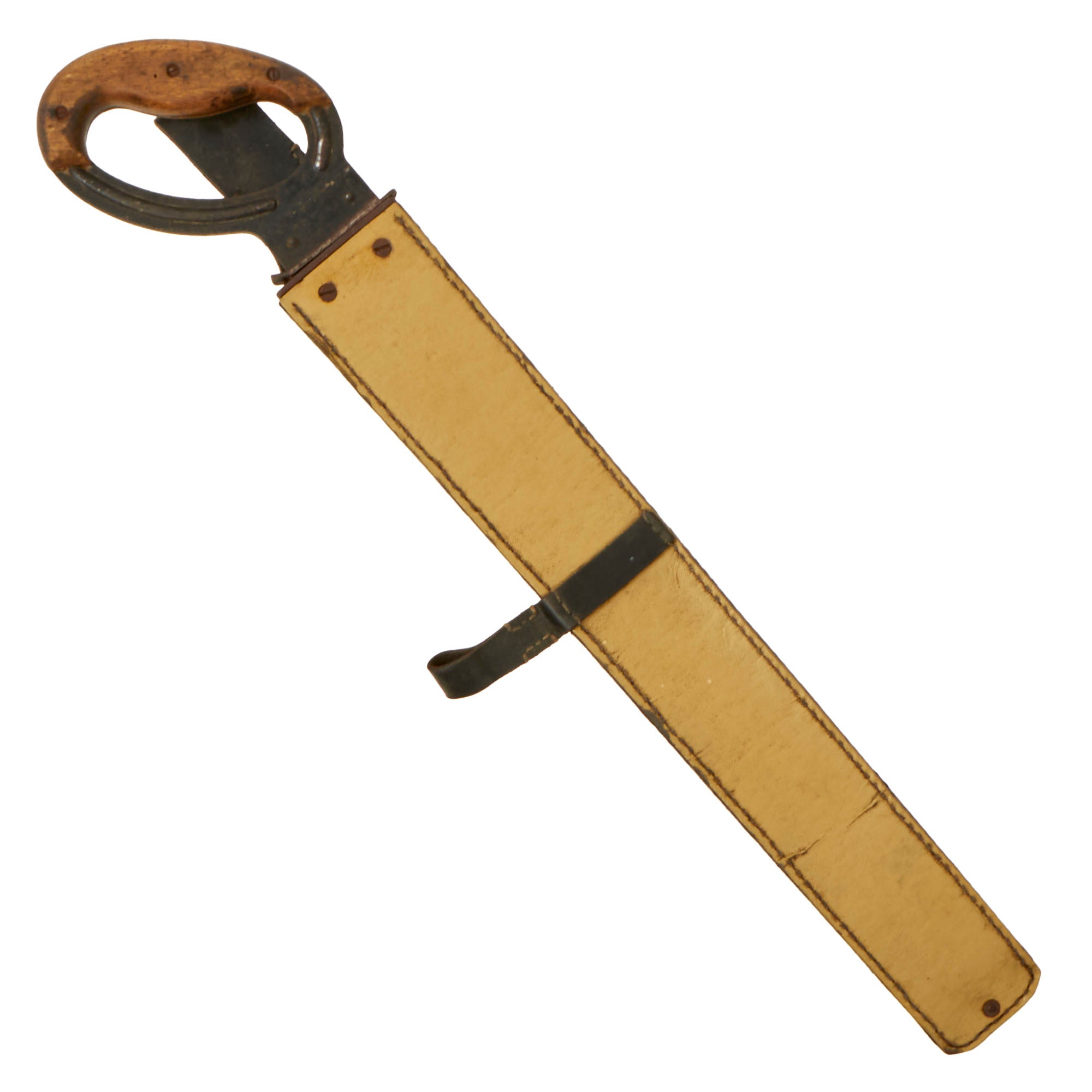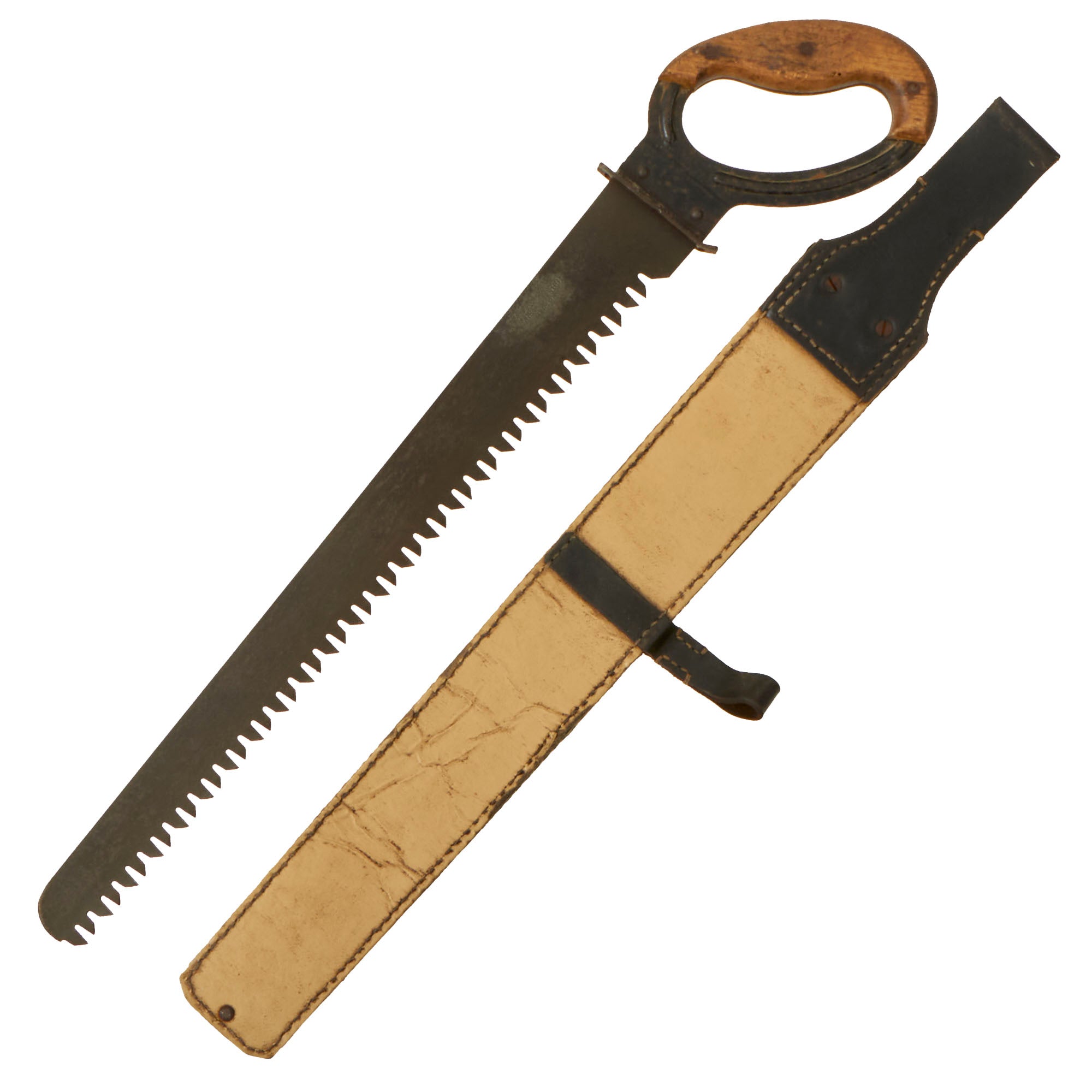 The saw shows heavy use and has some oxidation on the handle and saw as shown. It fits well into the case but has some resistance when being pulled out. The case is in great shape and still retains the loop tab for the bayonet. The tan paint is in fantastic shape and displays beautifully. This is the first Pioneer saw we have ever offered, and one of the first we’ve ever seen with the extremely scarce Prestoff case. Don’t miss out on this stunning example. Comes ready for further research and display.