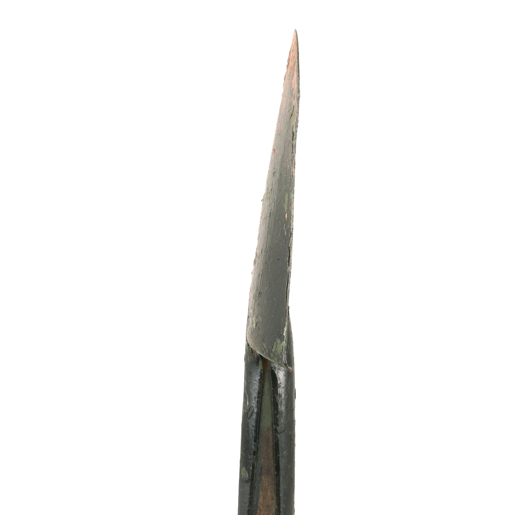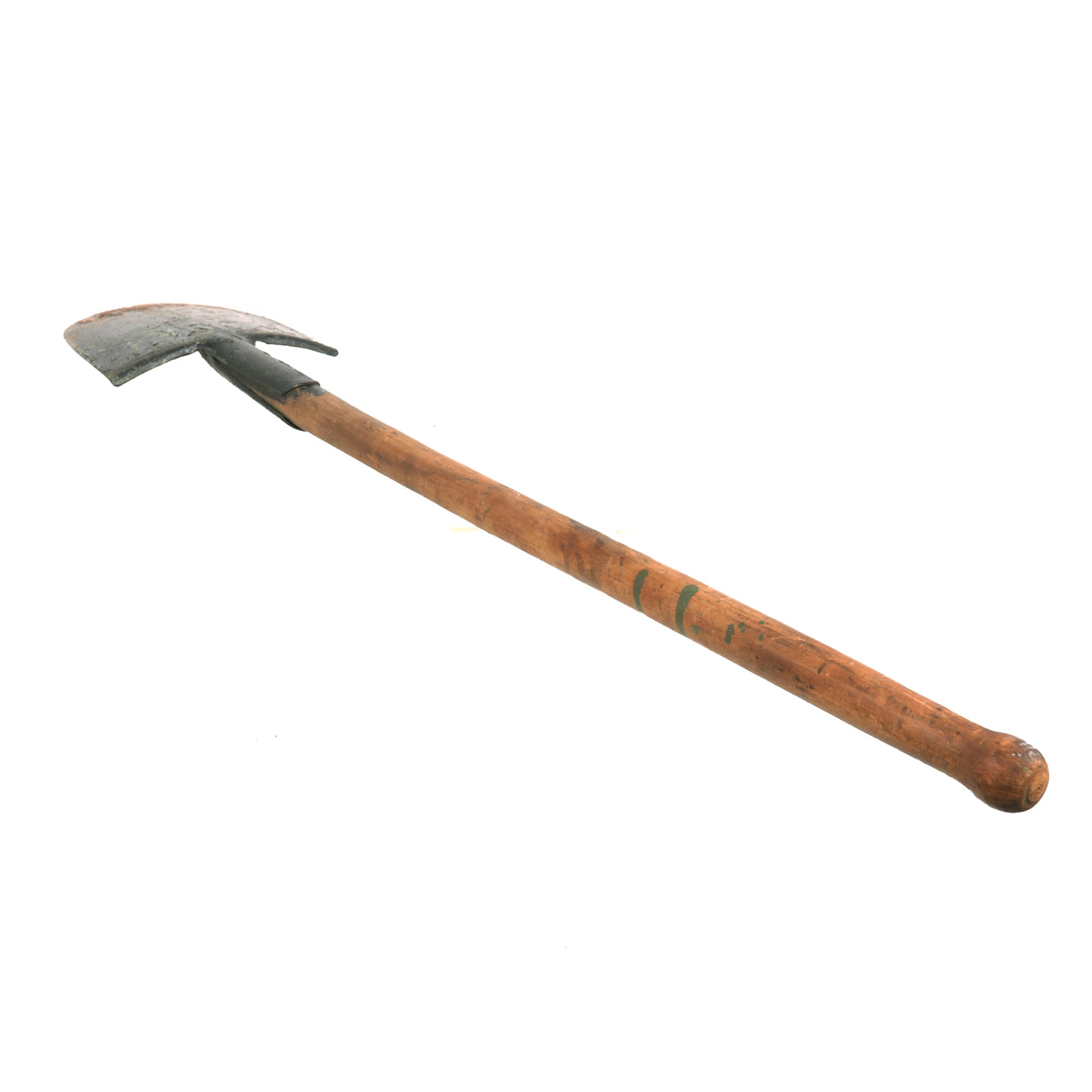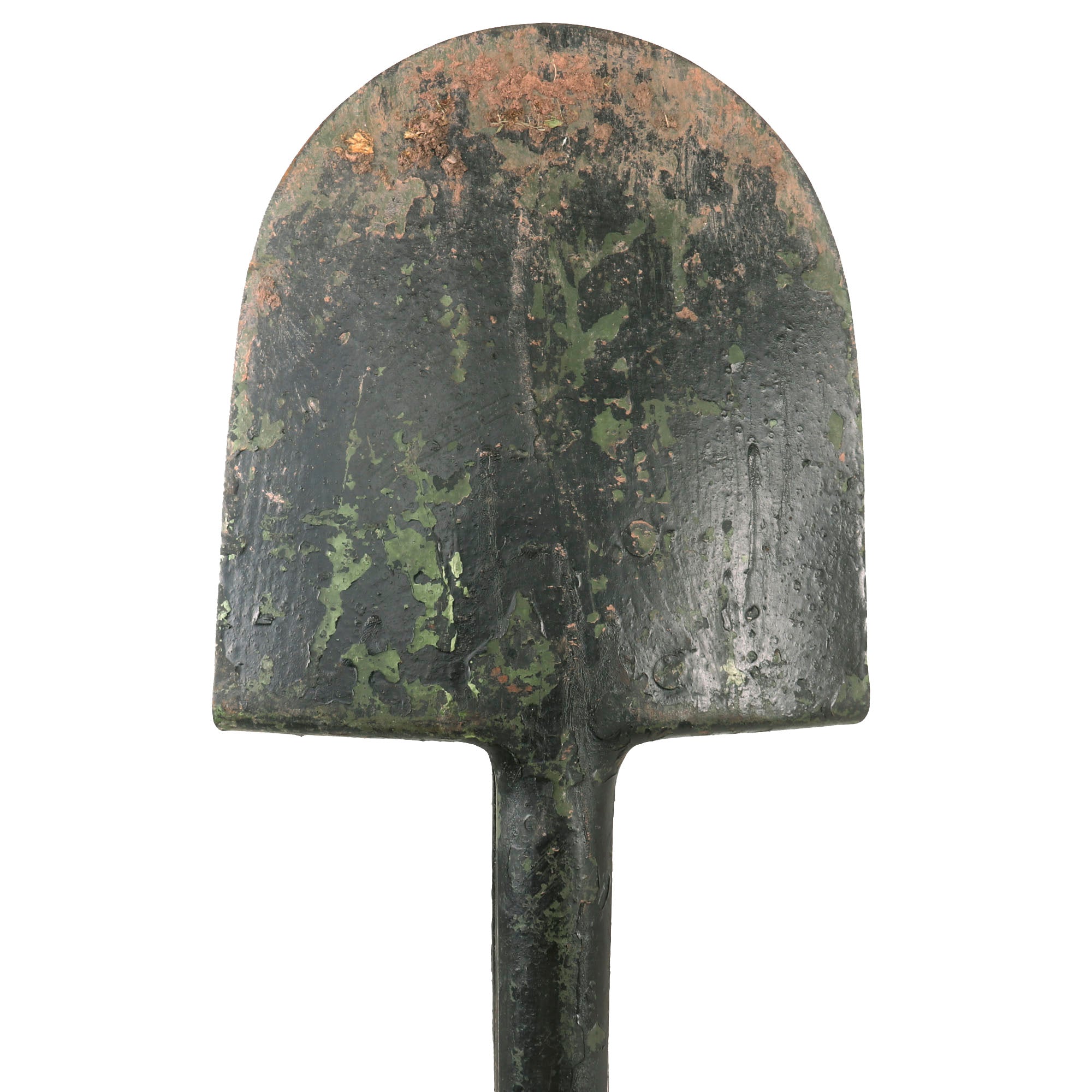 These are extremely difficult to find in any condition, and are normally heavily cut down. But this one has managed to stay intact and appears to have been used recently, with dirt remnants still on the tip of the spade. It appears to have been painted green and later black to give it the WWI look. But from the construction we believe it to be World War II. Comes ready for further research and display.