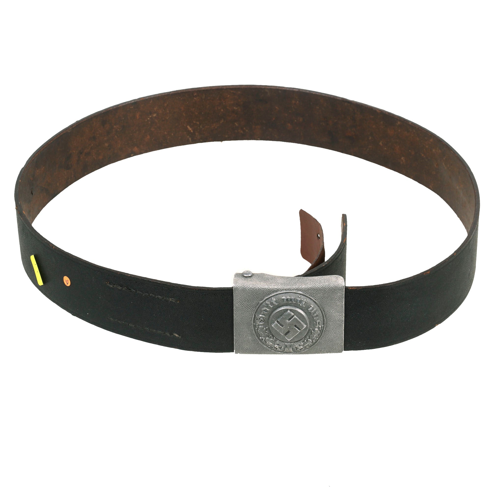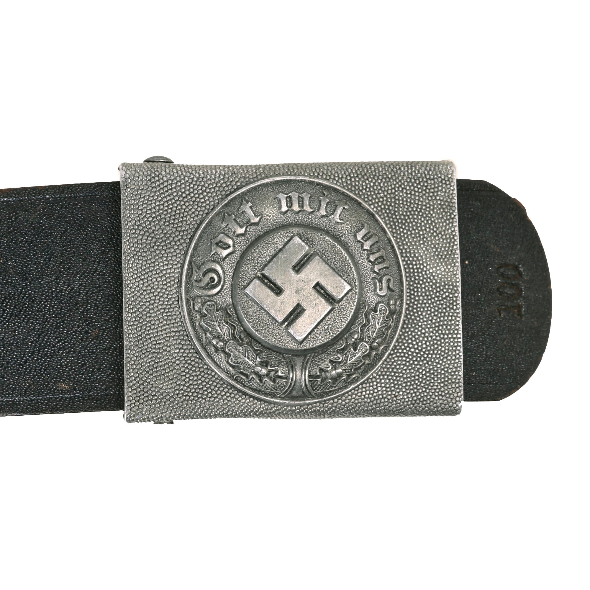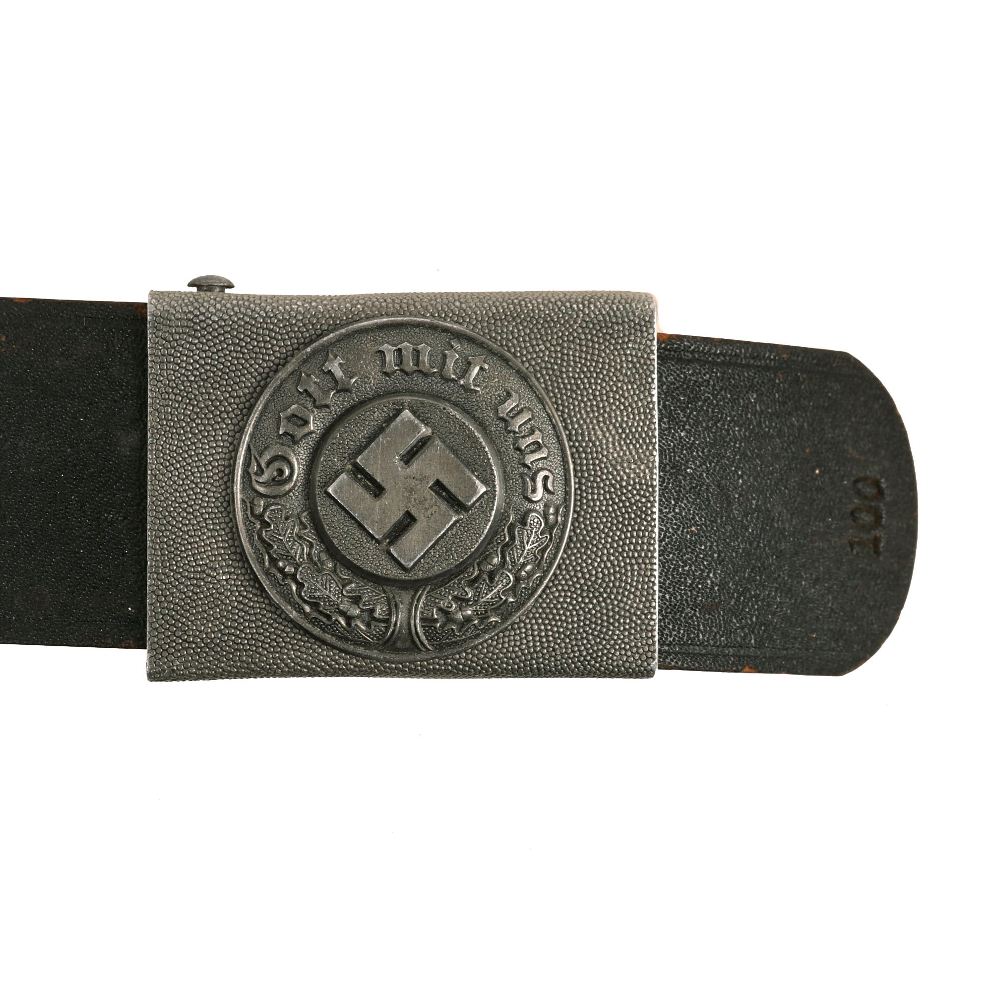 Original Item: Only One Available. This is an excellent condition WWII German Polizei (Police) NCO's Pebbled Belt Buckle (Koppelschloß) with an original black finished Preßstoff faux leather belt. It is embossed with a central swas (hook cross), with a wreath around it bearing the motto Gott mit uns (God with us). It features a nice crimped pebbled aluminum body, which has an aluminum medallion insignia attached to the front. The retaining catch for the clip is stamped directly into the buckle. It is in excellent condition, showing very little wear of any kind. There is no maker mark that we can see on the buckle.