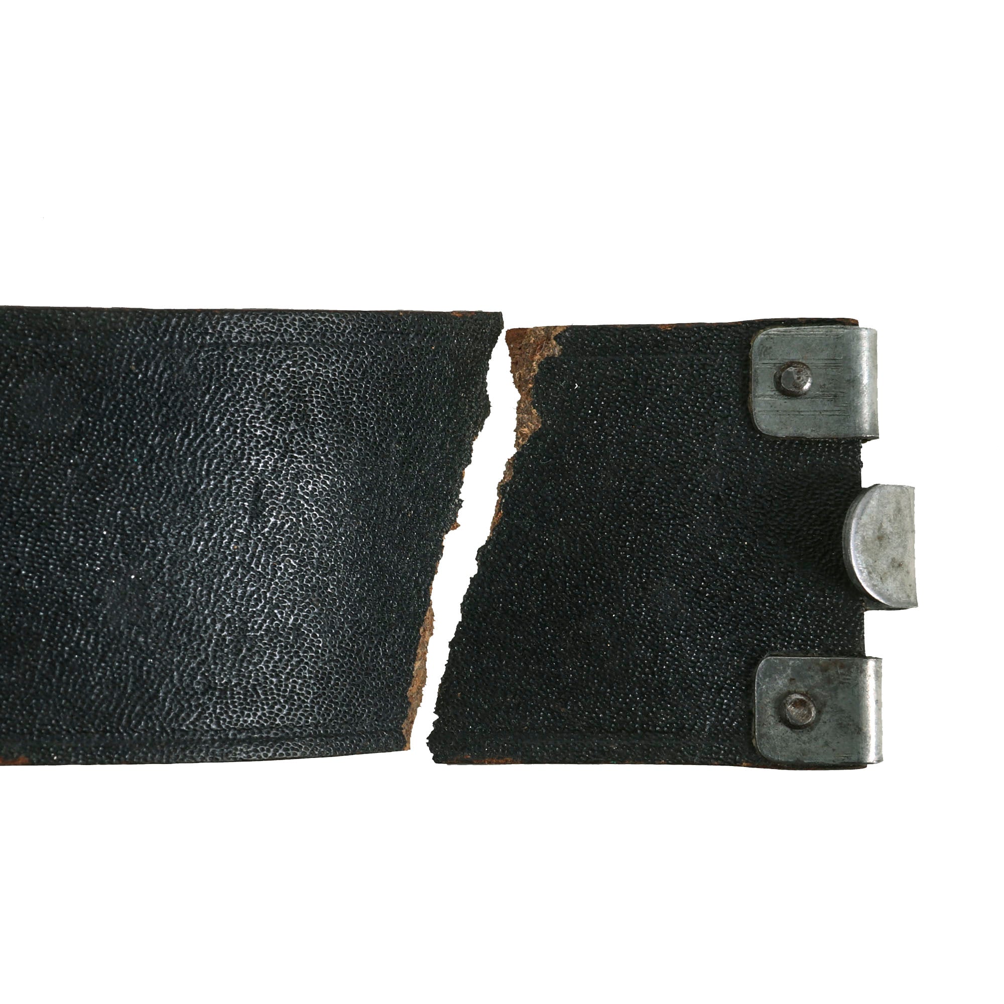 The end of the belt, the last inch and a half, has unfortunately broken off of the belt. This could possibly be sewn back on for display. The Preßstoff faux leather belt is otherwise in good condition, with a lovely black pebble grain finish on the exterior, and a dark brown color on the interior. It retains the leather size adjustment tab with a double row of 7 holes, which does show some finish degradation and bending at certain places, as it is the same material as the belt. It is definitely quite stiff, and we do not recommend trying to straighten out, as it may damage the material. It is marked with Size 100, and due to condition we cannot measure the overall length.