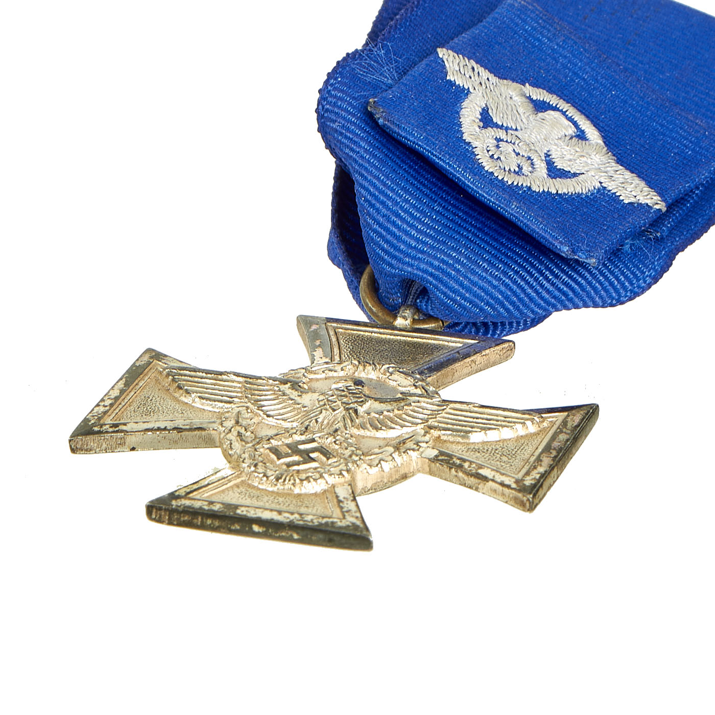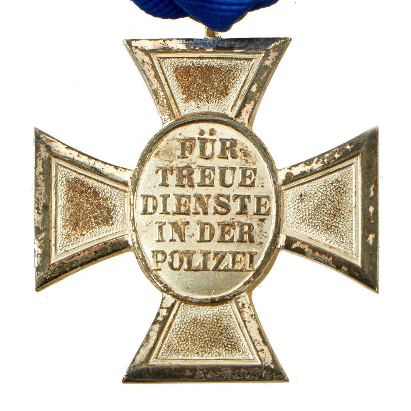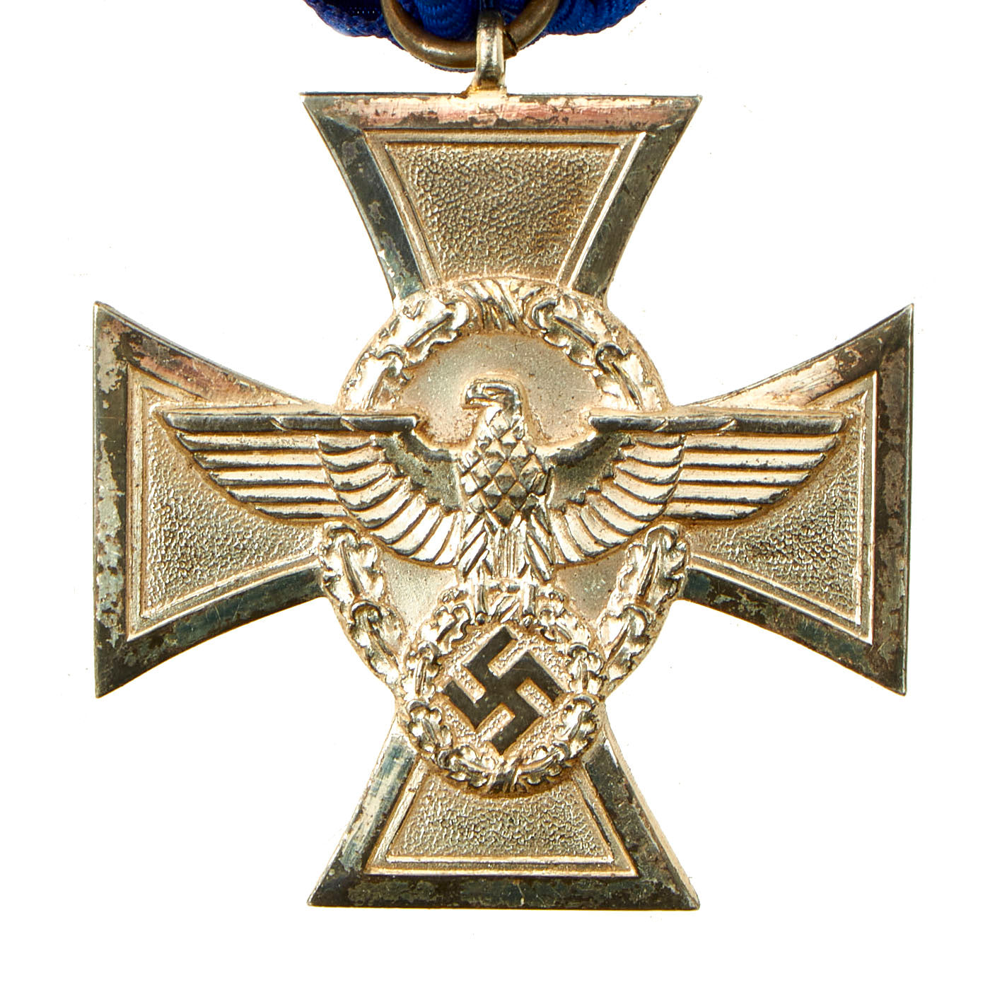 On 30 January 1938, Adolf AH ordered the institution of an award for members of the police force who met qualifications based on length of service. The award was given in three grades to men who had served for eight, eighteen, and twenty-five years. The design of all three medals had the police insignia, which consisted of a national eagle emblem surrounded by a wreath, on the obverse side. The third class award was a silver medal, the second class a silvered cross, and the first class a gold cross.