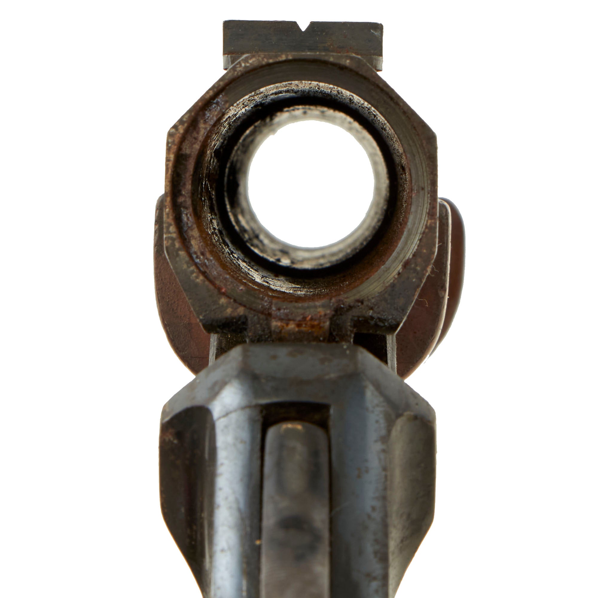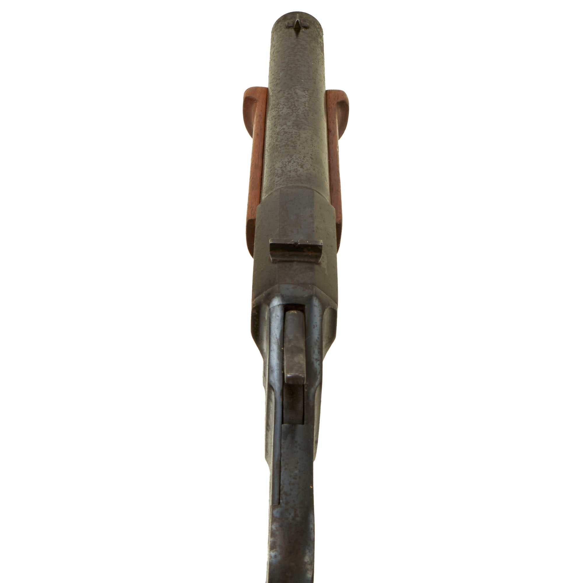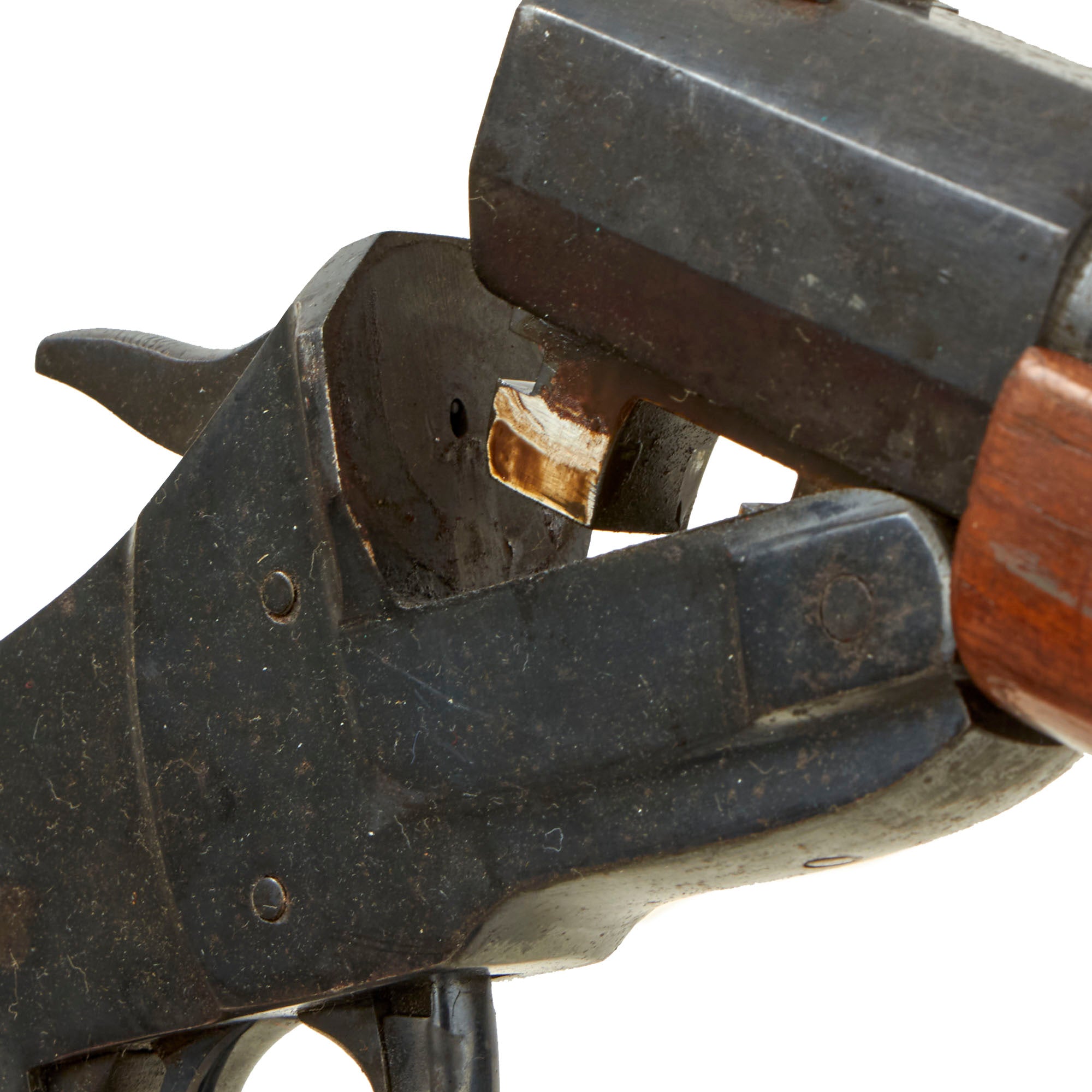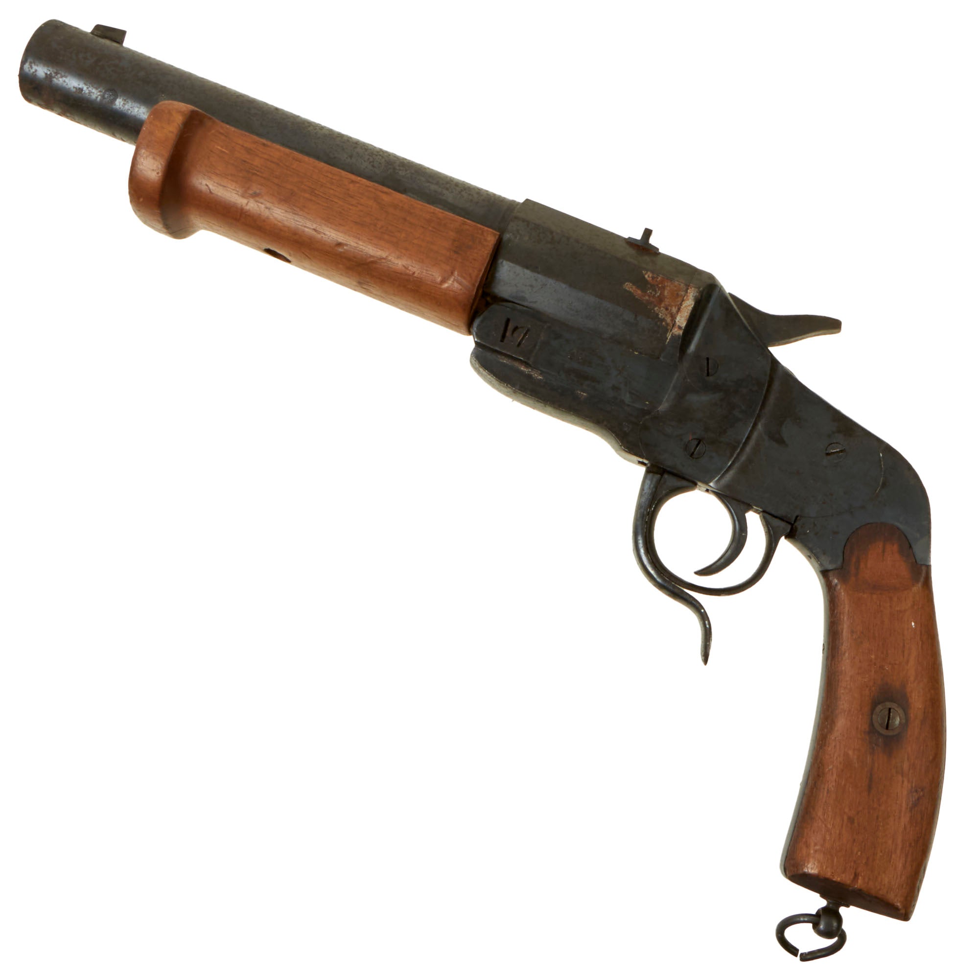 Original Item. Only One Available. This is an extremely scarce Hebel German flare pistol that was modified by the German police in 1936 by the addition of bore sleeve, sights and fore-stock for the shooting of tear gas cartridges. The cartridge casing was the same diameter of standard German flare pistols, 26.5mm, but it contained a tear gas round launched through the slightly smaller bore diameter. The sights and fore-stock assisted accuracy, though some pieces had only the fixed sights.