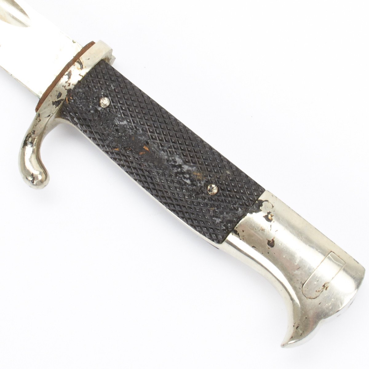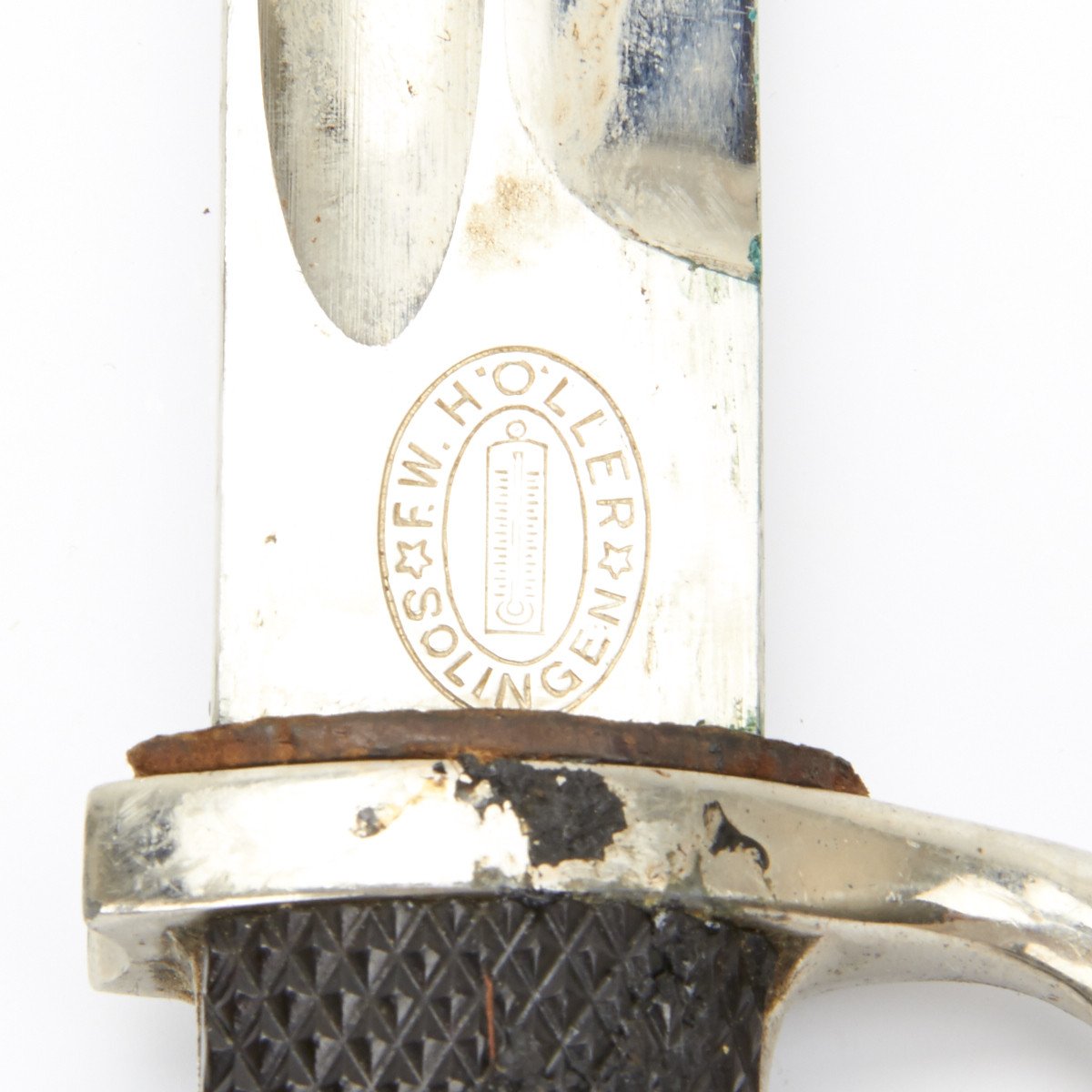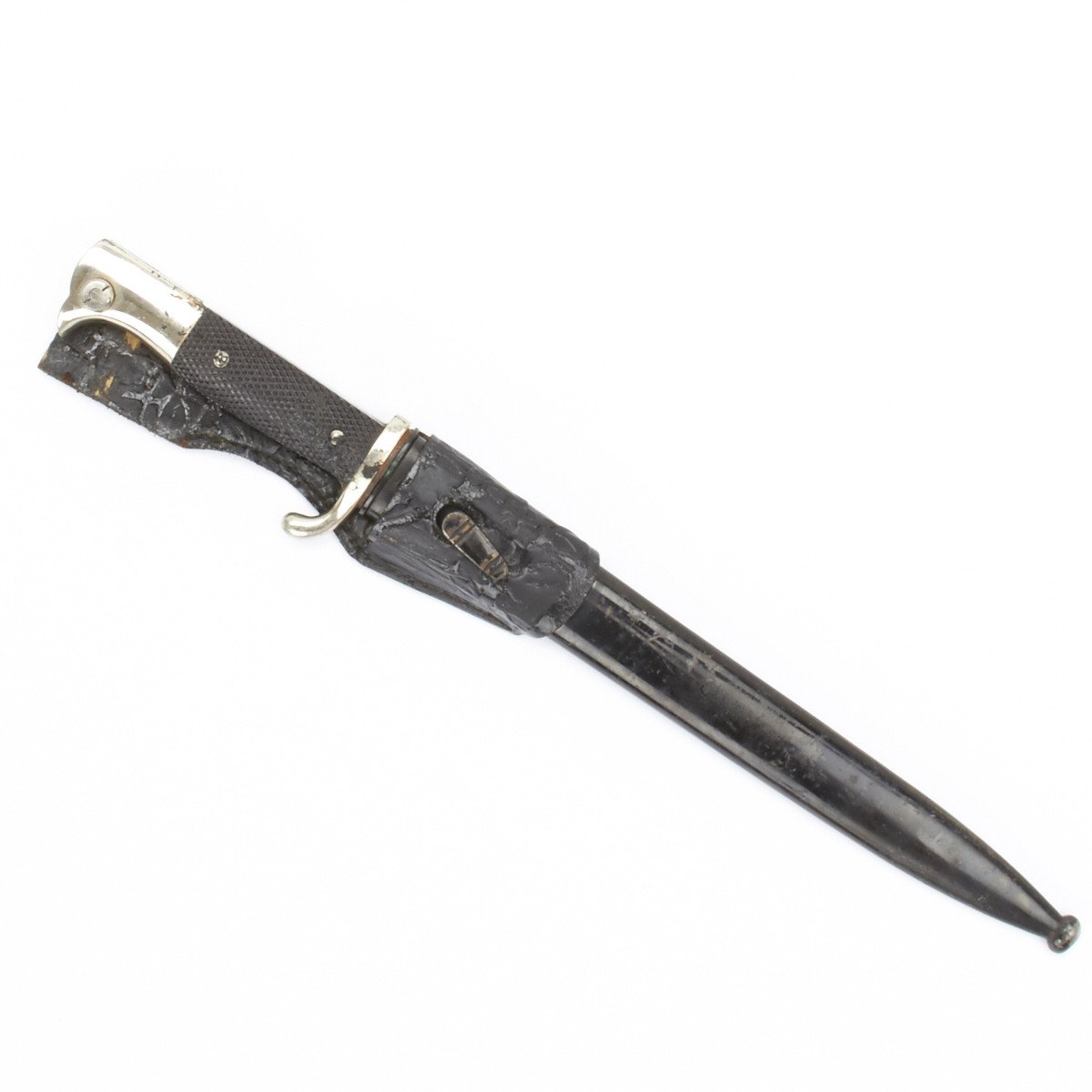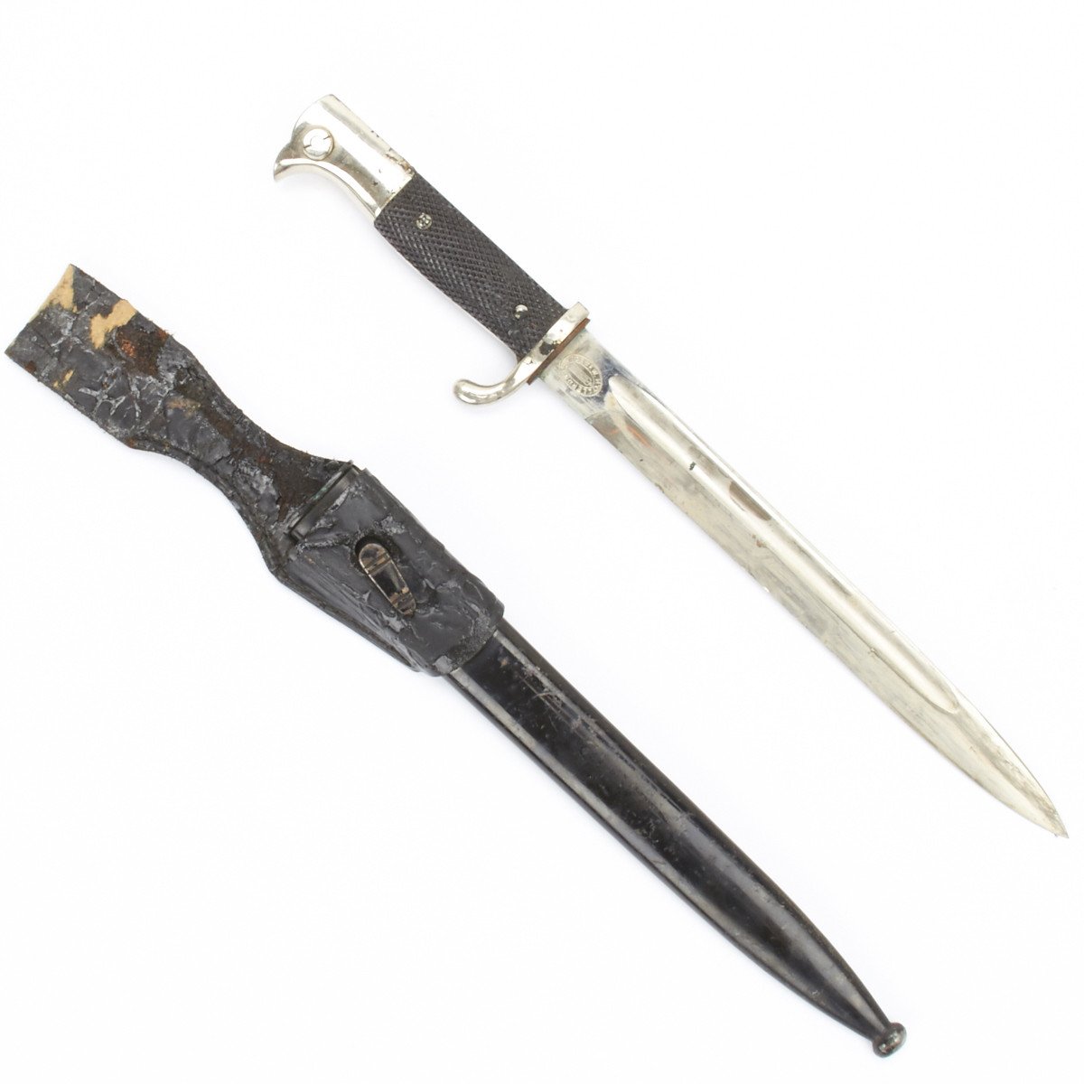 Original 98k Short Dress Bayonet made and marked by F.W. HOLLER, SOLINGEN. Nice condition, blade retains 90% finish as well as scabbard. Late war frog has damage to patent leather as if it was exposed to heat.