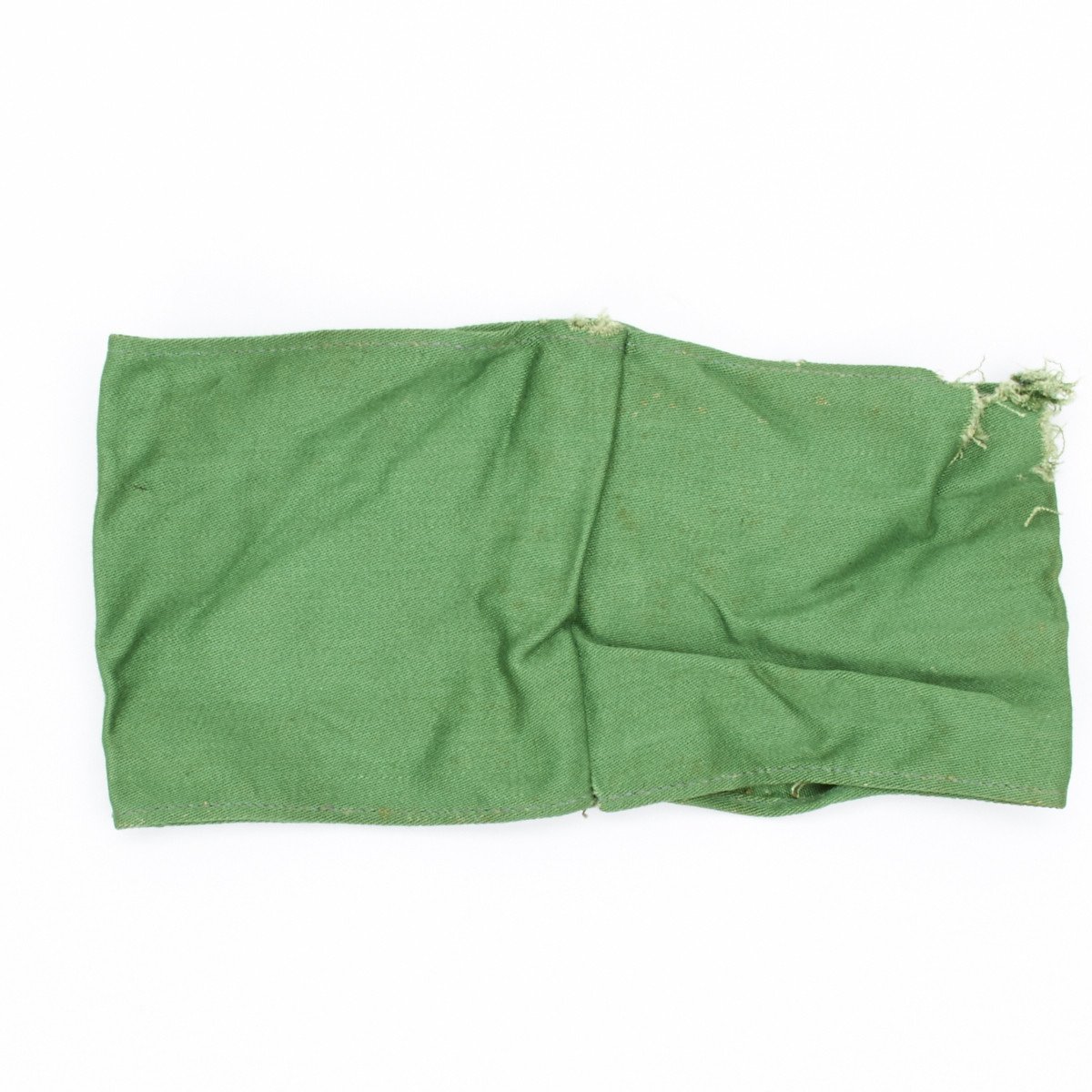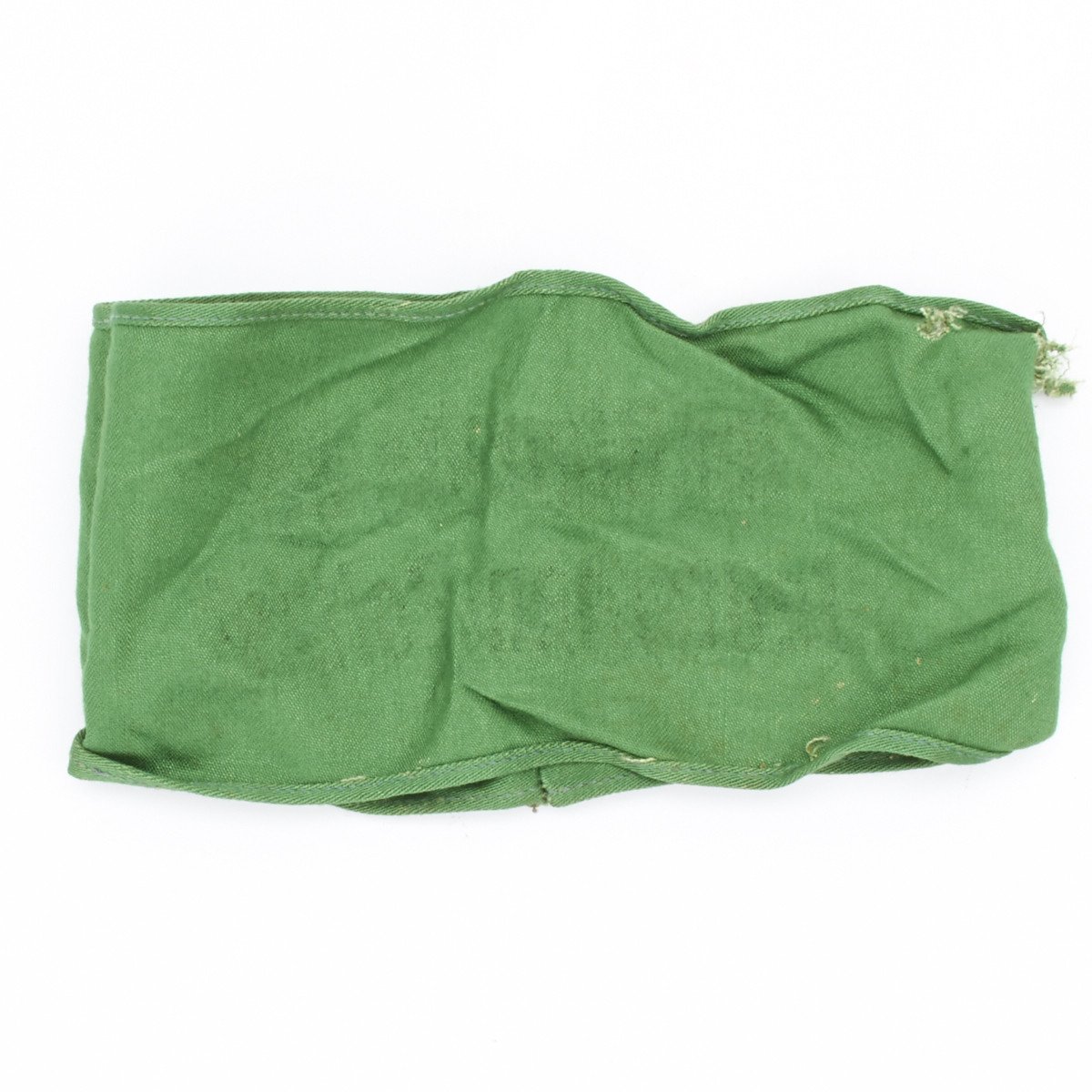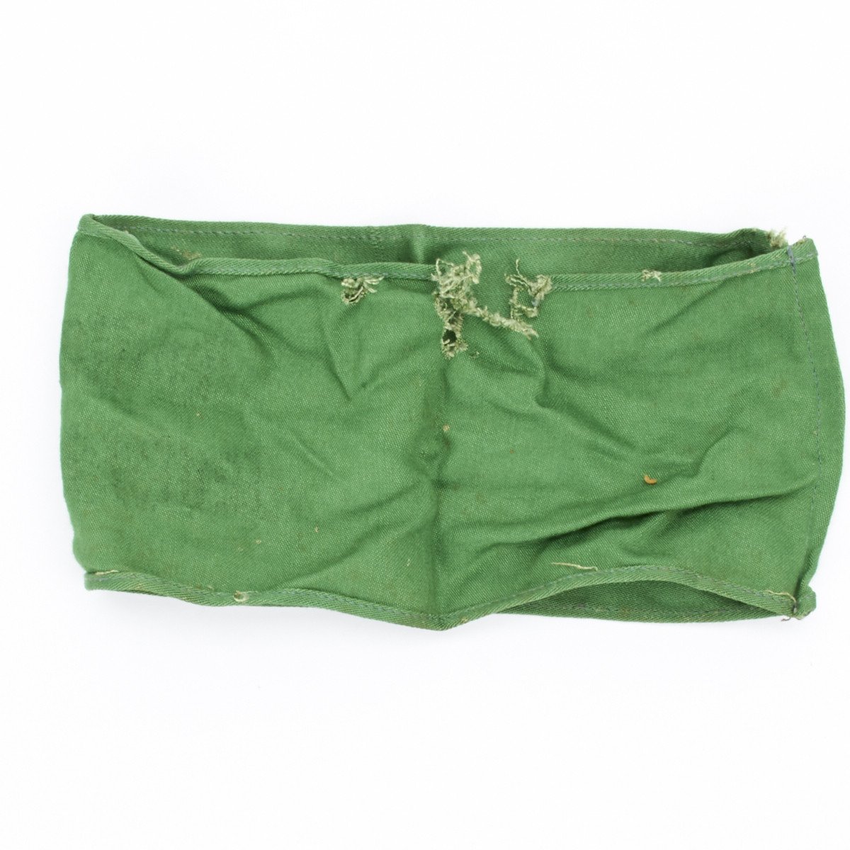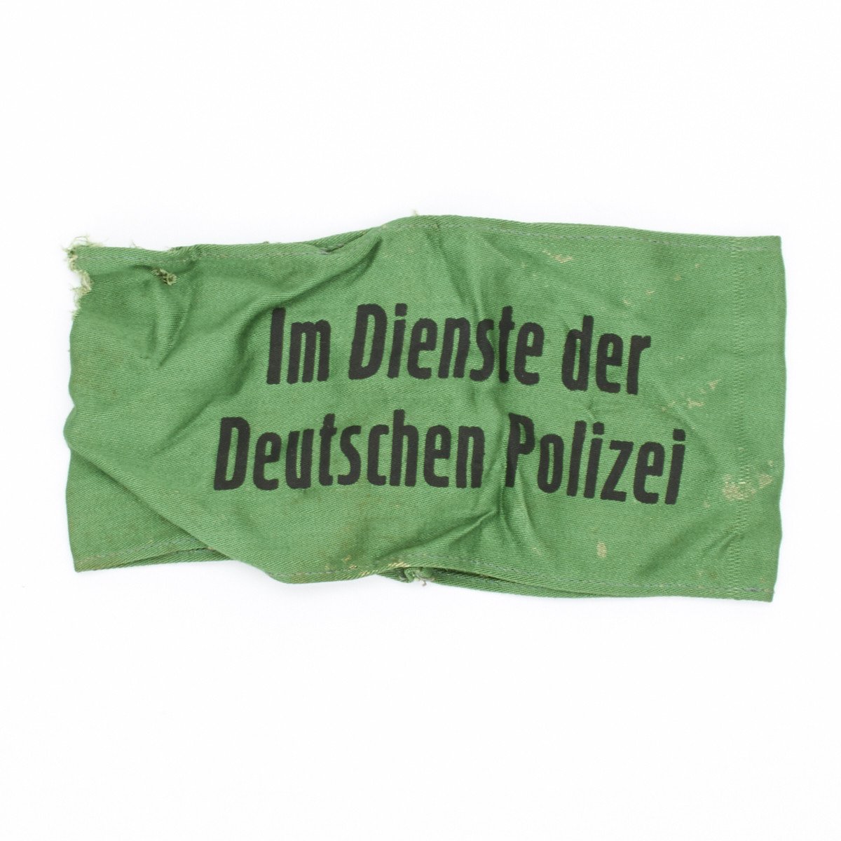 Original Police Green Armband- (Ärmelbinde) Green cotton/rayon construction armband with black printed Latin script reading "Im Dienst der Deutschen Polizei" (In Service of the German Police). Reverse of armband has a machine stitched vertical seam. Shows the expected light age toning, and minor holes damage to one side, but overall very good condition. Scarce.Measures- 4 ¼ inches wide by 19 inches long (band is stitched together at central seam)