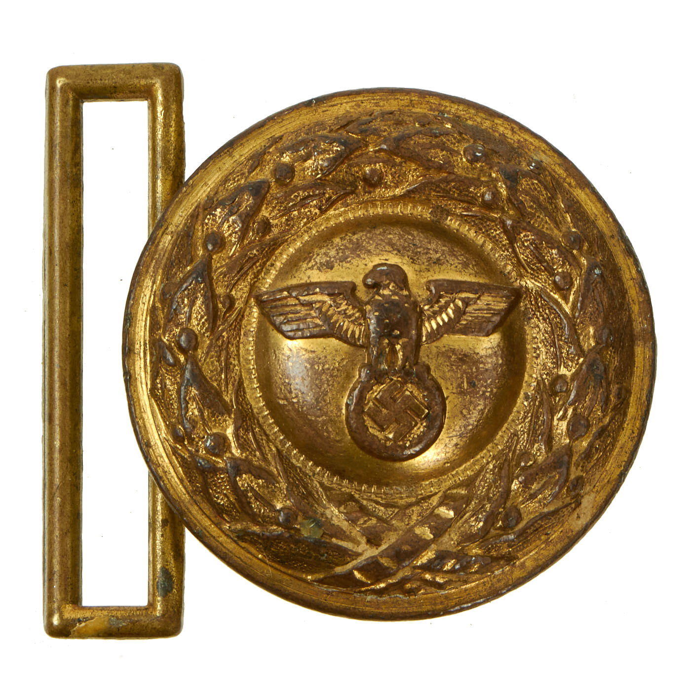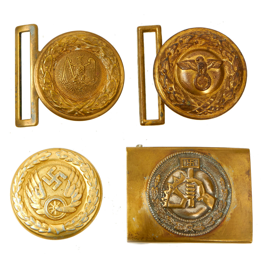 Original Items: Only One Lot of 4 Available. The belt buckle was an important part of the regalia worn by all uniformed military, civil, political and paramilitary organizations during the Third Reich. The belt was part of the uniform and would always be worn while on duty. The belt buckle was generally specific to each organization, with many organizations having separate belt buckles for officers and for enlisted personnel, sometimes with different colors and finishes to further denote specific purposes. The buckles were adorned with various mottos and designs specific to the organizations for which they were intended. Many designs used the German national eagle emblem, in a variety of forms. Belt buckles were worn with uniforms ranging from finely tailored officer parade uniforms, to the issued uniforms of enlisted soldiers in combat. Most German belt buckles of the Third Reich were made with two prongs on the reverse, to allow the buckle to be worn and adjusted on a belt and would have a catch on the other end of the belt for securing. The earliest Third Reich buckles were often made of brass or nickel silver. Later, aluminum became very common, and was used on private purchase as well as enlisted buckles of the German military, with or without a painted or plated finish. After the war began, most enlisted military buckles were steel.