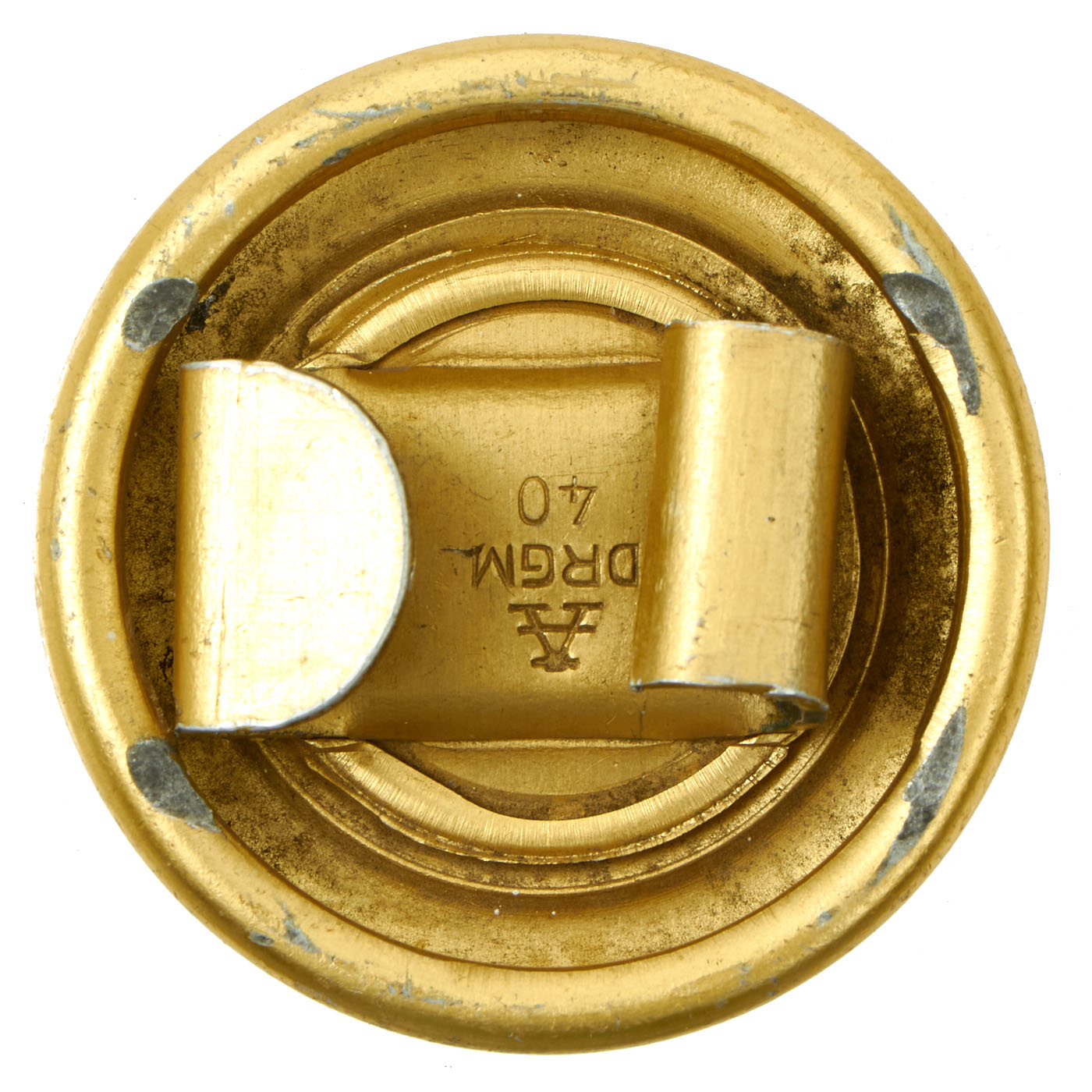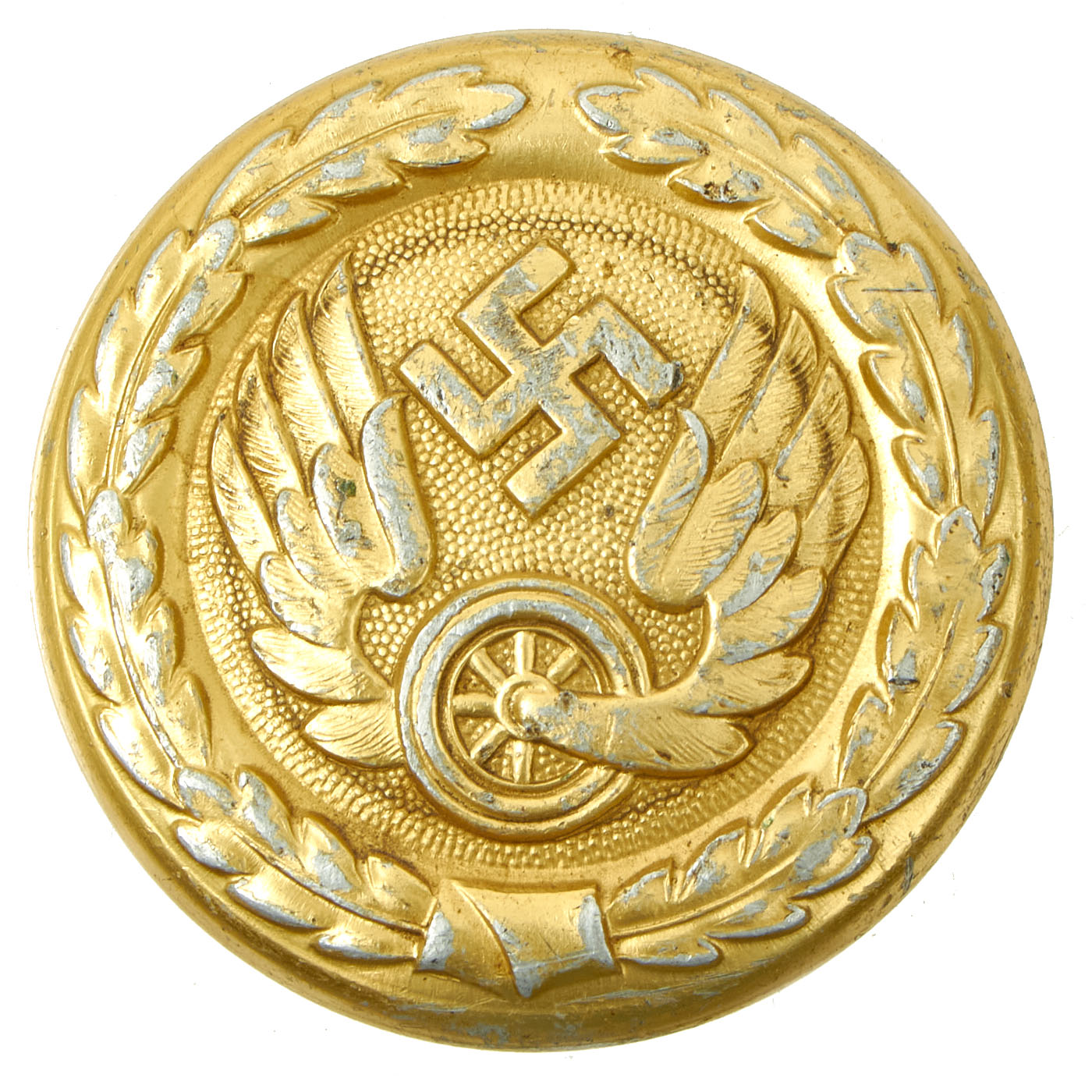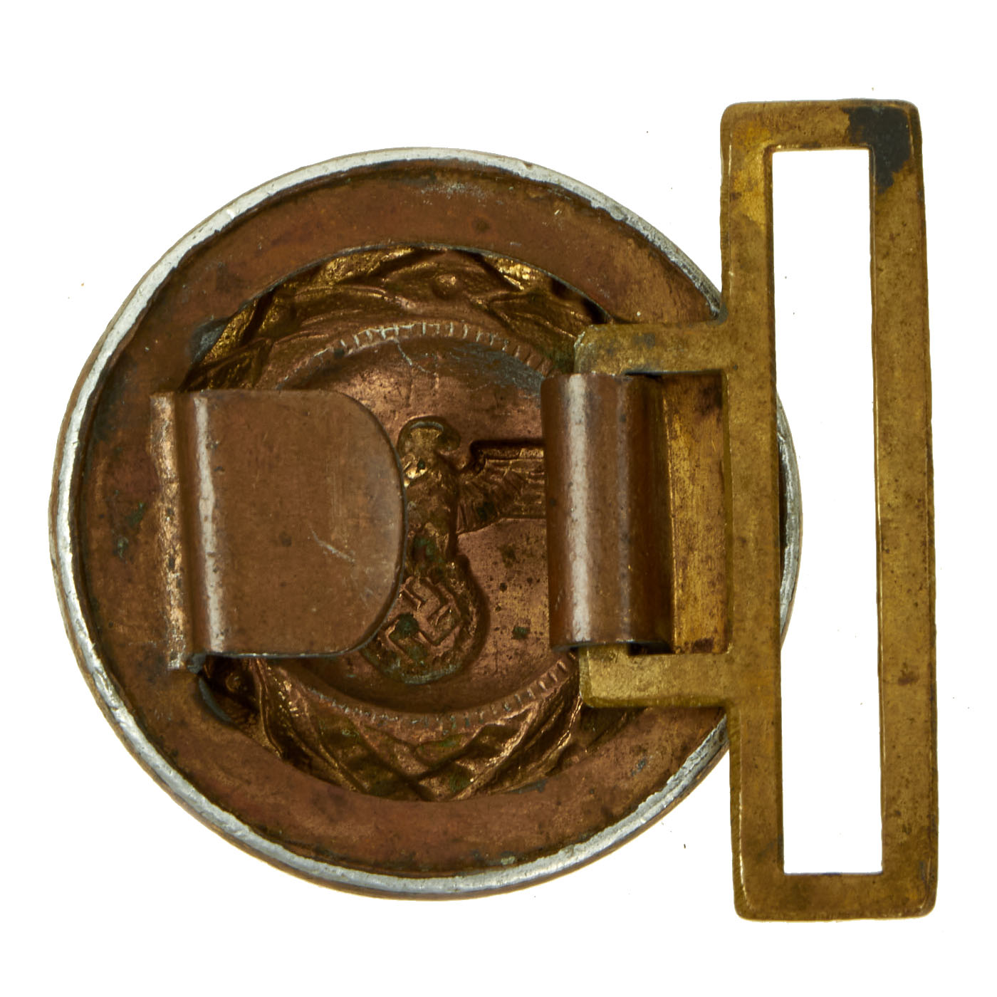 - Reichsbahn Officer’s Buckle: After AH’s accession to power in 1933 he immediately began a restructuring of the national railway system and by early 1937 had succeeded in achieving a centralized efficient National Railway. With this restructuring new uniforms and insignia were introduced for railway personnel in 1933. Additional items of insignia were introduced and modified at various times throughout the war. The round buckle was Introduced in 1940 for wear by RBD officers. Buckle was worn on the black leather belt for service dress and the brocade belt for dress wear.