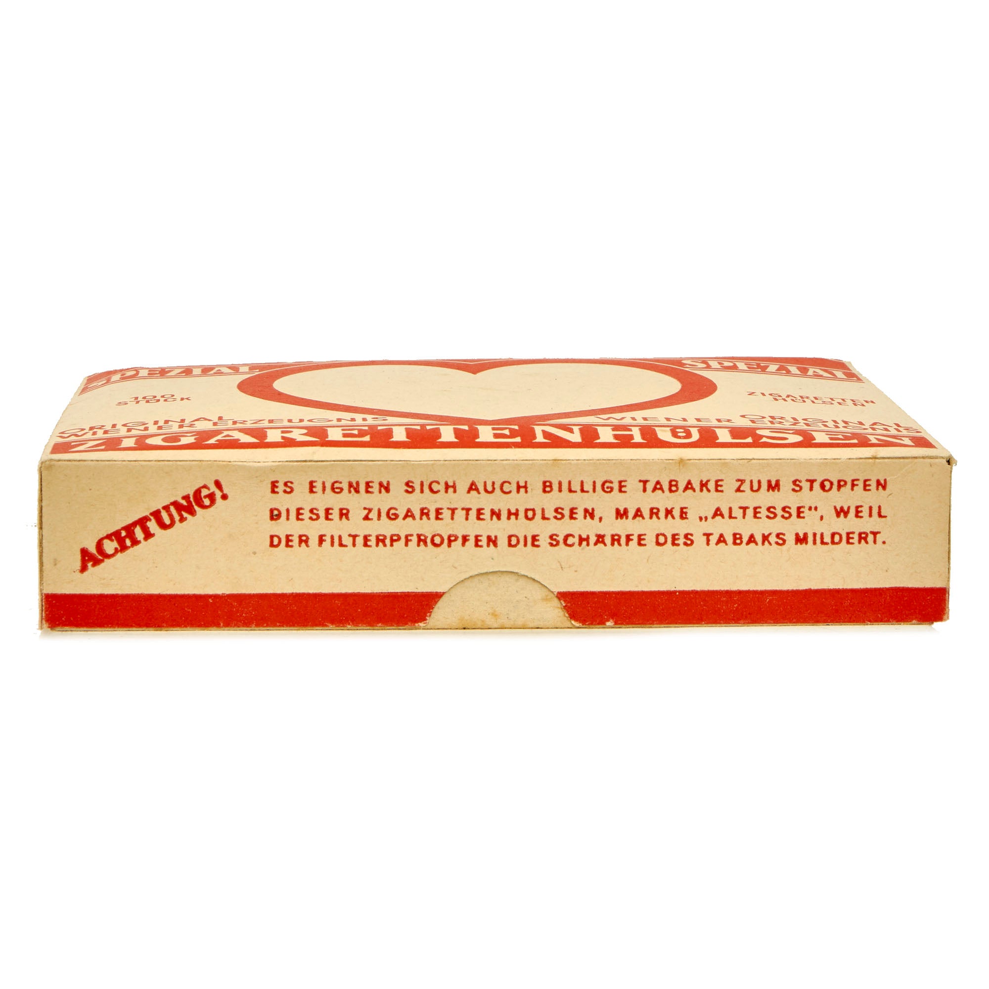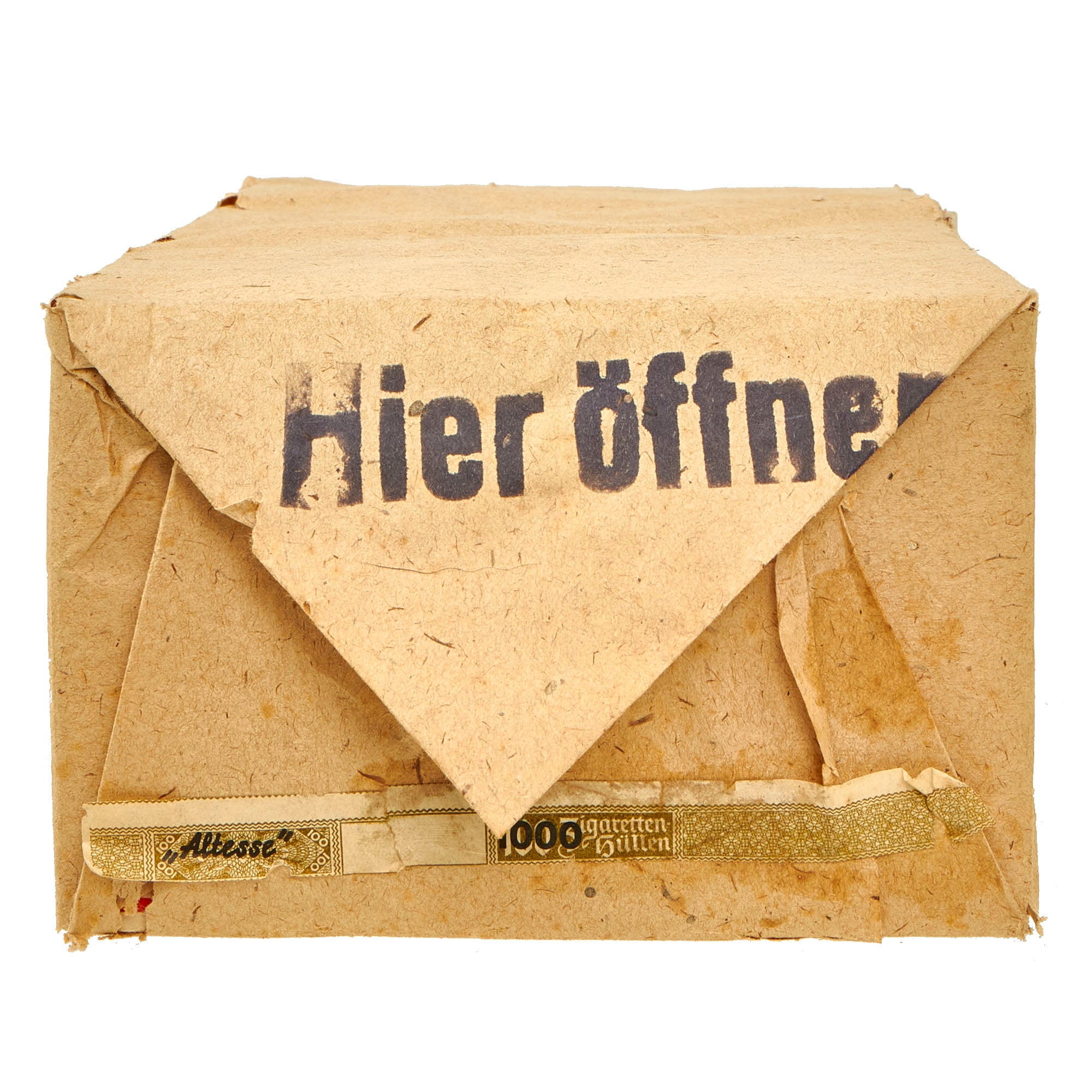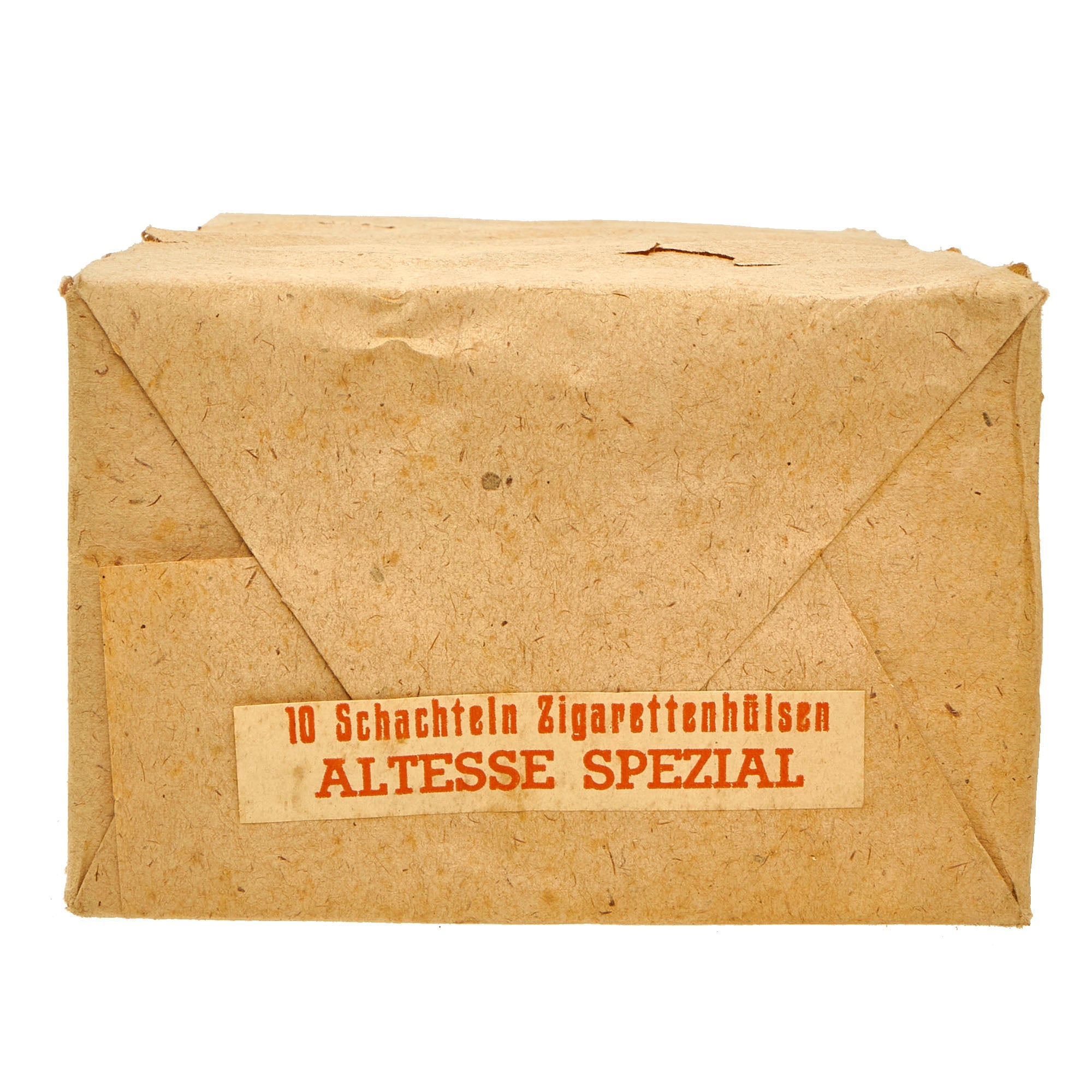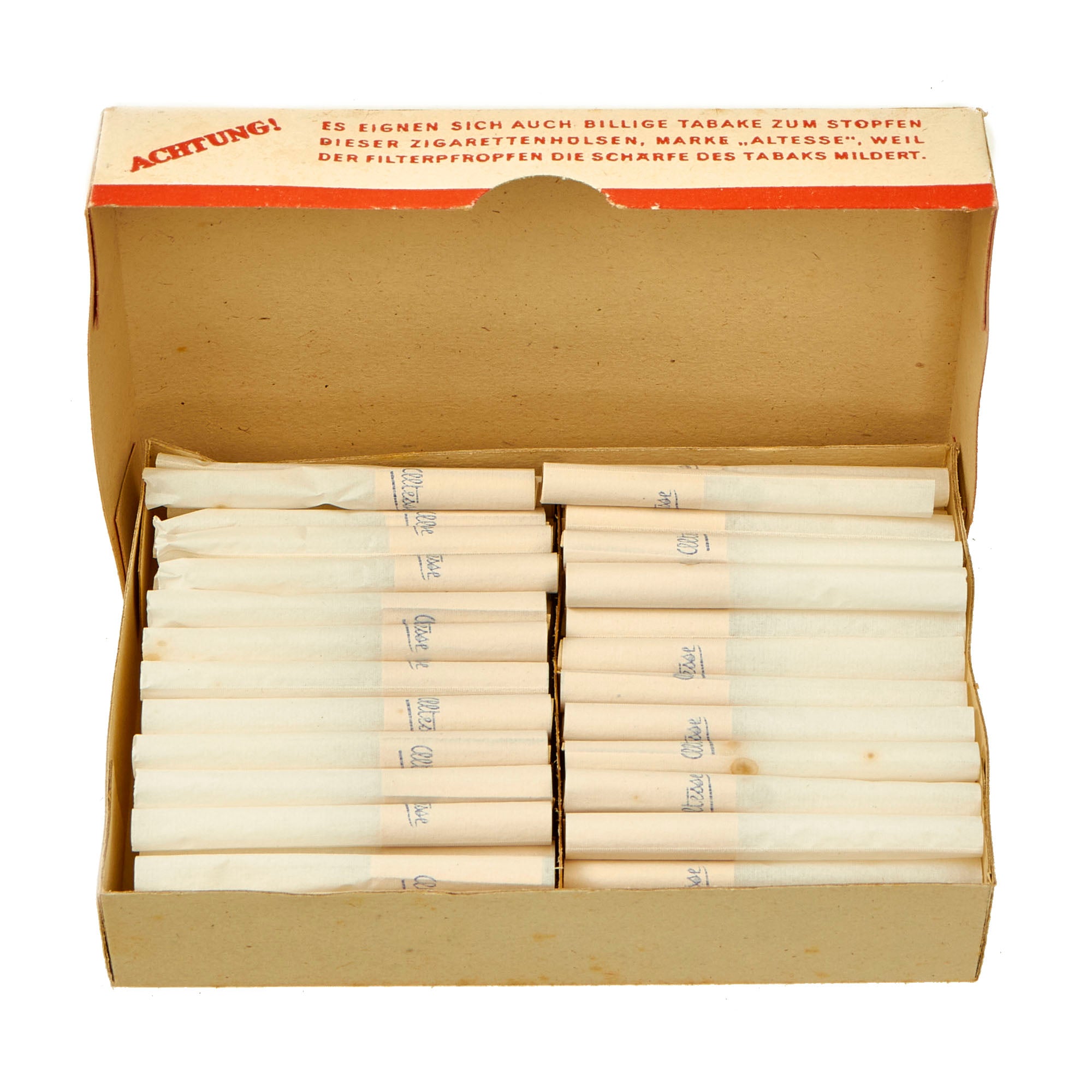 Original Items: Unissued. Straight from the crate! Or in this case, the original stamped and heavy paper packaging, which is marked Hier öffnen, or "Open here" on one end. The bottom of that end of the packaging shows a clear Reichsadler raised stamp, so these were most likely intended for military use, probably for officers. The boxes each contain 100 pre-rolled zigarettenhülsen (cigarette tubes), which have thicker paper at one end with "filter plugs" inside. These are nothing like modern filters, and look to just be small wads of paper that do not even go all the way across the tube.