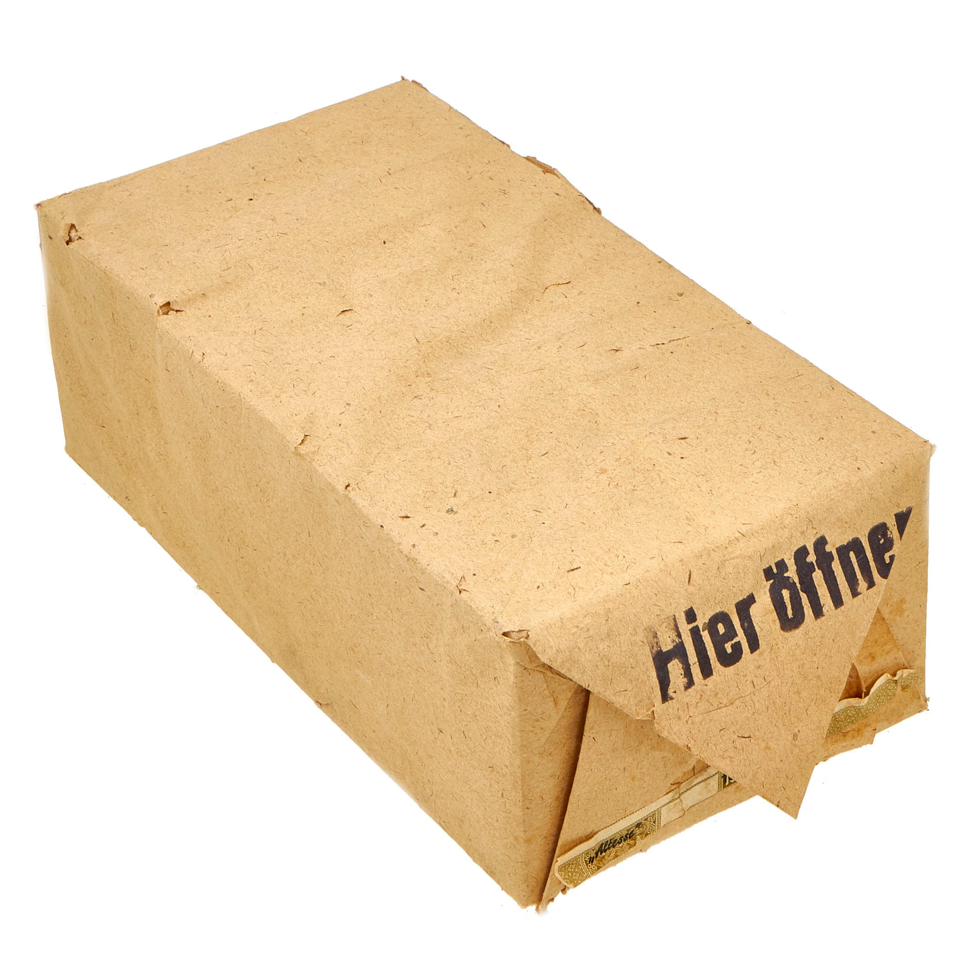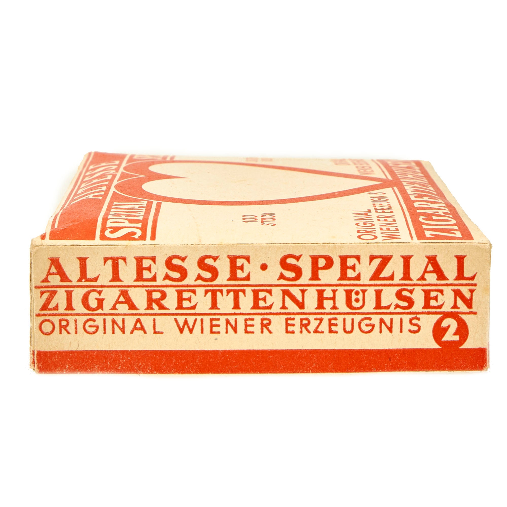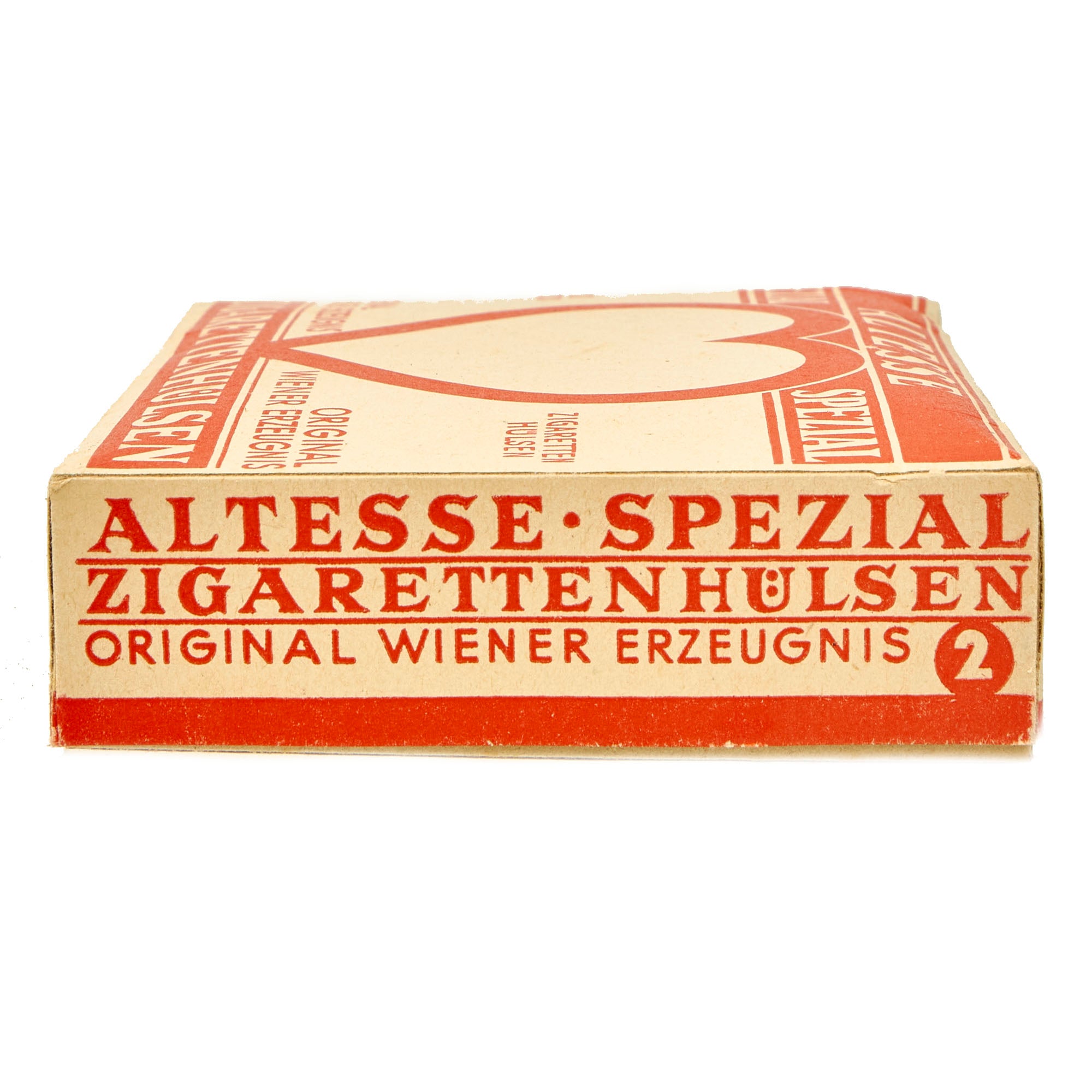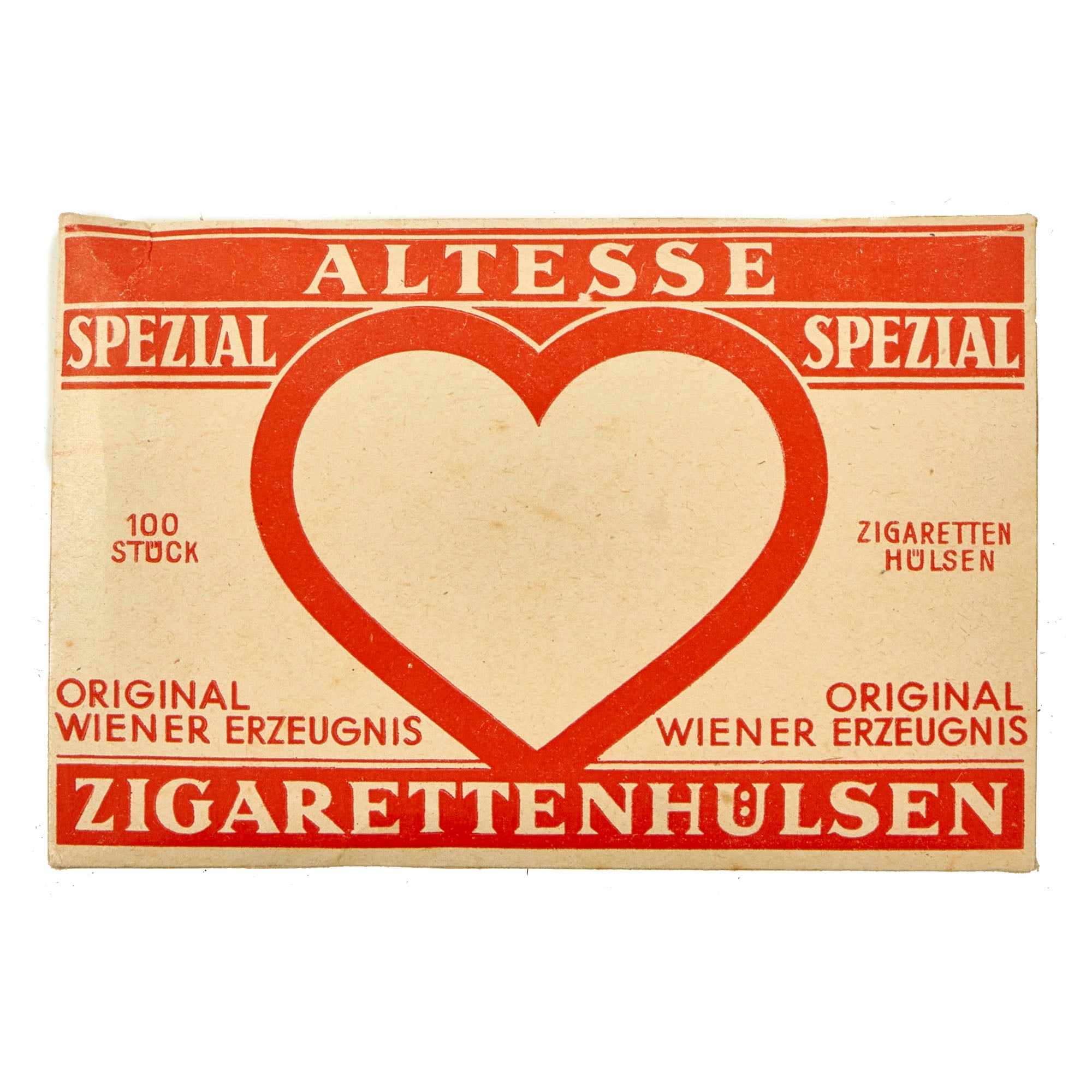 Original Items: Unissued. Straight from the crate! Or in this case, the original stamped and heavy paper packaging, which is marked Hier öffnen, or "Open here" on one end. The bottom of that end of the packaging shows a clear Reichsadler raised stamp, so these were most likely intended for military use, probably for officers. The boxes each contain 100 pre-rolled zigarettenhülsen (cigarette tubes), which have thicker paper at one end with "filter plugs" inside. These are nothing like modern filters, and look to just be small wads of paper that do not even go all the way across the tube.