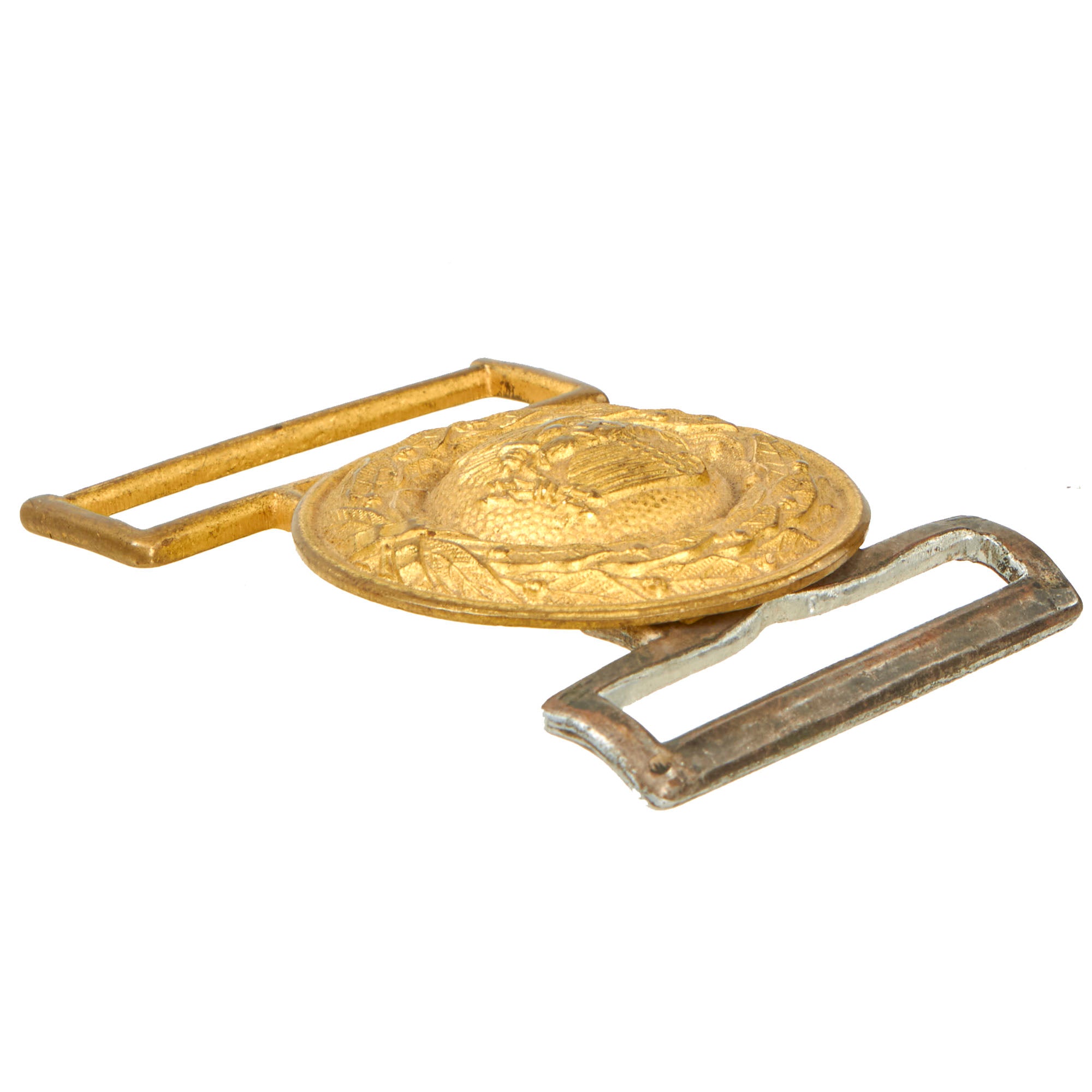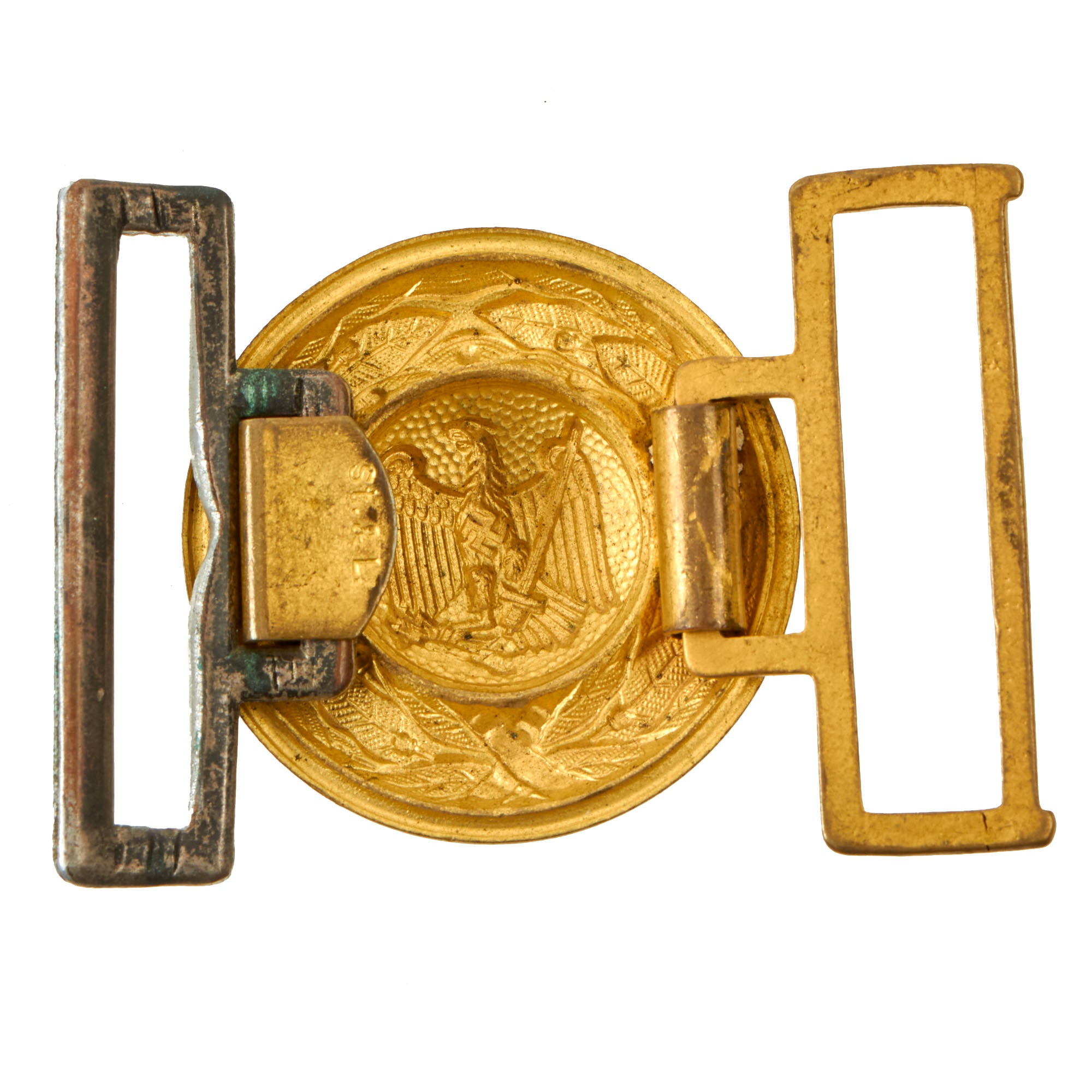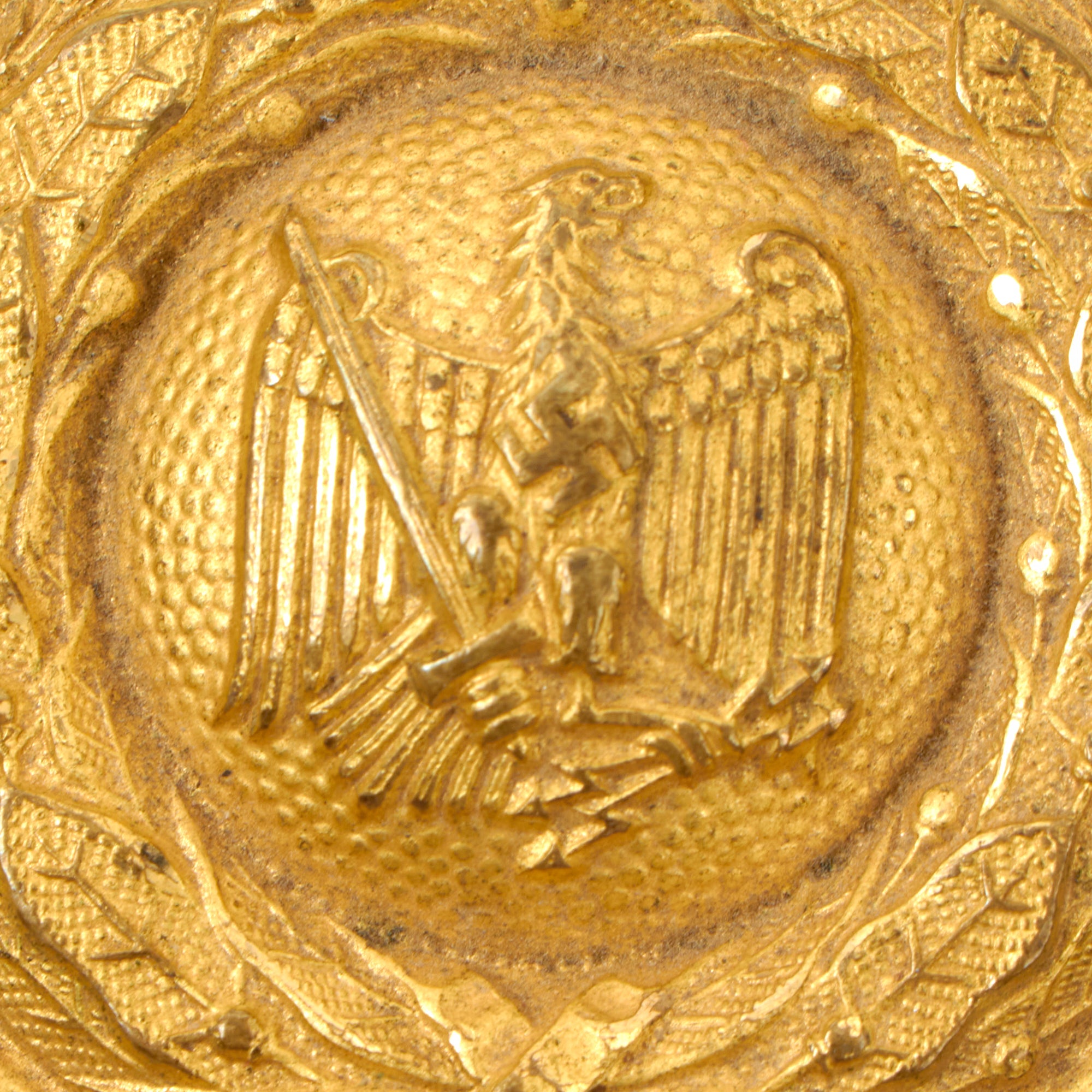 Original Item: Only One Available. This is a very nice lightly used example of a Prison (Penal) service officials belt buckle, constructed from gilt brass. The design features a round Lauren Leaf wreath with a bow at the bottom, with a police style NSDAP eagle in the center, holding a sword with one foot and lighting bolts with another. From what we can find out, this design was also used by the Prussian State forestry service for a while. The buckle was available in two colors, silver for Justice officials and gold for Prison Officials.