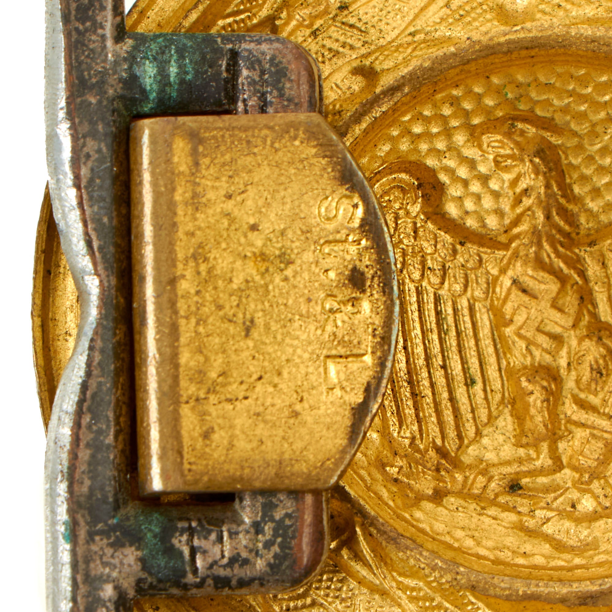 The buckle is marked on the back catch with St. & L. for Steinhauer & Lück of Lüdenscheid, a known manufacturer of these buckles. It is in very good condition, showing much of the original gilding, and only light wear. The left clasp end of this buckle is however from a different type of buckle, most likely a Justice official's belt, as it is silver.