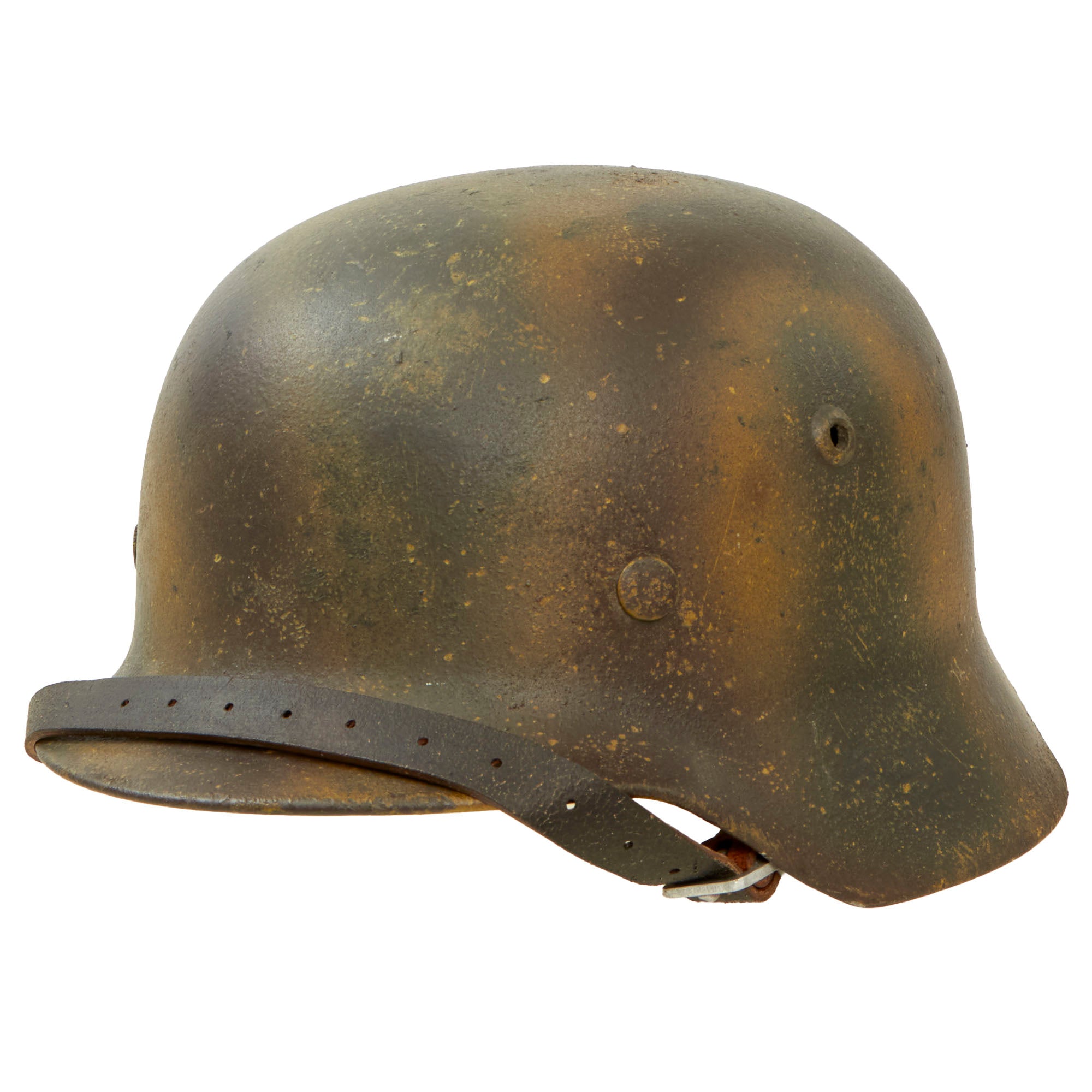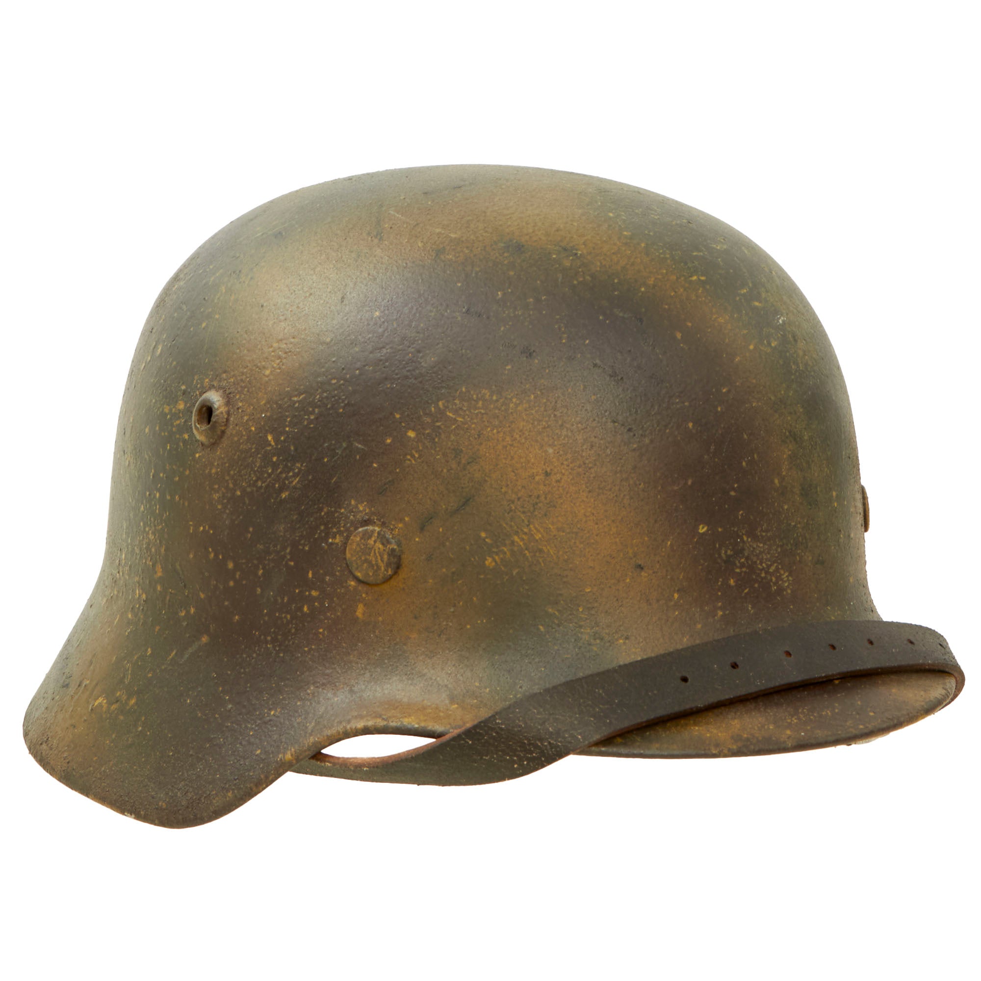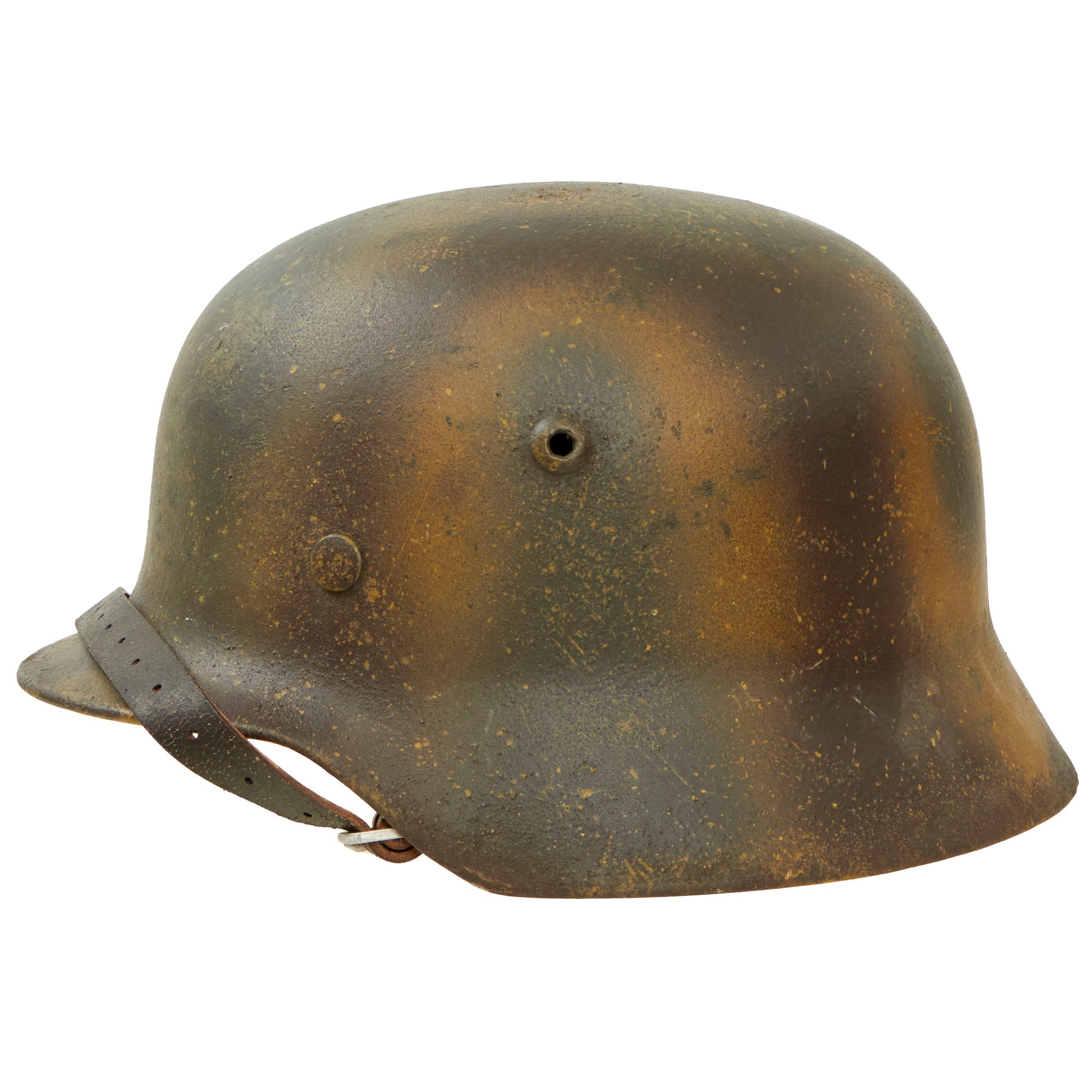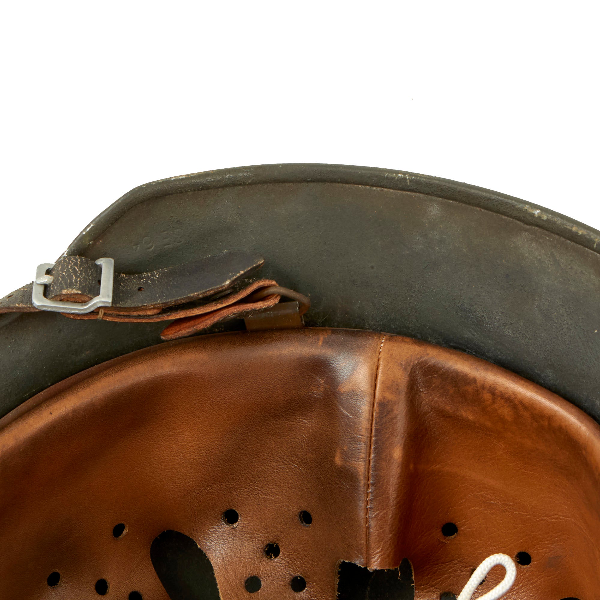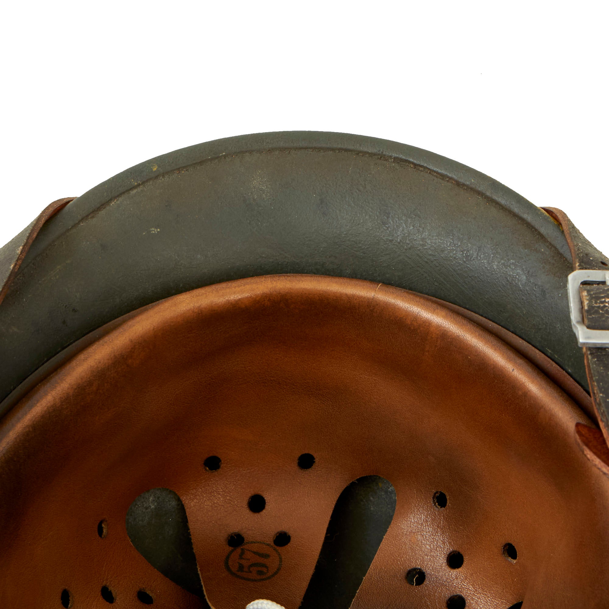 Original Item: Only One Available. Here we have a lovely example of an original German WWII M35 helmet shell, which was professionally refinished and fitted with a top quality Eastern European Liner and Chinstrap, most likely made in the Czech Republic or somewhere close by. The area became well known during the 20th century for its high quality reproduction and restorations of WWII helmets, and produced many high quality liners, chin straps, and split pins, which were sold all over the world. It looks like the liner was then aged to give it the look of a nice service used example.
