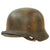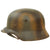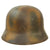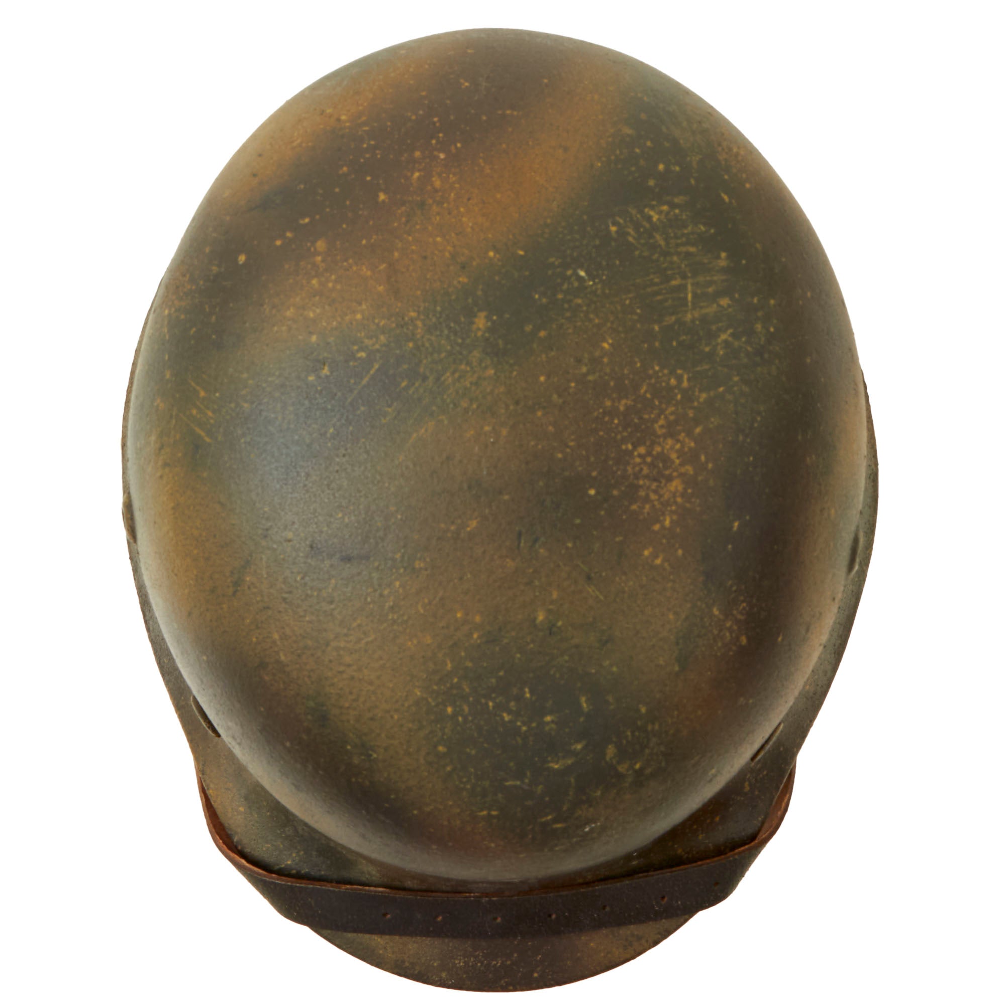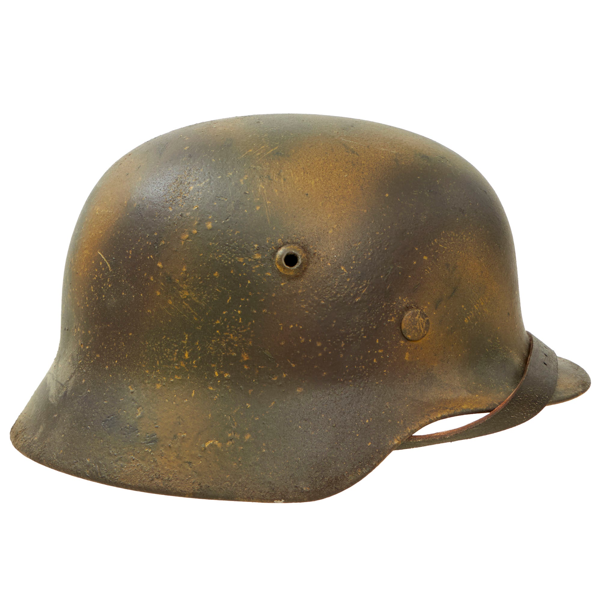 This helmet shell was stripped, and then repainted with the correct Panzergrau paint, with aluminum oxide texturing on the exterior side. Over this it then had a lovely brown and tan camouflage paint job applied, much like the patterns used in the autumn months as the foliage faded.