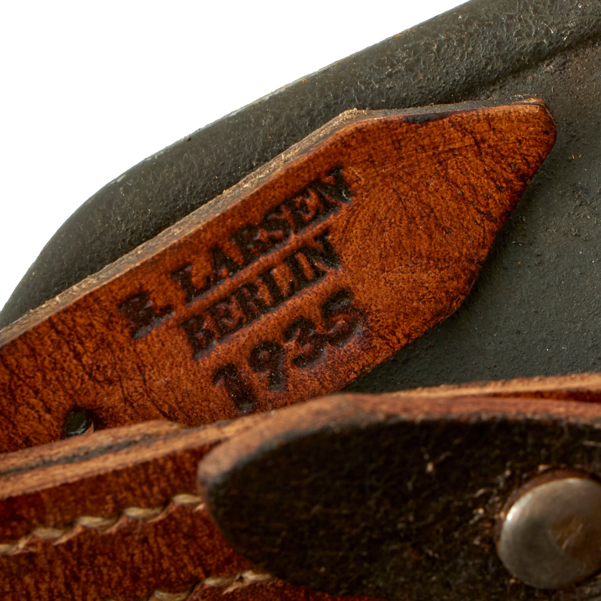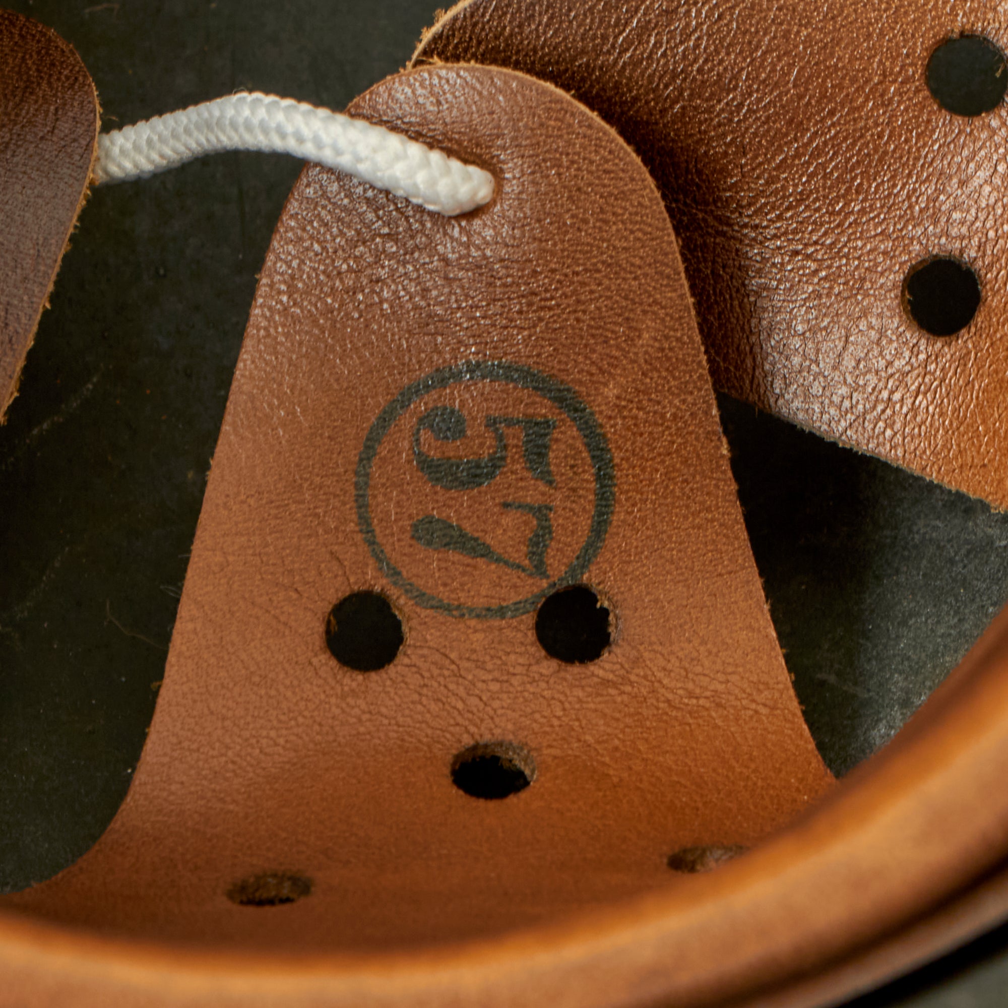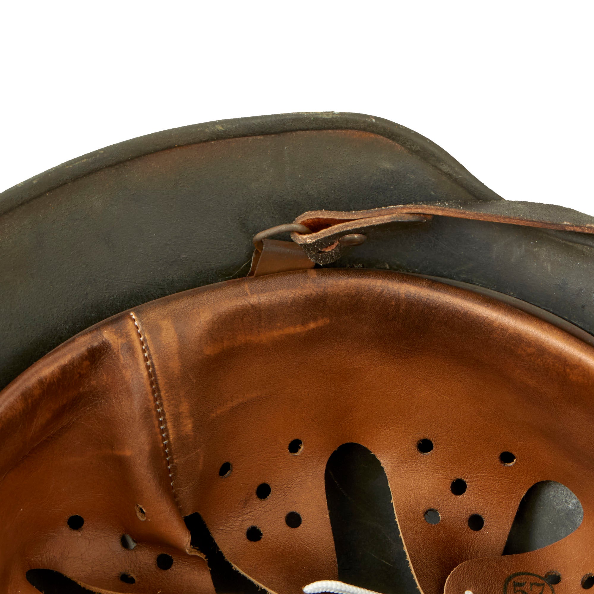 The replica M-31 liner has the correct 8 fingers, and is marked with size 57 on the leather. It has replicated markings on the liner band, which has been artificially oxidized, and the replica chinstrap is marked as well. Both are in very good shape, though there definitely is some wear to the chin strap.