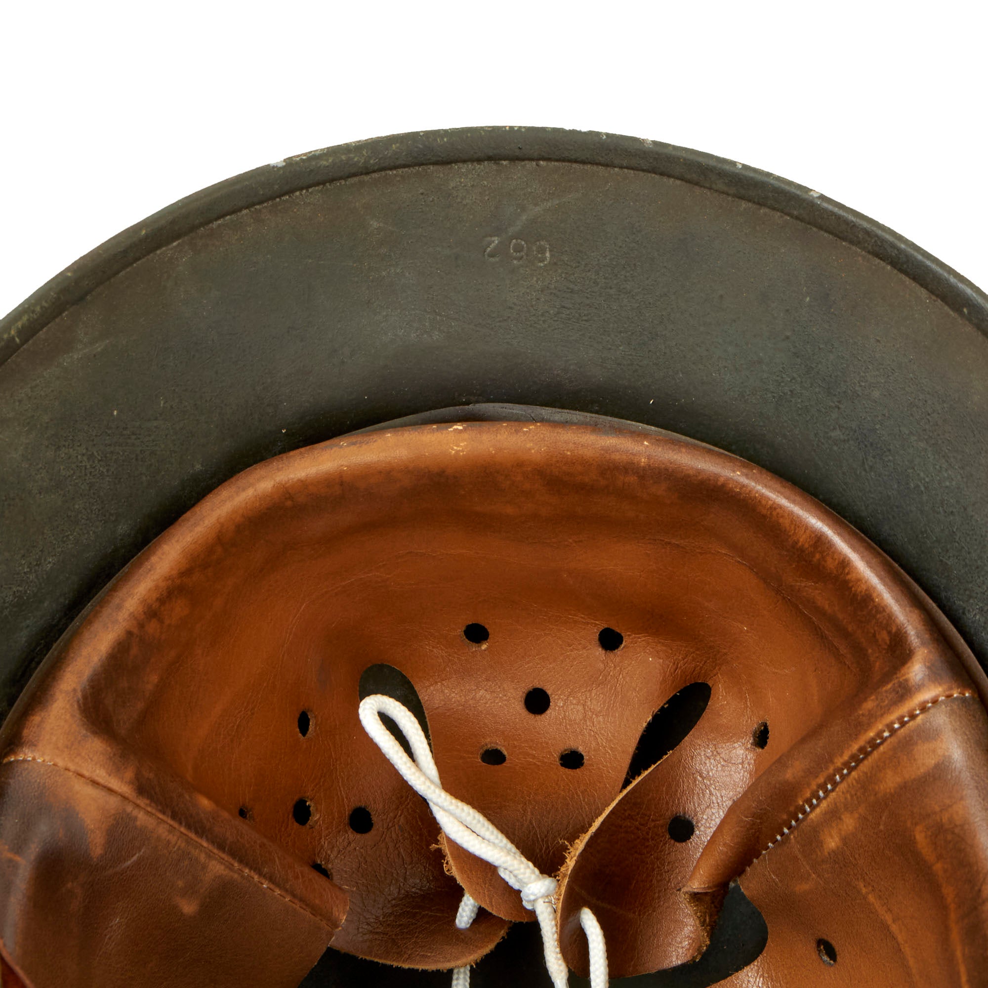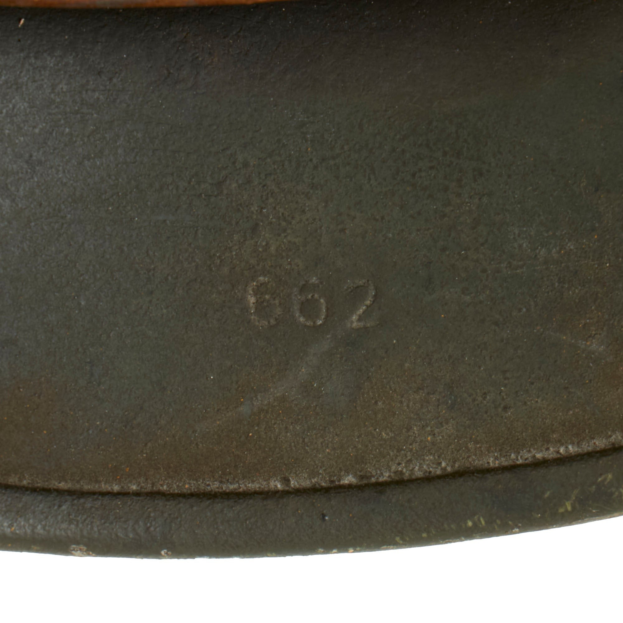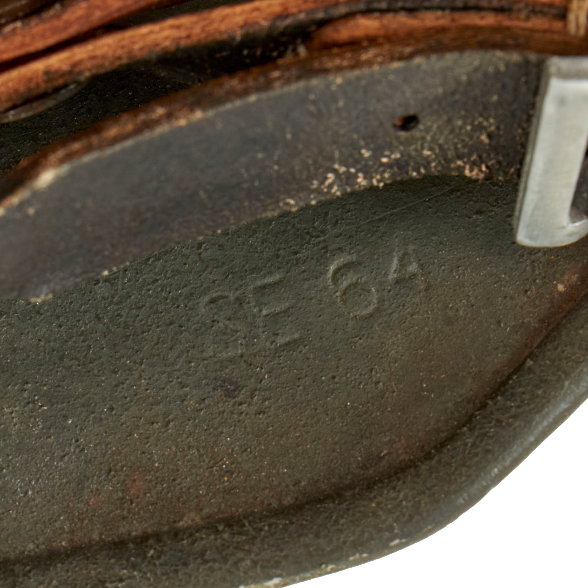 The reverse, interior, neck guard apron is serial number stamped 662 and the interior, left side, apron has the stamped manufacturer's code and size, SE64 indicating that it was manufactured by Sächsische Emaillier und Stanzwerke A.G. of Lauter, Germany. This is a very low lot number, correct for an M35 helmet. Size 64 is a nice medium size that can accommodate liners from 56cm to 57cm or US 7 to 7 1/8. Size 64 shells are harder to find and are therefore more valuable to a collector.