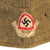 This example is constructed of "earth brown" wool, with a white canvas lining and gray finished leather sweatband around the circumference. Under this are some faded markings, which we unfortunately are not able to read. The front features a fine BeVO- style machine embroidered RAD shovelhead insignia, which has a canted Swas (hook cross) in the middle, with 2 sheaves of wheat extending from the bottom at 45 degree angles. As there is no black piping on the top of the "scallop", it is a post-1940 made example.