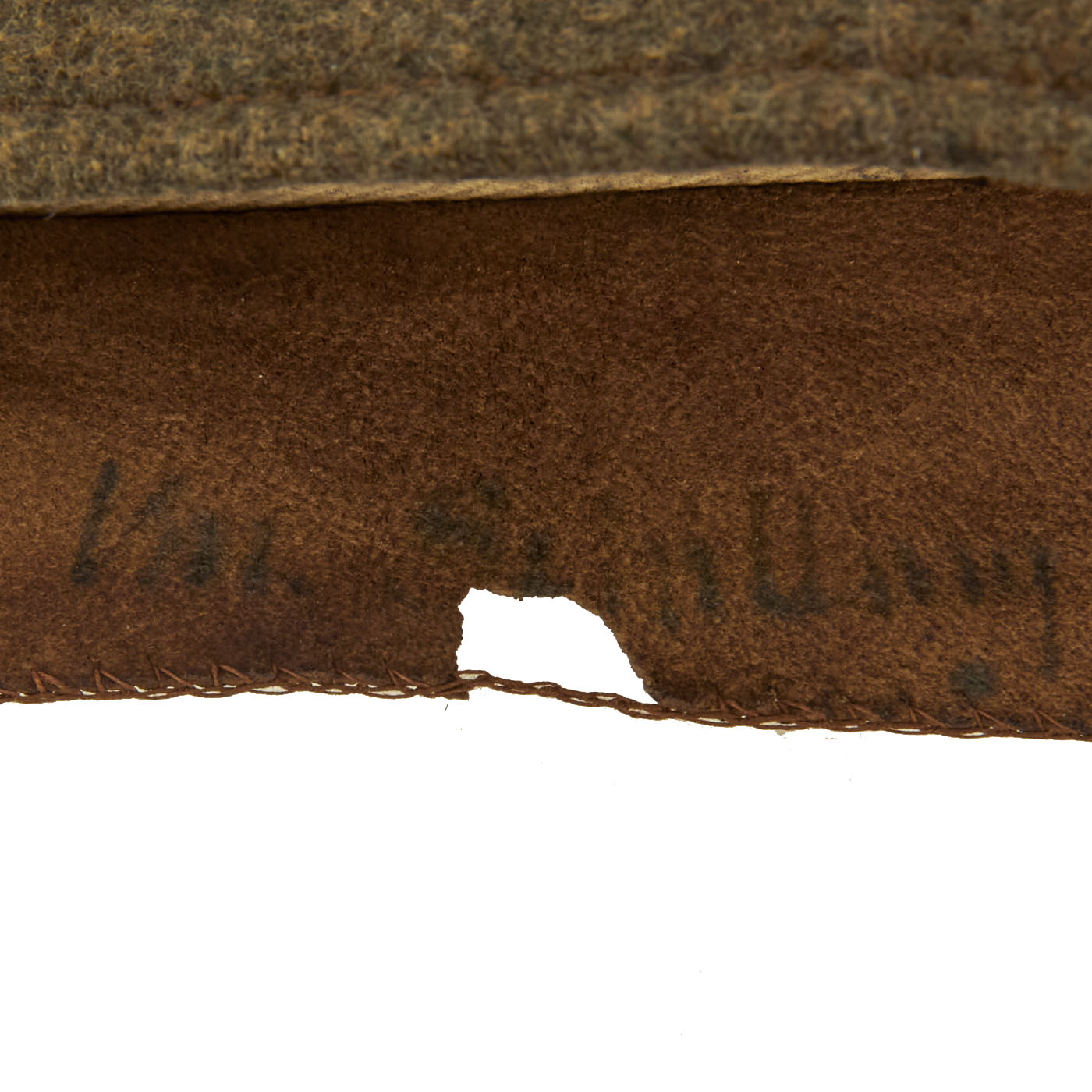 Condition of this cap is good, showing wear from service and use, which gives it a fantastic "been there" look. There are some small tears on the exterior, as well as some scattered moth holes on both sides. Most of the fuzzy "nap" is still present on the exterior. The interior shows a bit more wear, with staining to the lining, and the finish has been mostly worn off the sweatband. There also is some rust staining from the grommets.