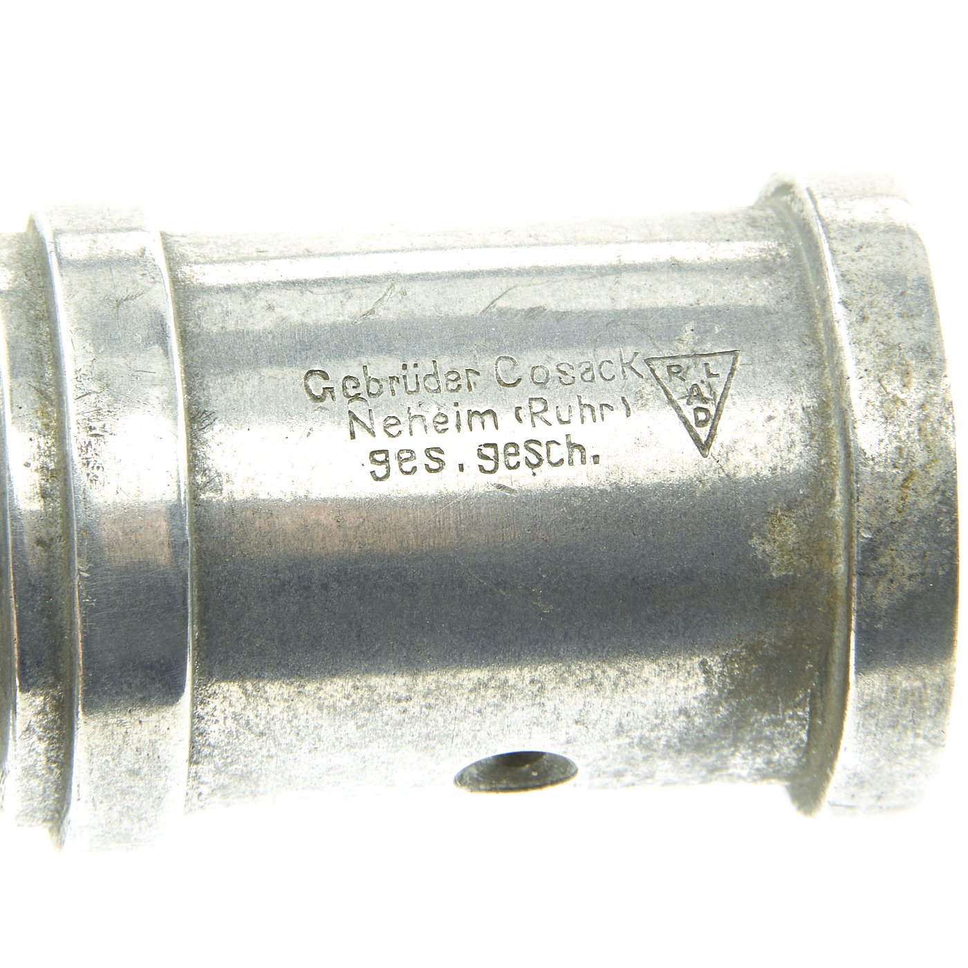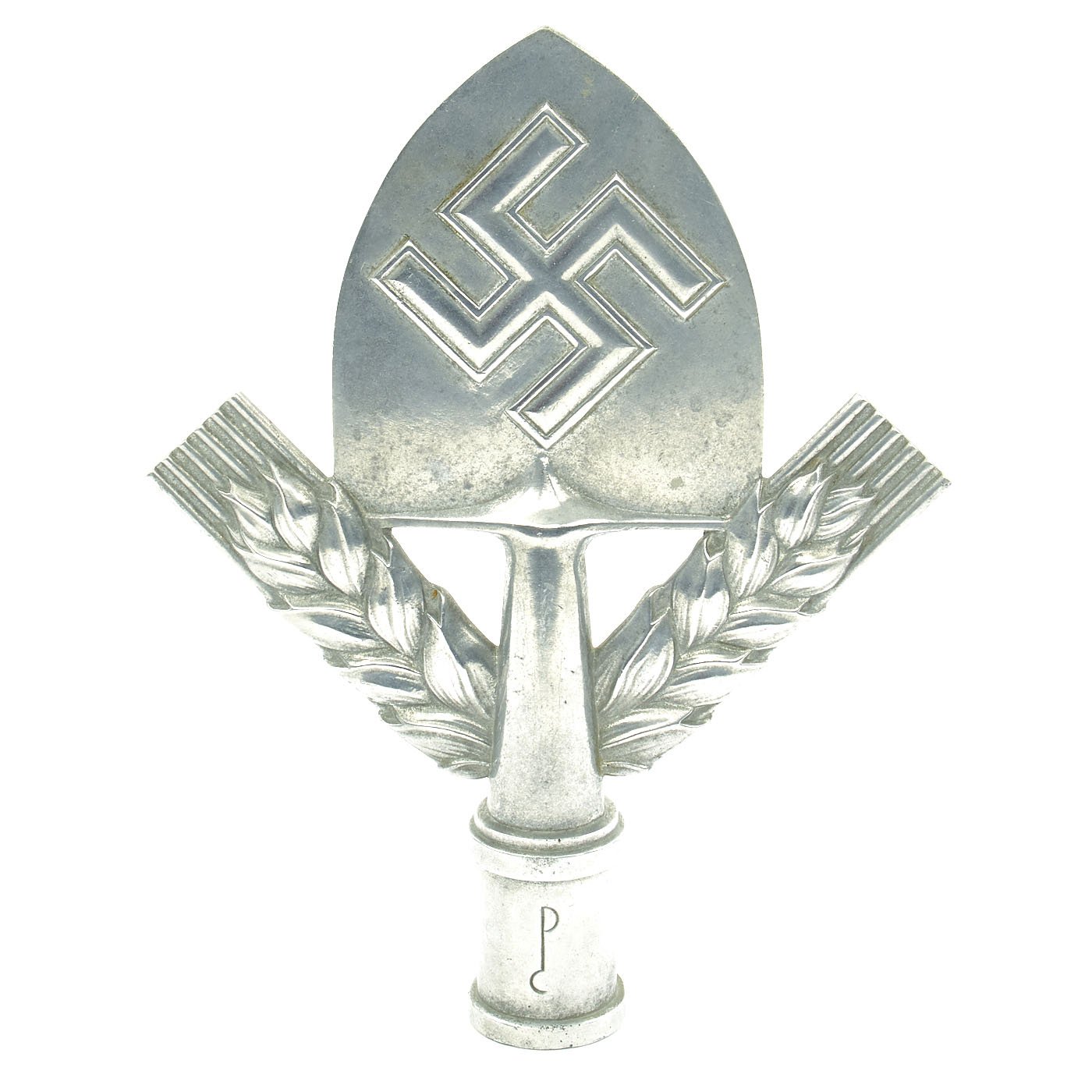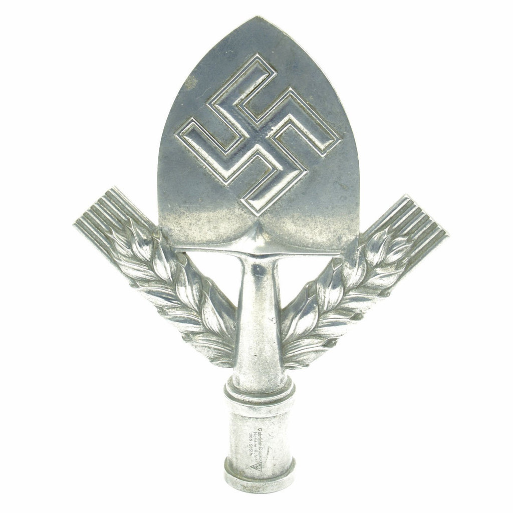Original Item: Only One Available. This is a very nice WWII German Reichsarbeitsdienst (RAD - National Labor Service) Aluminum Flag Pole Finial or Topper (Fahnenstange Endstück). The RAD logo is a shovelhead, which has a canted Swas (Swas) in the middle, with two sheaves of wheat extending from the bottom at 45 degree angles. The finial is made of cast aluminum, and is maker marked on the socket: