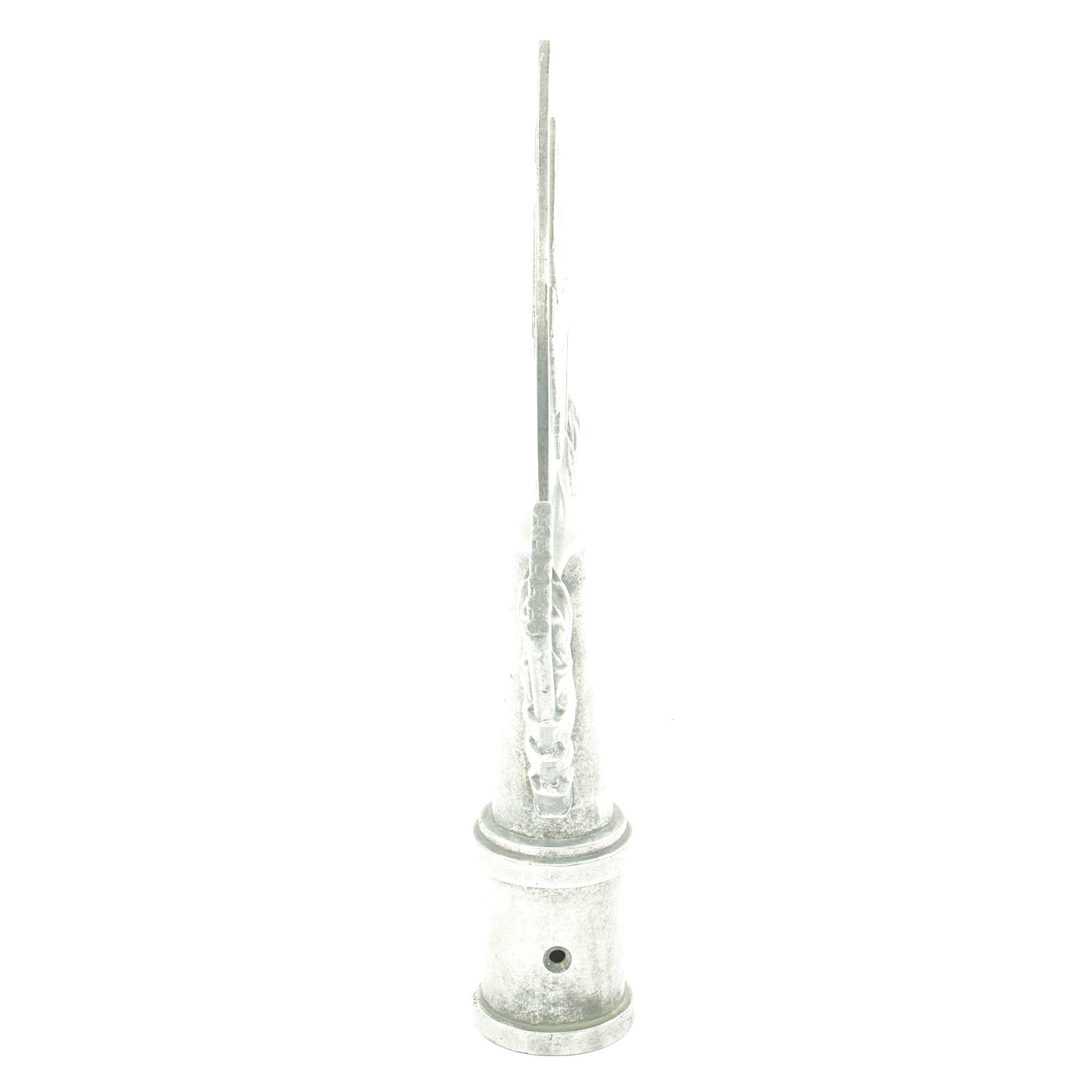 The last line is short for Gesetzlich Geschutzt (Protected By Law), indicating that the pole finial was a trademarked design. Next to the markings is the RAD arsenal mark in a triangle. It measures 12 1/8 inches tall, and is 9 1/4 inches wide at the tips of the wheat sheaves. There is some slight oxidation and wear, from the pole finial running into things, but it has a great aged aluminum patina.