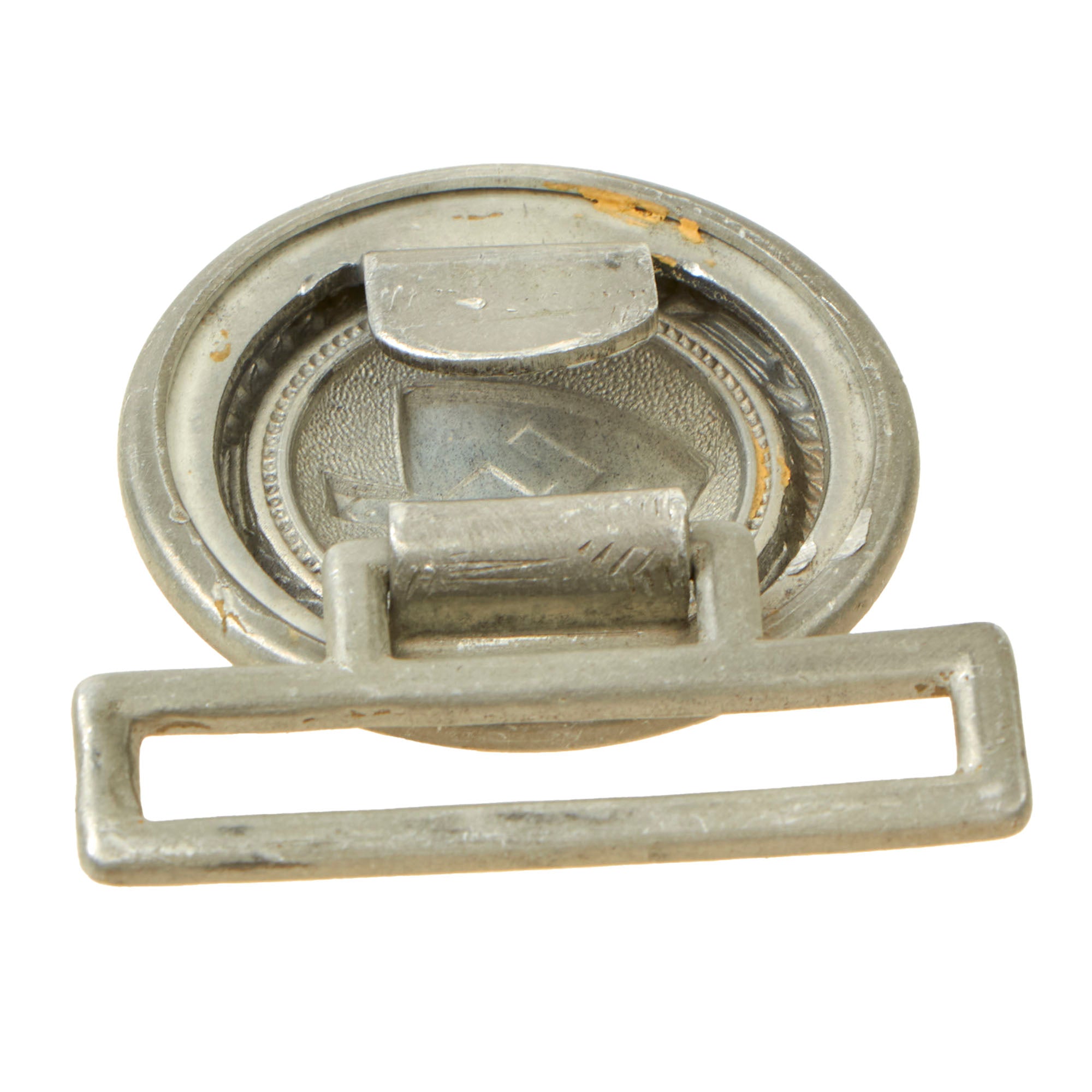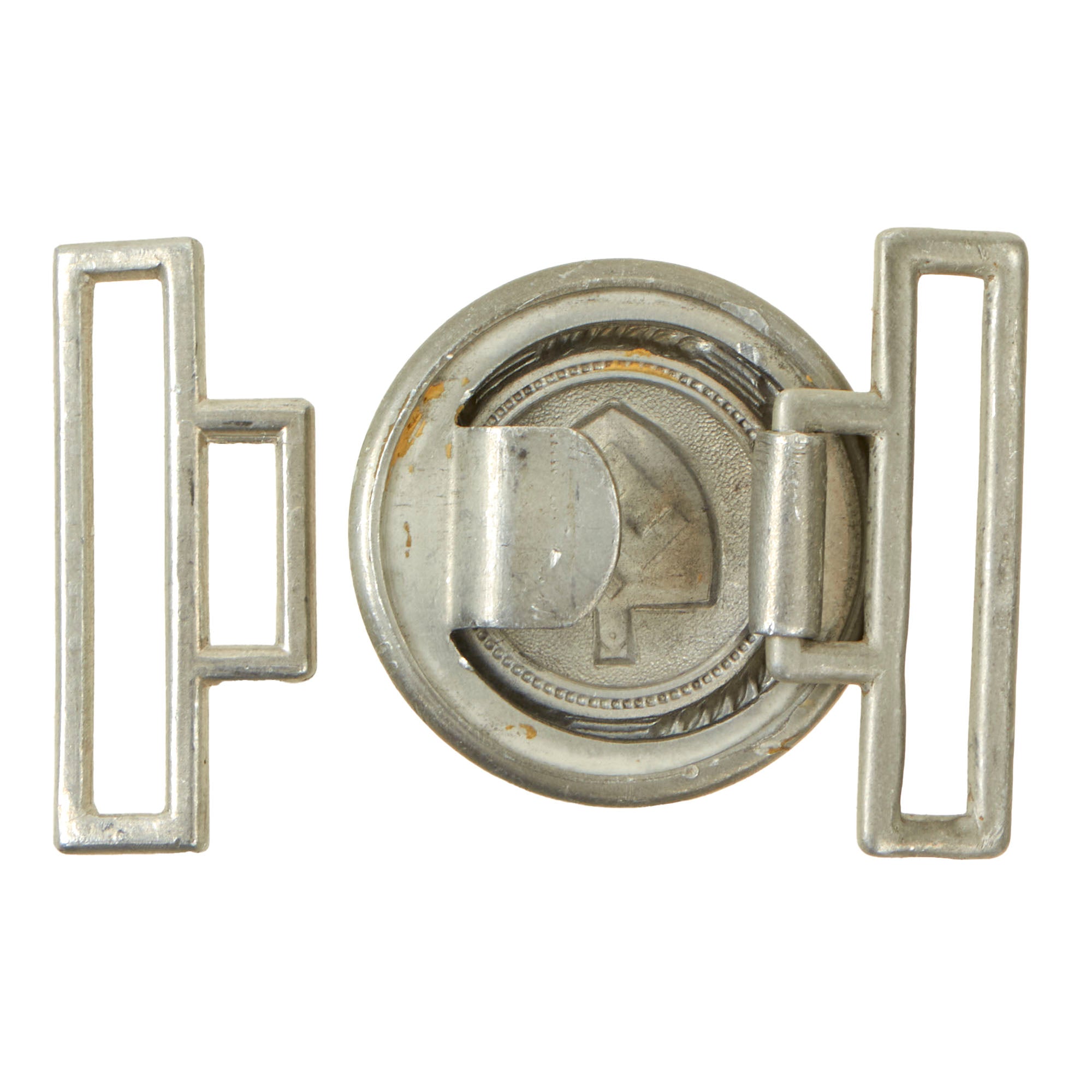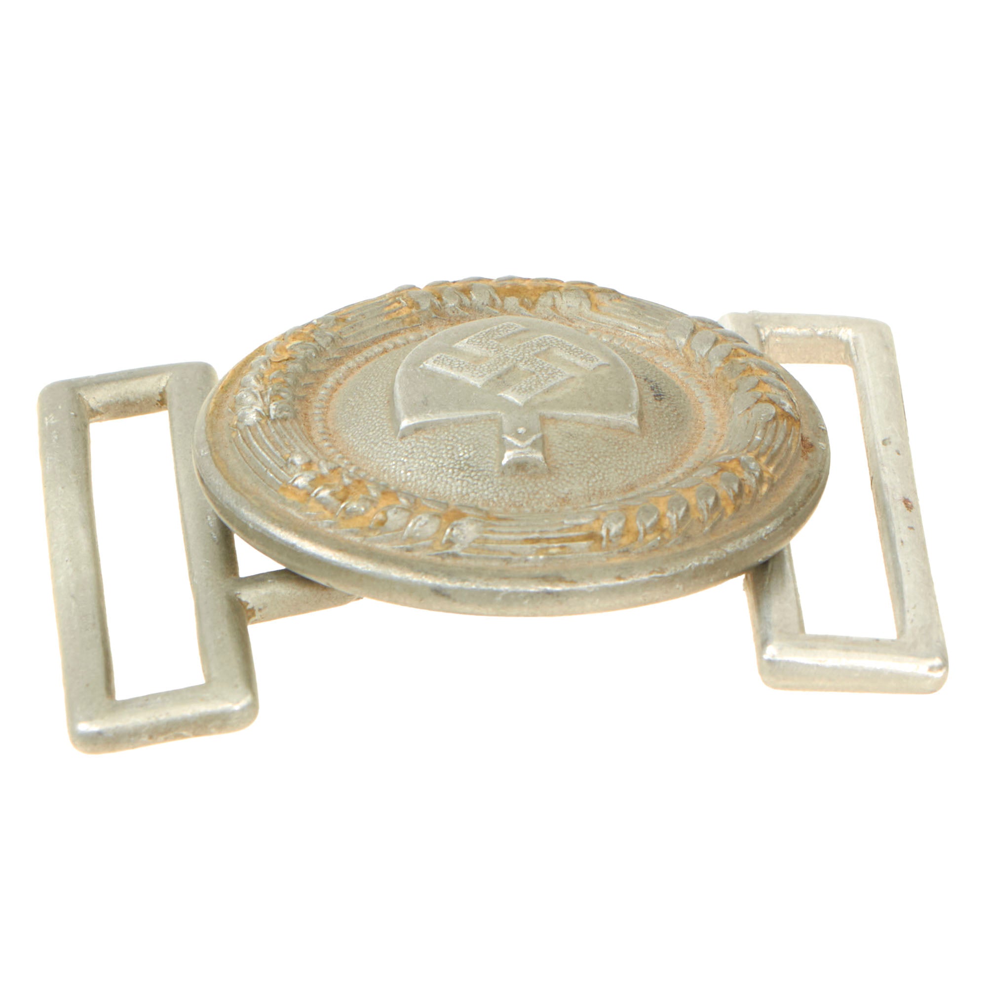 Original Item: Only One Available. This is a very nice example of a WWII German Reichsarbeitsdienst Gürtelschnalle für Leiter, or National Labor Service Belt Buckle for Leaders. It is a stamped, two piece aluminum circular buckle measuring 47mm in diameter, and features five highly embossed sheaves of wheat encompassing an embossed inverted spade head with high relief canted swas hook cross) on a finely pebbled, domed central field. The reverse of the buckle has crimped outer edges and a separate circular plate insert with crimped on double loop and retaining hook. This attaches to the included second double loop, which originally would have been on the other end of the belt.