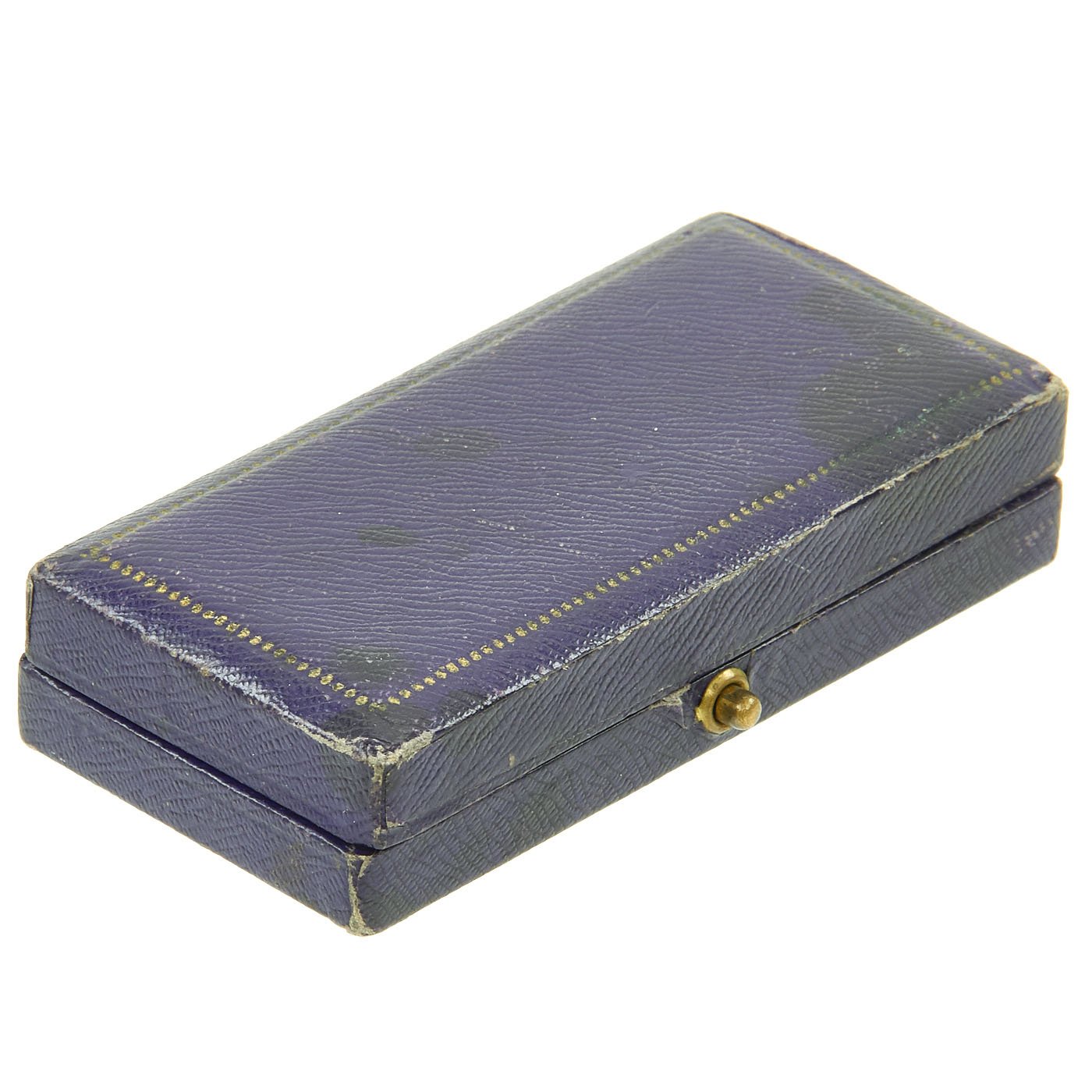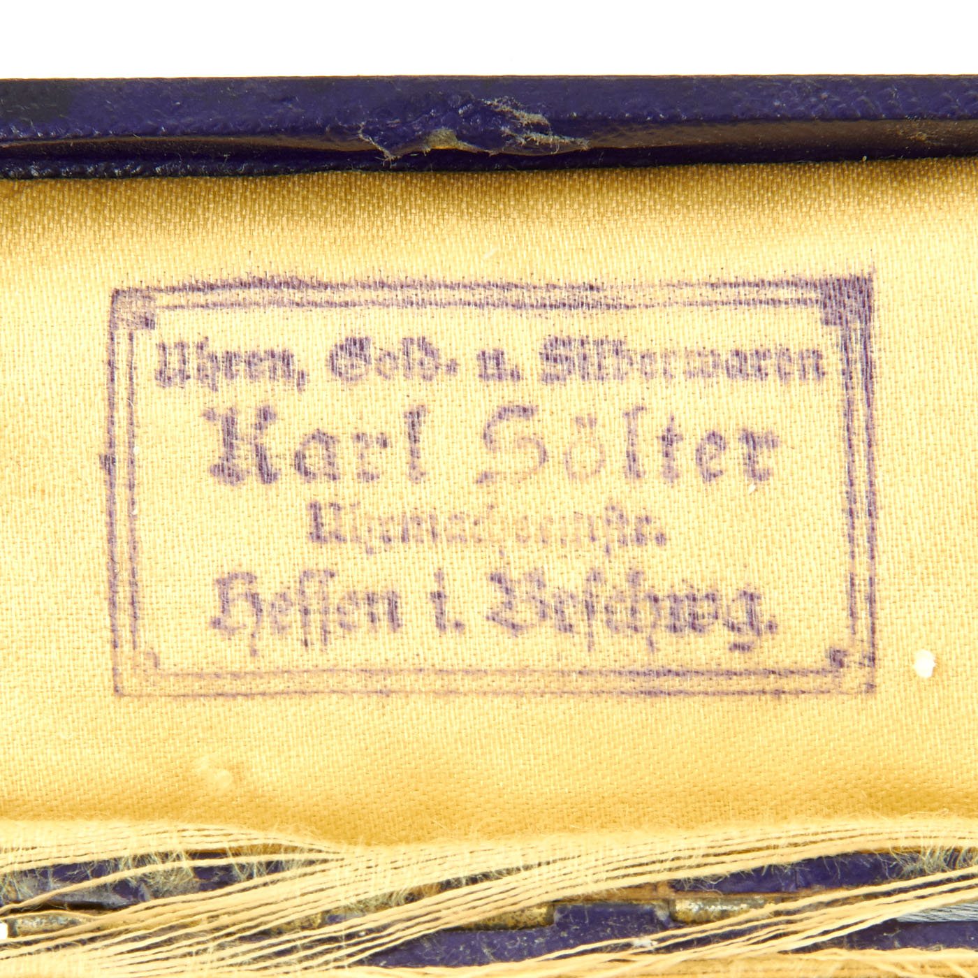 Both of these are contained in a very nice case, which is marked by retailer Karl Sölter on the inside of the top. It has a lovely faux leather exterior, and a functional brass closure catch and read brass hinge. The interior is yellow velvet on the bottom, with satin on the inside of the lid.