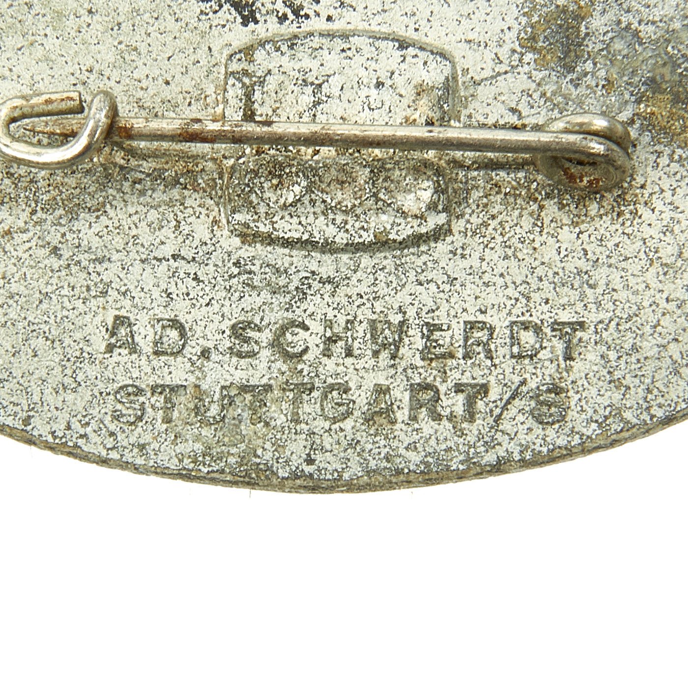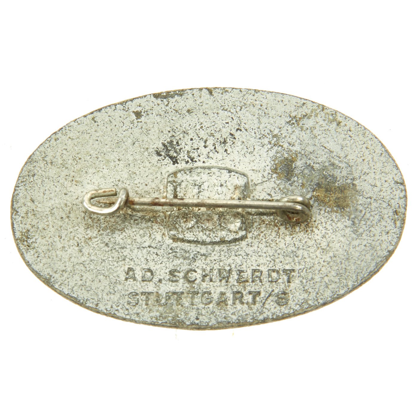 This roughly translates to "performance competition winning group JM sub-group 440." The award is silvered zinc or tombak, and measures about 1 7/8" x 1 1/8", and is maker marked on the back by A.D. SCHWERDT of STUTTGART/S. The back still has a good amount of silvering, however the front is mostly faded. There is a nice safety pin attachment on the back.