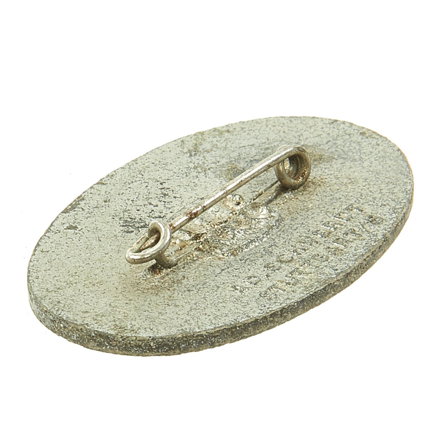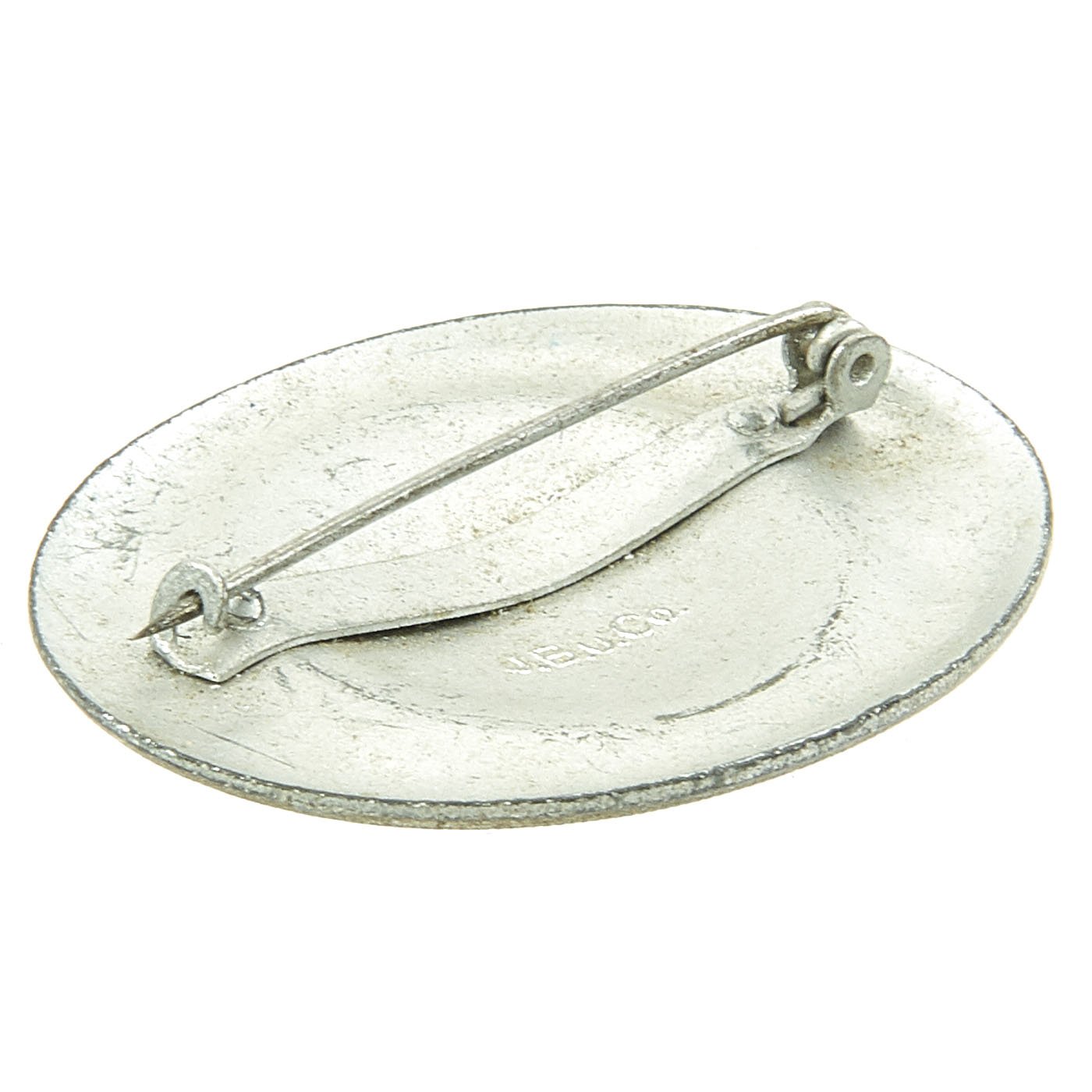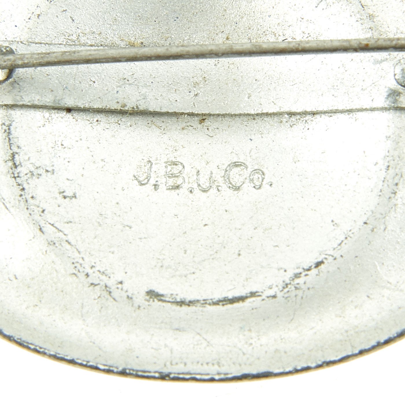 The brooch is in very good condition, and has at the center the RAD logo, with the Swas (Swas or Hook Cross) above two sheaves of wheat. Around the edge are some decorative spirals, and overall it has a lovely patina. The back shows a lot of the original silver paint, and has a very nice condition safety pin style attachment. It is maker marked with J.B.u.Co., which is unfortunately an unknown maker, seen on many other examples of this brooch. It measures about 1 3/4" x 1 1/4"
