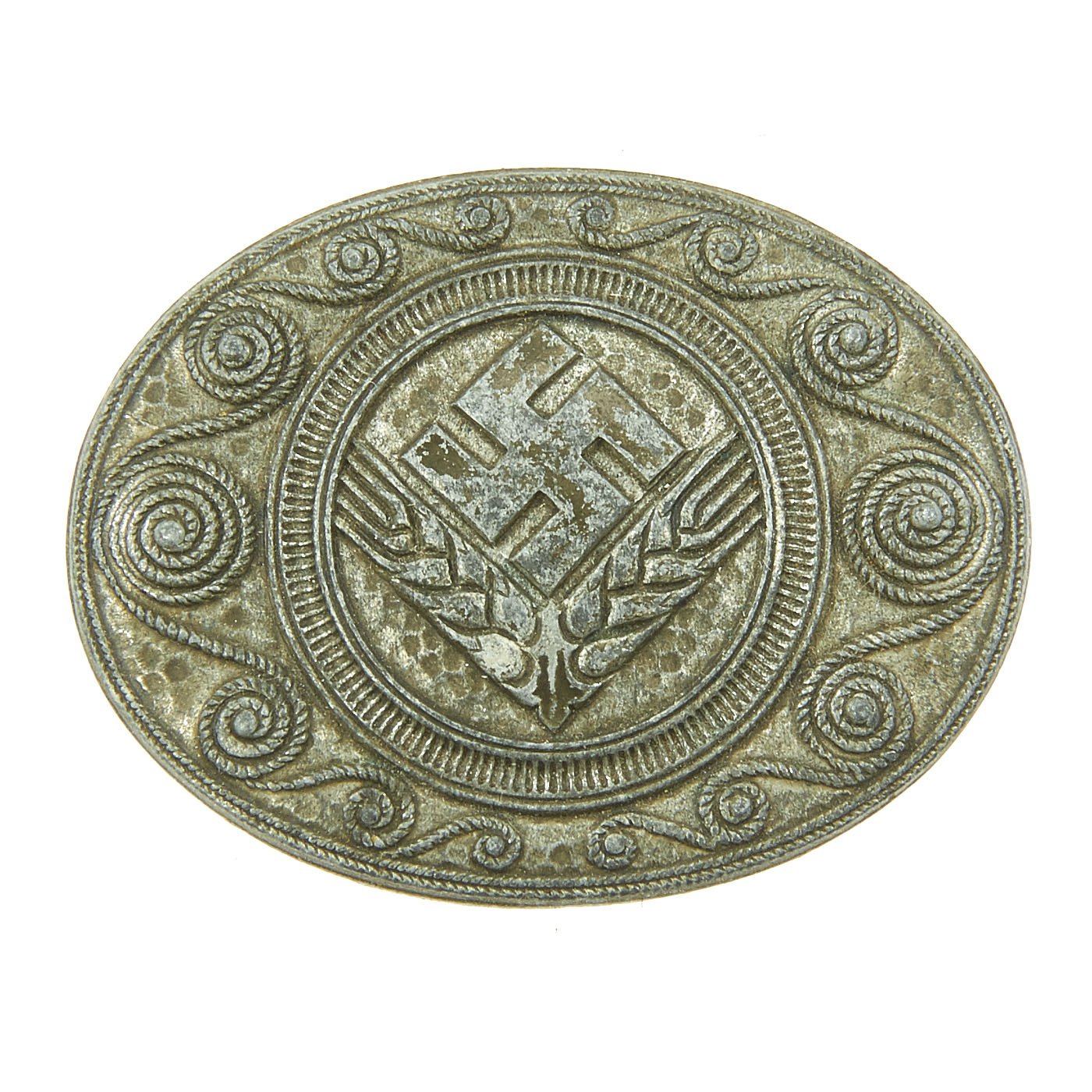 Original Item: Only One Available. This is an excellent condition German WWII Young Women's Reich Labor Service (Reichsarbeitsdienst der weiblichen Jugend - RAD/wJ) brooch, along with a 1938 dated Competition award, contained in an original case. NSDAP Germany had a multitude of different organizations, and competitions were often arranged to help further indoctrinate their members.