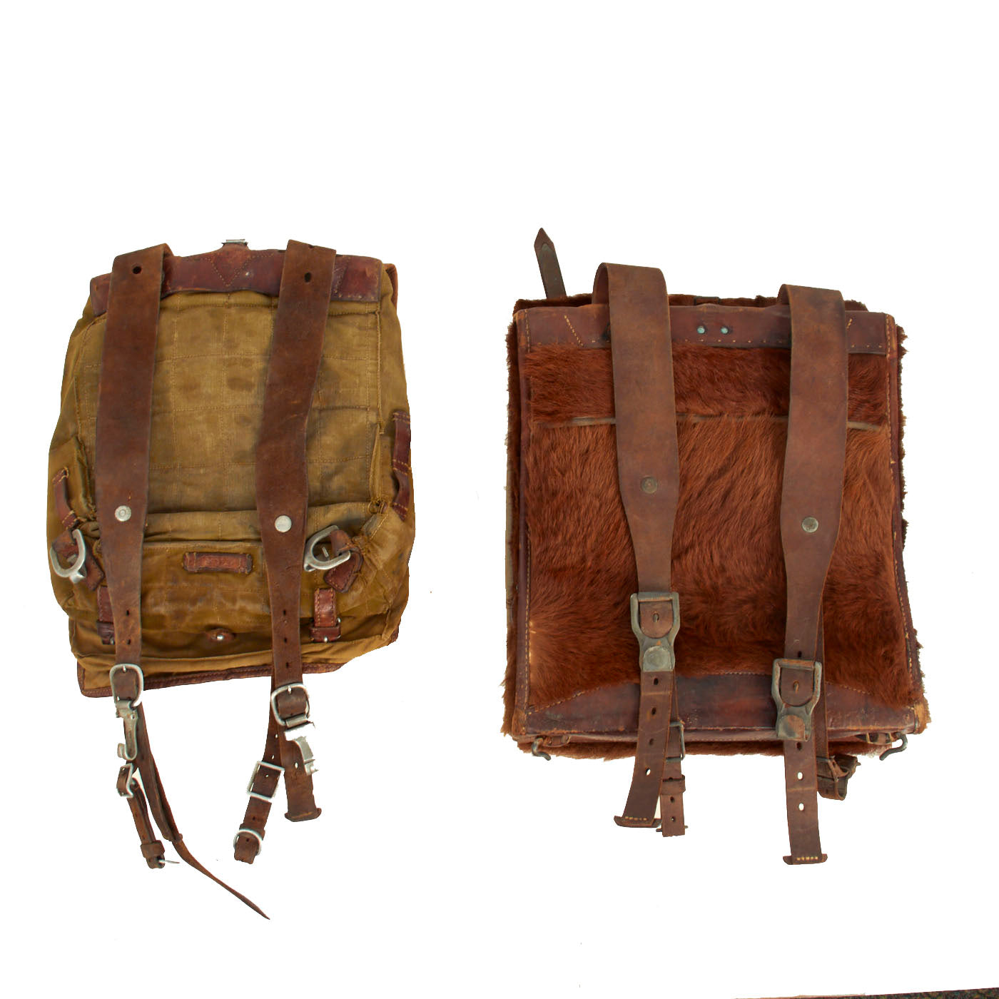 Original Items: Only One Lot of 2 Available. These cowhide-covered rucksacks were known as the Tornister 34 (developed in 1934) and was later fitted with new style straps in 1939. As the war progressed the design was simplified for economical and practical reasons so the cowhide cover was eliminated making these packs especially scarce on today's collector market.
