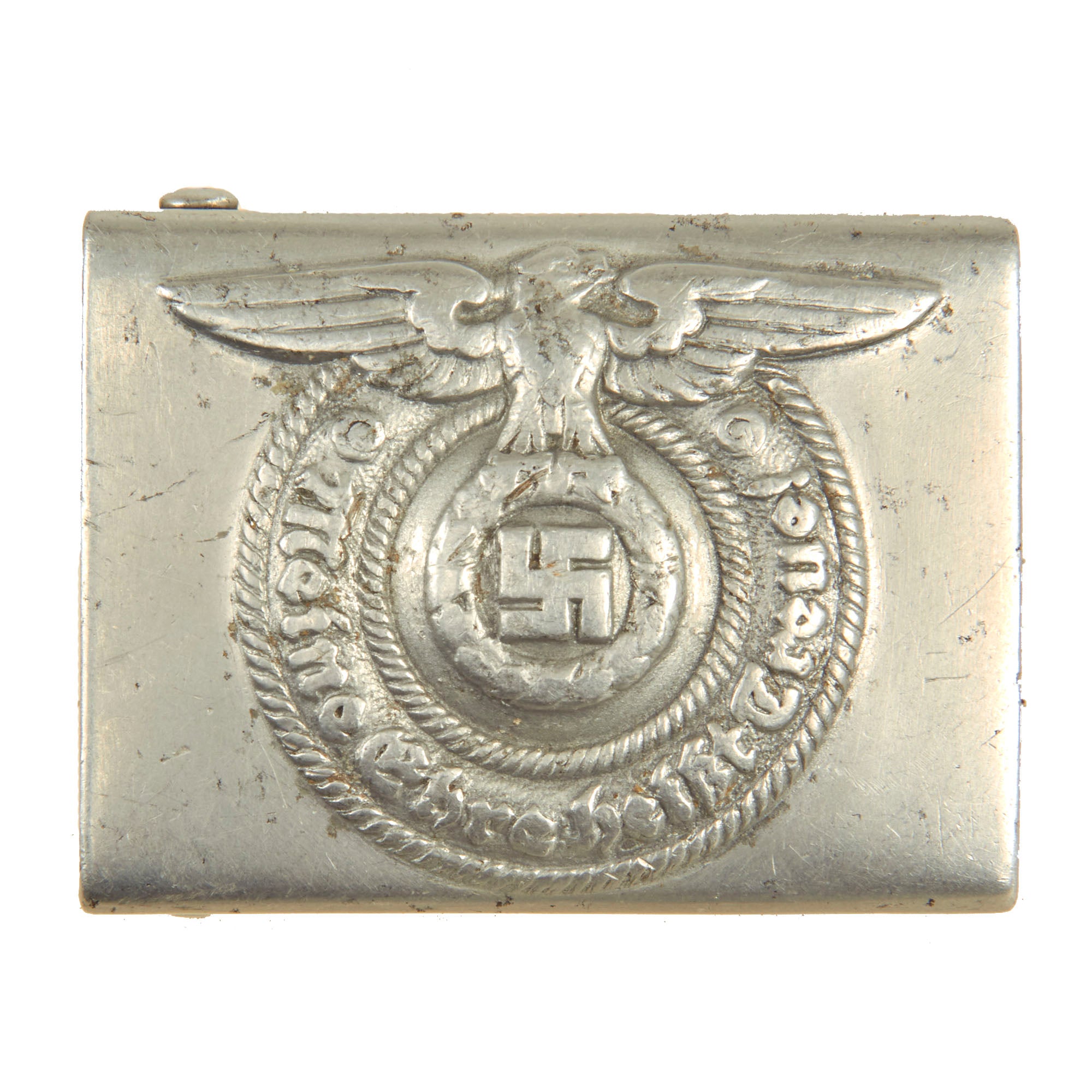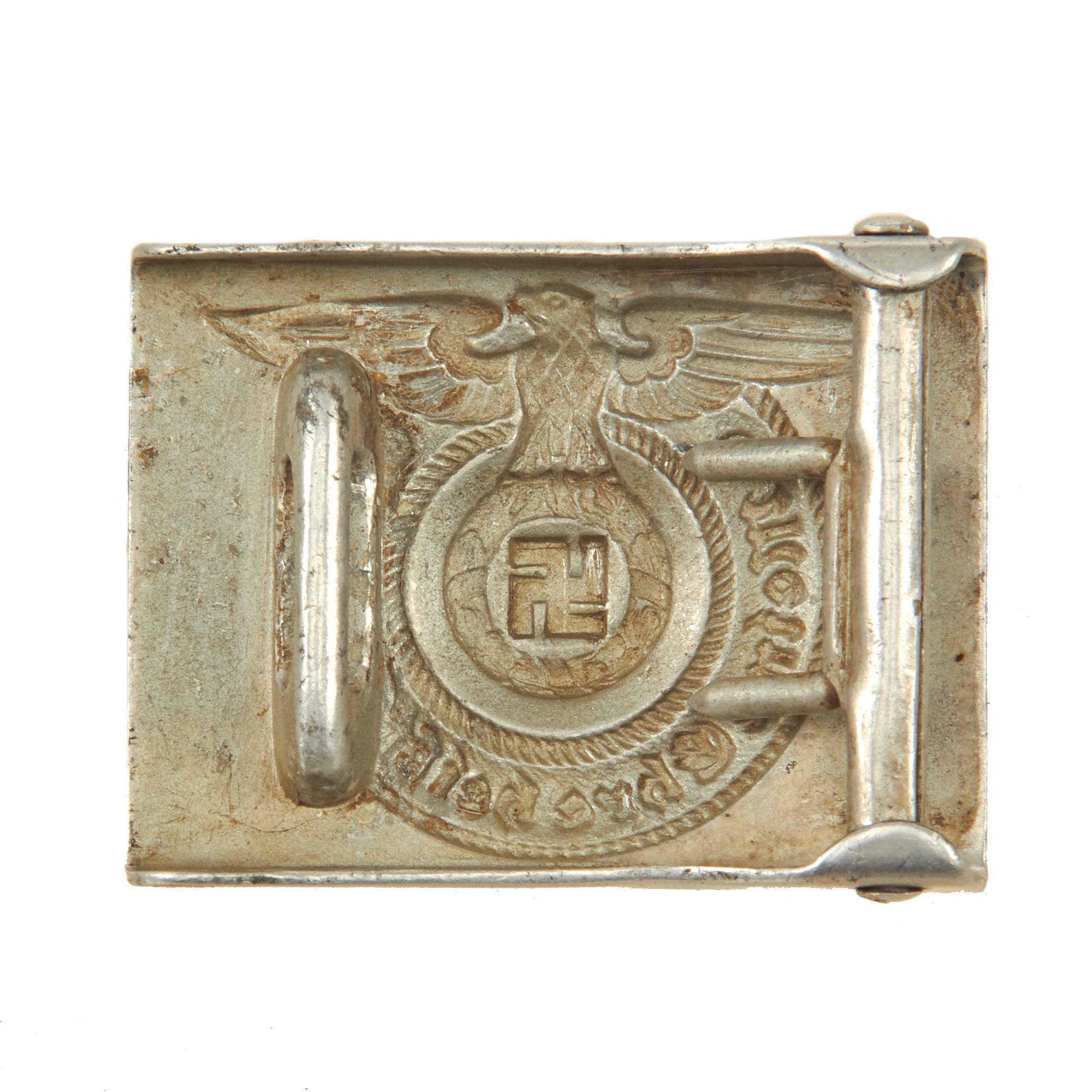 Box belt buckle features a smooth, outer field with a high relief, embossed, central motif pattern consisting of an SS style national eagle with out-stretched wings, clutching a wreath, encompassing a static swas. The swas and wreath are in turn encompassed by a circular, simulated, twisted rope border with the Gothic script motto, Meine Ehre heißt Treue!, (My Honor is Loyalty!). The script is situated on a subtly textured background field and is encircled by the inner and the outer simulated twisted rope borders. The reverse of the buckle is a mirror image of the obverse and the cast buckle catch, prong bar and prongs are all intact. We have checked it with a magnet, and no part of this buckle is magnetic.
