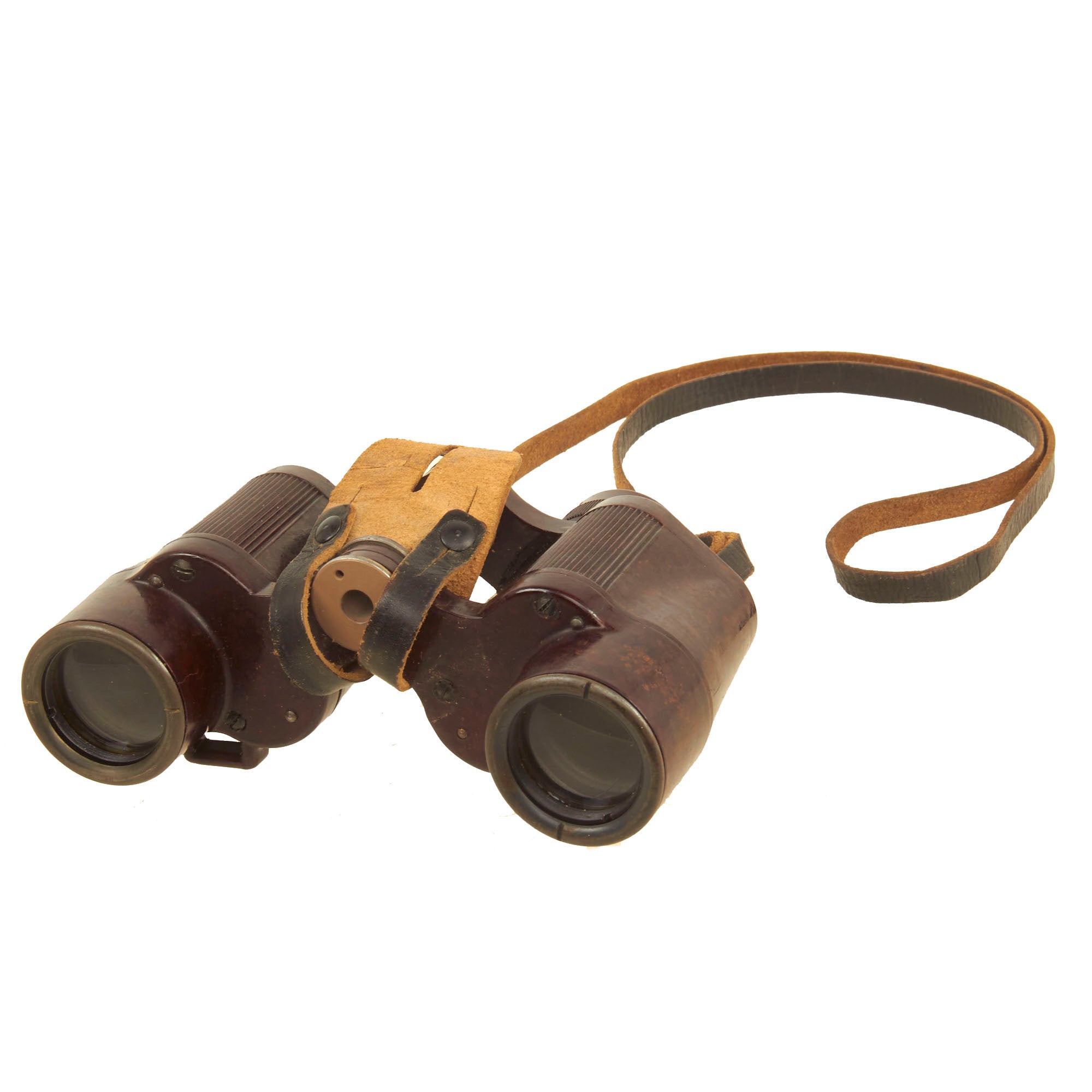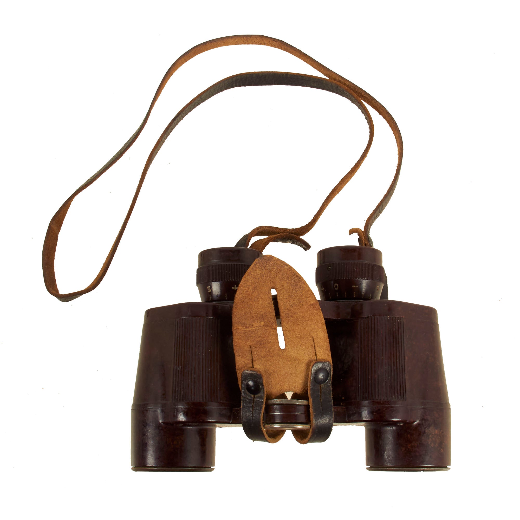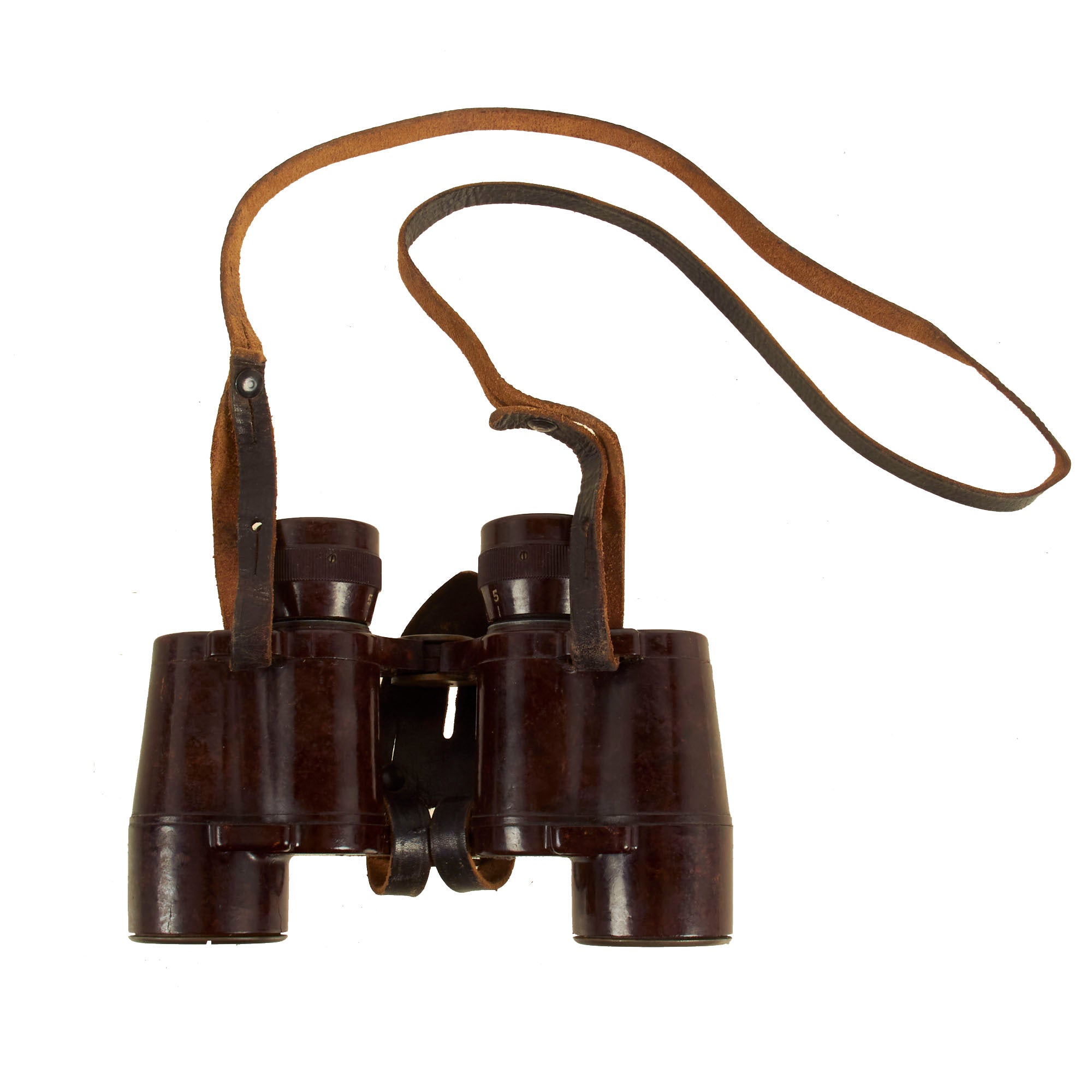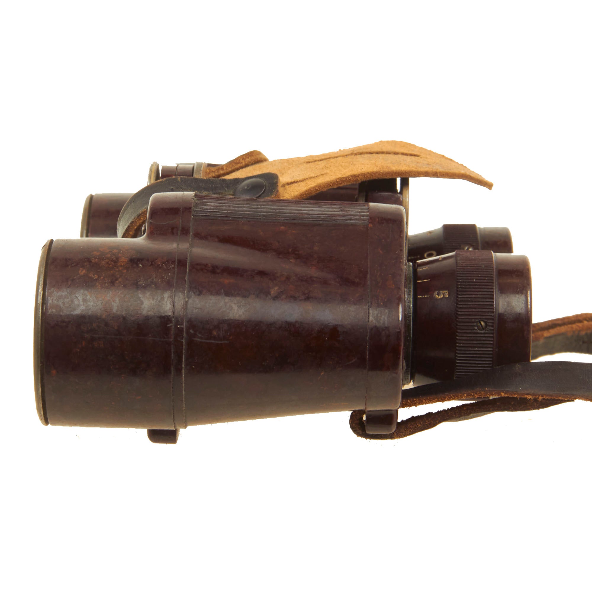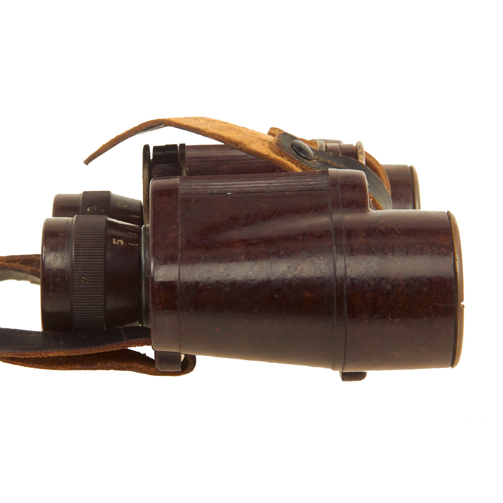 Original Item: Only One Available. Now this was a fantastic and rare find! This is a beautiful set of late war produced red bakelite 6x30 binoculars. These are very seldom encountered fully intact and functional as bakelite does not age well, becoming very brittle. While these aren’t the rarest type of binoculars that were produced by Germany during WWII, it still makes its way onto the list.