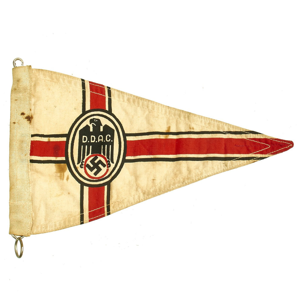 This is a very nice example of a D.D.A.C. Vehicle Wimpel (Pennant), which would be flown on a small staff attached to the fender of the automobile or other vehicle it was attached to. The pennant measures 10 1/2 inches by 6 1/4 inches and is double sided. It displays the D.D.A.C. emblem in a central oval, at the intersection of a white and red 'Balkan Cross'. The field of the pennant is white, though age and staining have turned it more of a beige color. Like most, this example is dyed, made from two pieces of cloth sewn together.