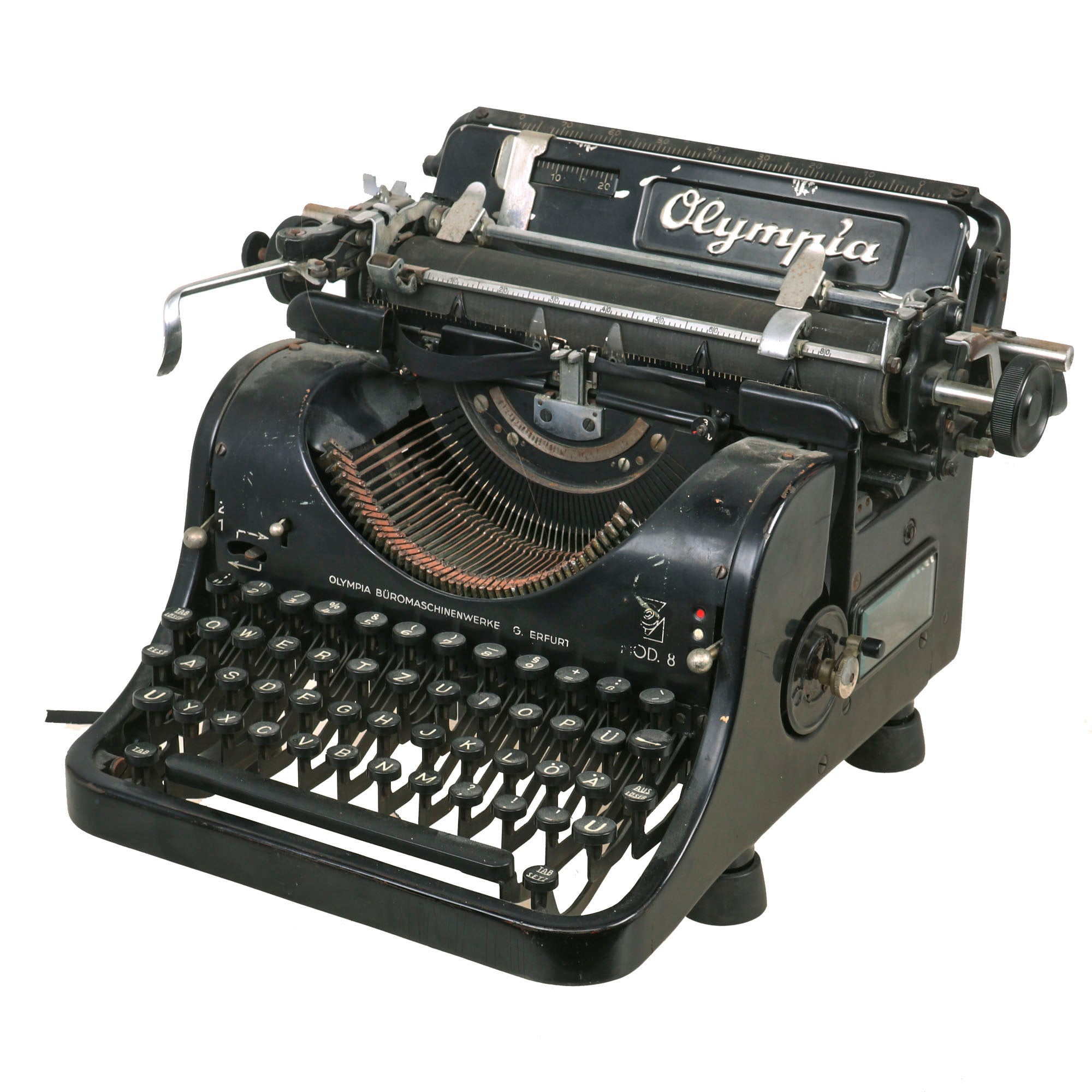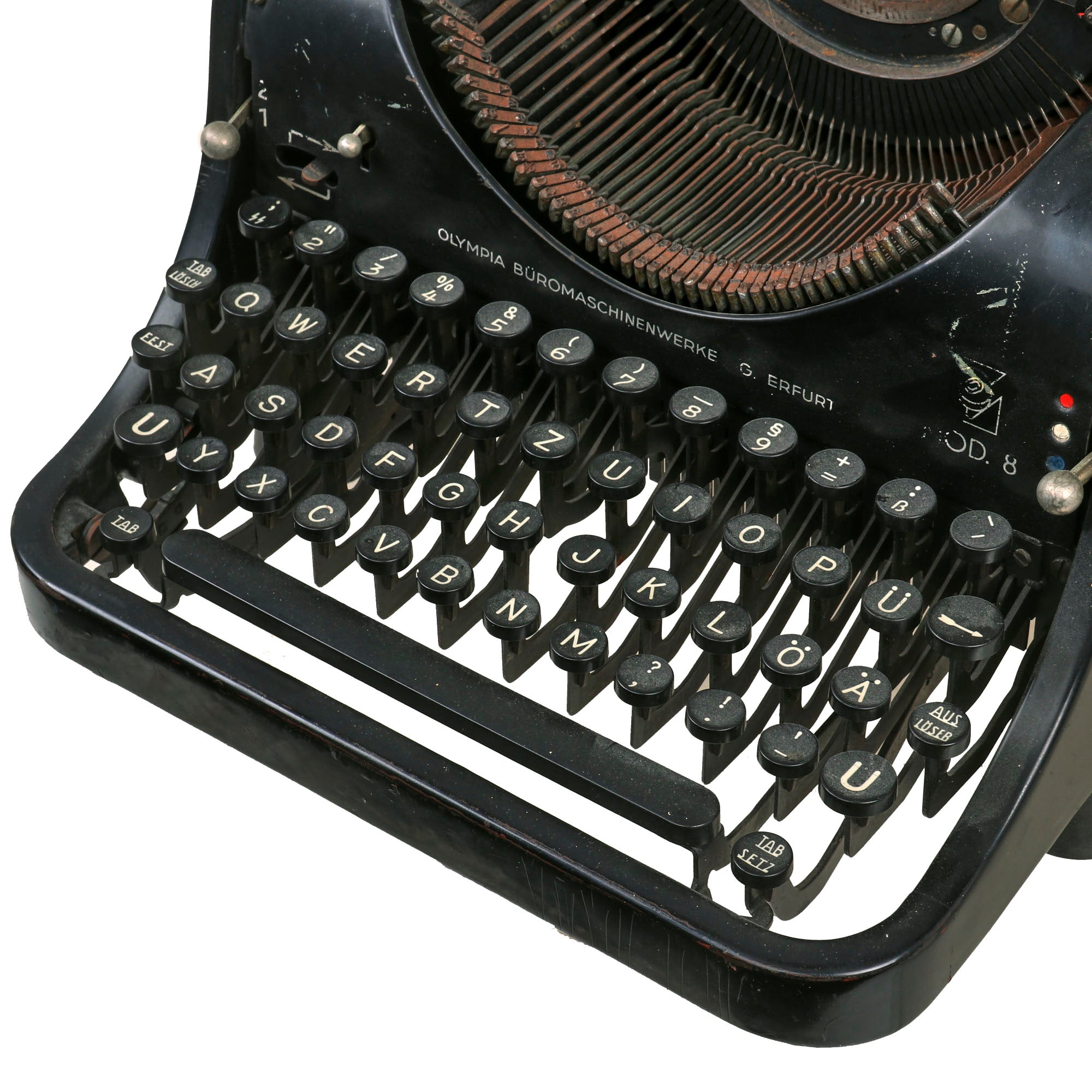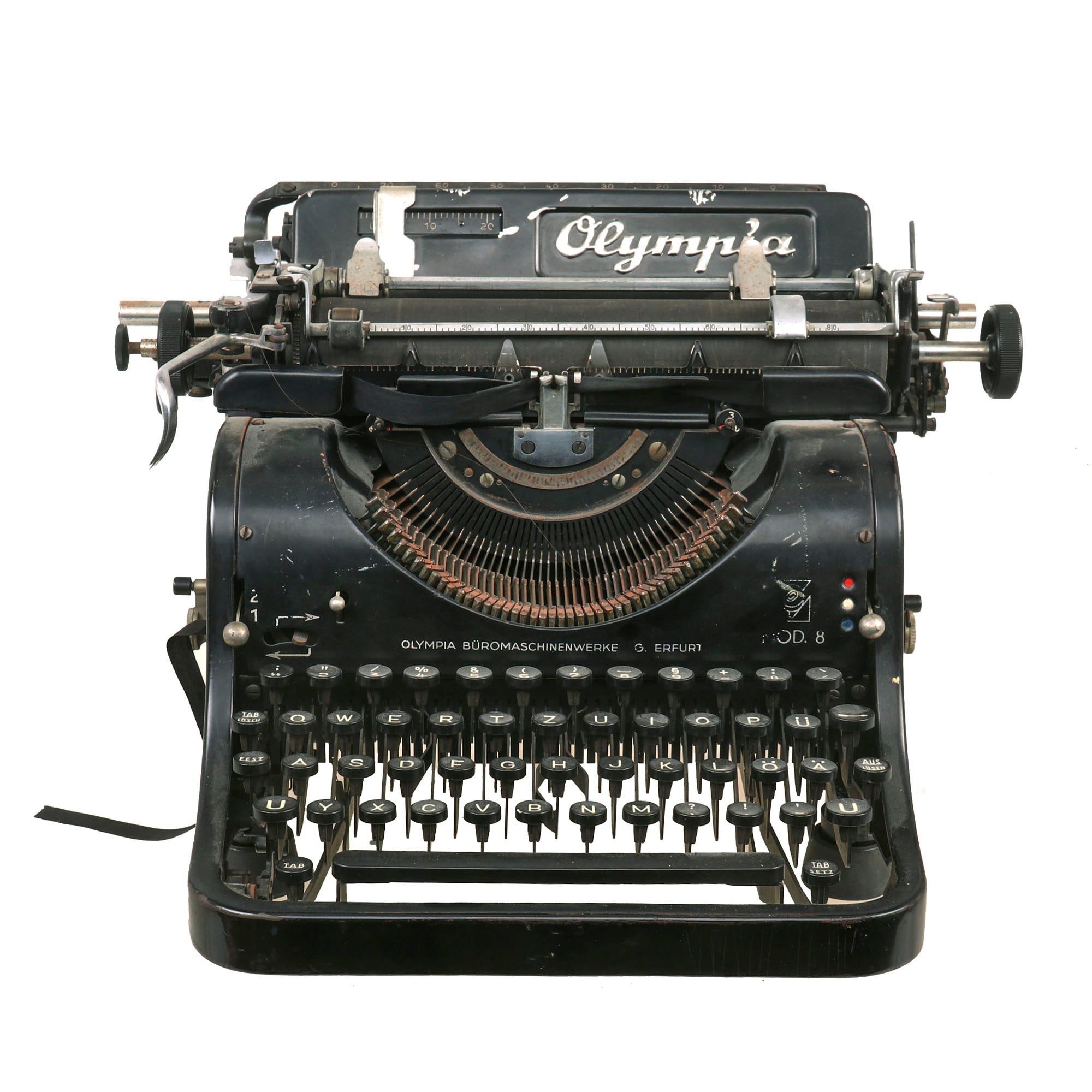 Original Item: Only One Available. Now this is something we have only had a very few of: an original German WWII Schutzstaffel (SS) typewriter! And this is also the much harder to find "Model 8", made by OLYMPIA BÜROMASCHINENWERKE AG. ERFURT (Olympia Office Machine Works Co), in Erfurt Germany, as noted on the front of the typewriter. To the far right is the MOD. 8 designation, and there is also the script logo Olympia on the typewriter itself, which is also marked with serial number 365962 on the rear right upper frame. This is a bit hard to get a good photograph of, as it is under some of the mechanisms on the typewriter. Consulting listings online, this indicates production most likely in 1940, or possibly 1941, right during the beginning of the war.