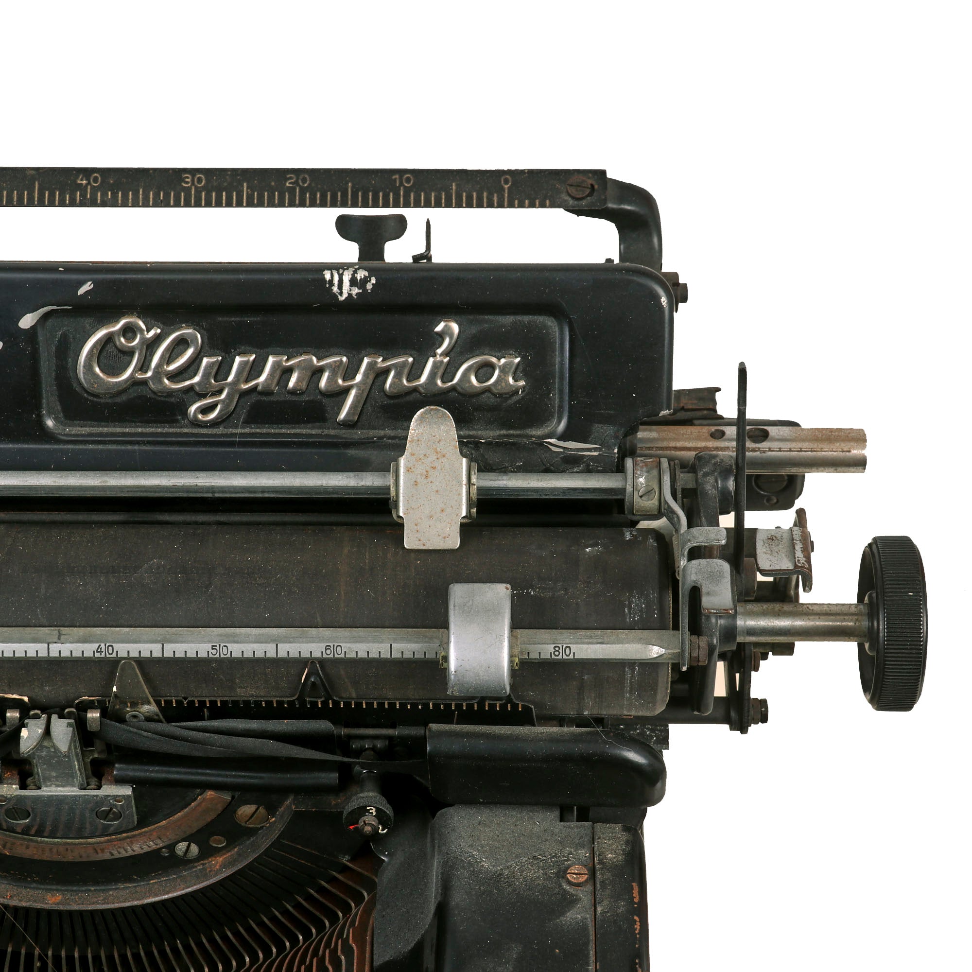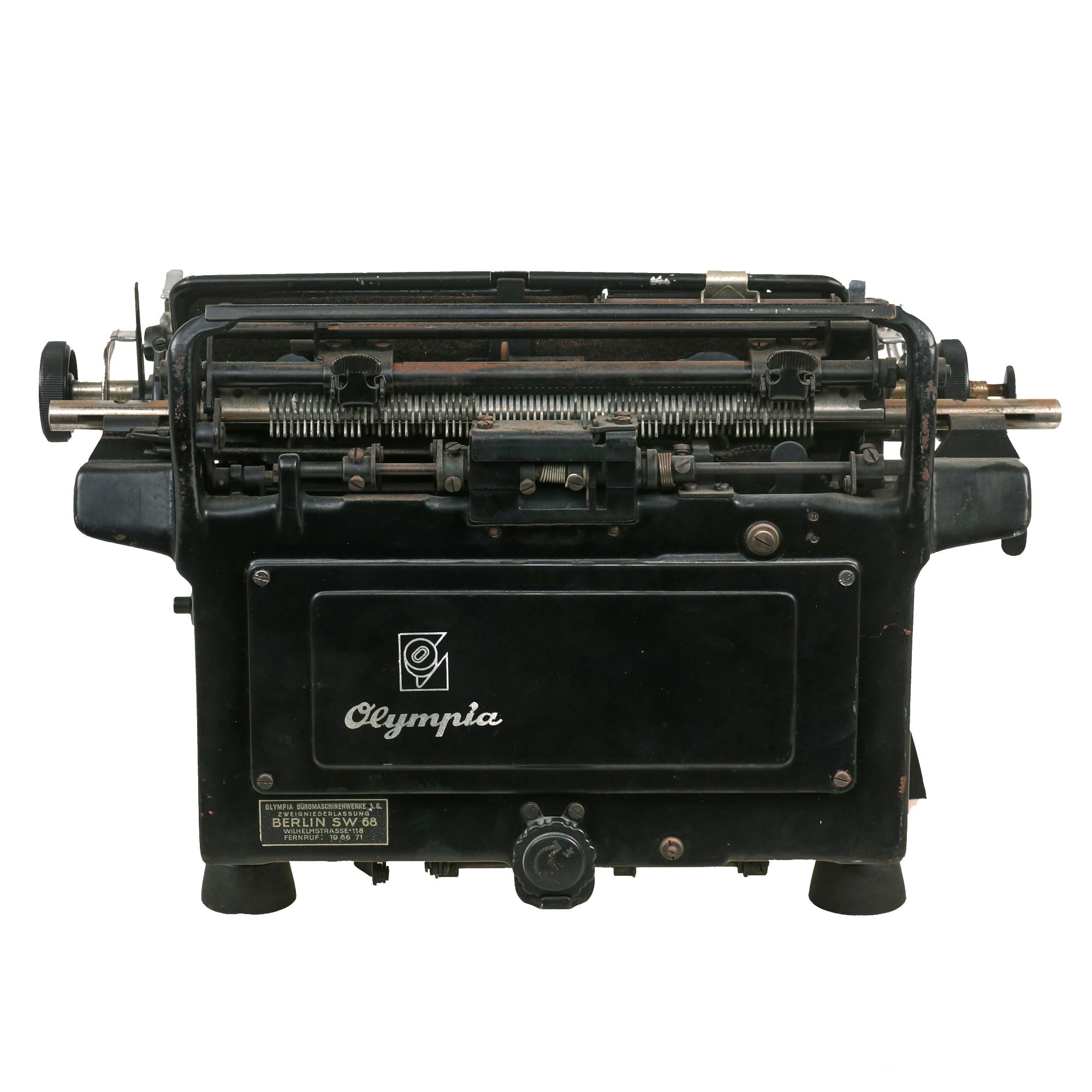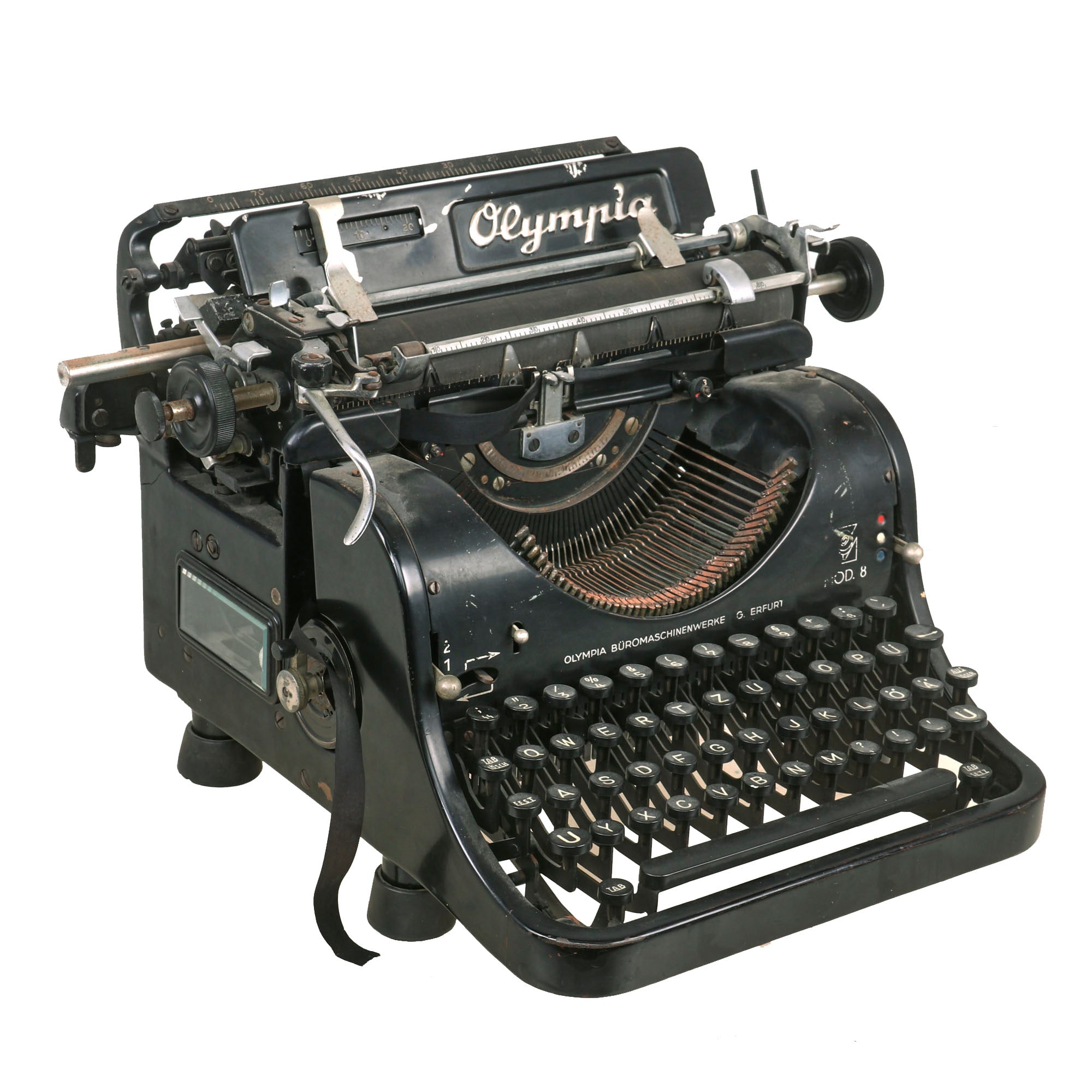 Original Item: Only One Available. Now this is something we have only had a very few of: an original German WWII Schutzstaffel (SS) typewriter! And this is also the much harder to find "Model 8", made by OLYMPIA BÜROMASCHINENWERKE AG. ERFURT (Olympia Office Machine Works Co), in Erfurt Germany, as noted on the front of the typewriter. To the far right is the MOD. 8 designation, and there is also the script logo Olympia on the typewriter itself, which is also marked with serial number 365962 on the rear right upper frame. This is a bit hard to get a good photograph of, as it is under some of the mechanisms on the typewriter. Consulting listings online, this indicates production most likely in 1940, or possibly 1941, right during the beginning of the war.