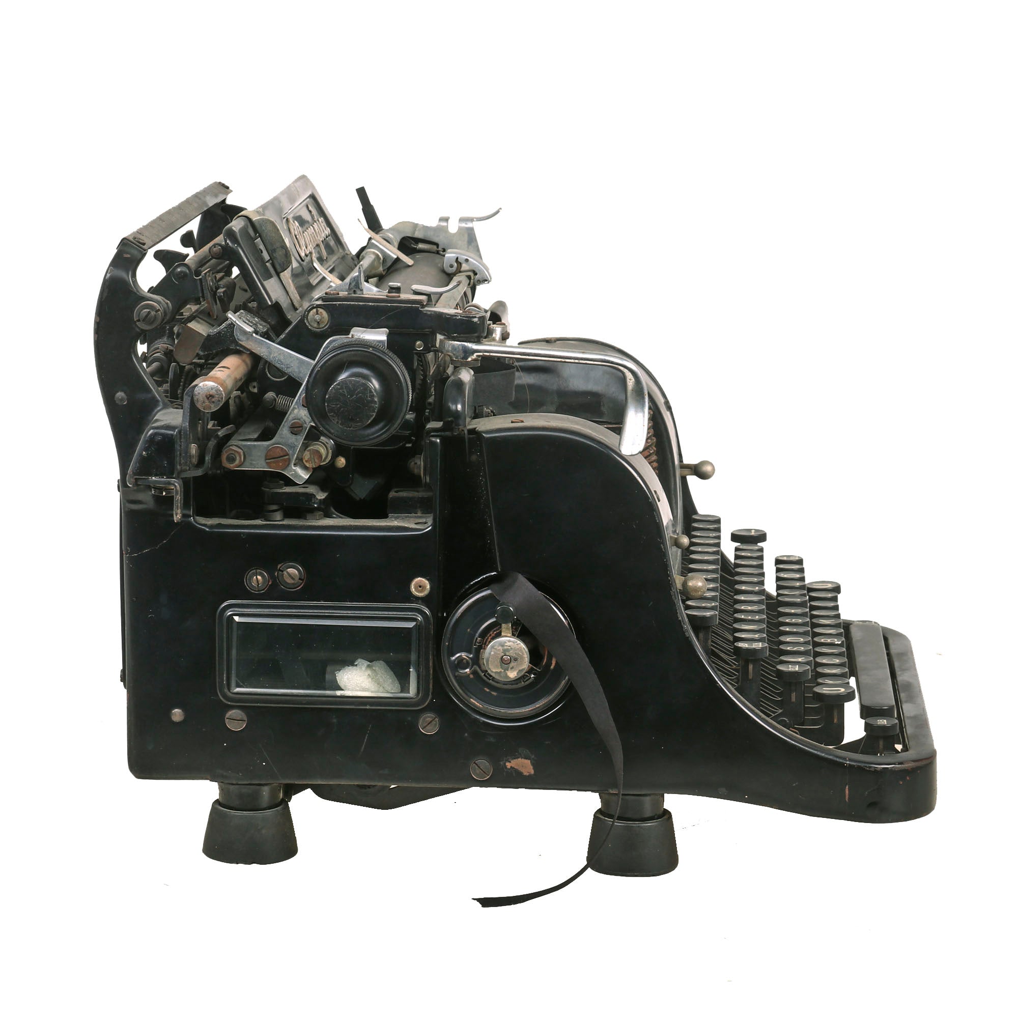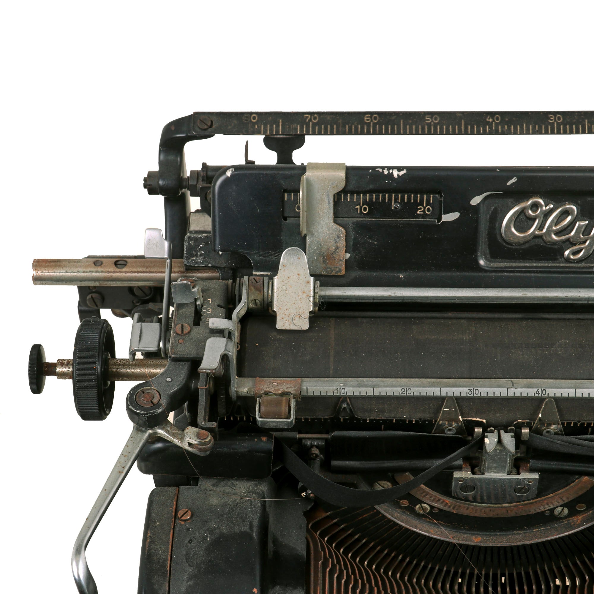 The Model 8 typewriter is definitely a "heavy duty" type, much more so than the usual "ROBUST" models we see from Olympia. The typewriter itself weighs a substantial 36lbs, and measures 15 ½"W x 14"D x 10 ½"H. It seems to be mostly functional, but there is definitely surface oxidation in some areas, and it is long overdue for a servicing. The original ribbon that came with it is falling apart, and also definitely needs replacement.