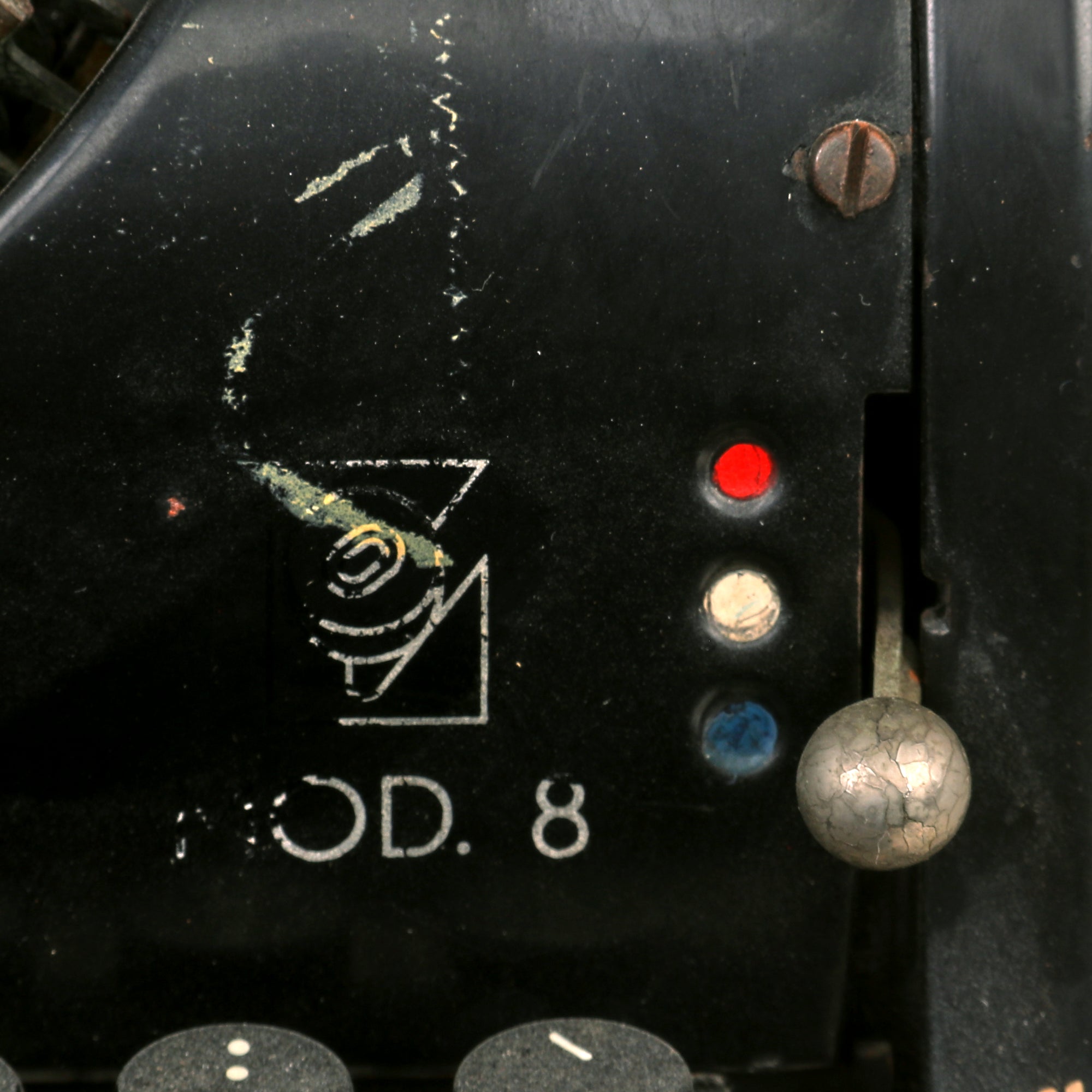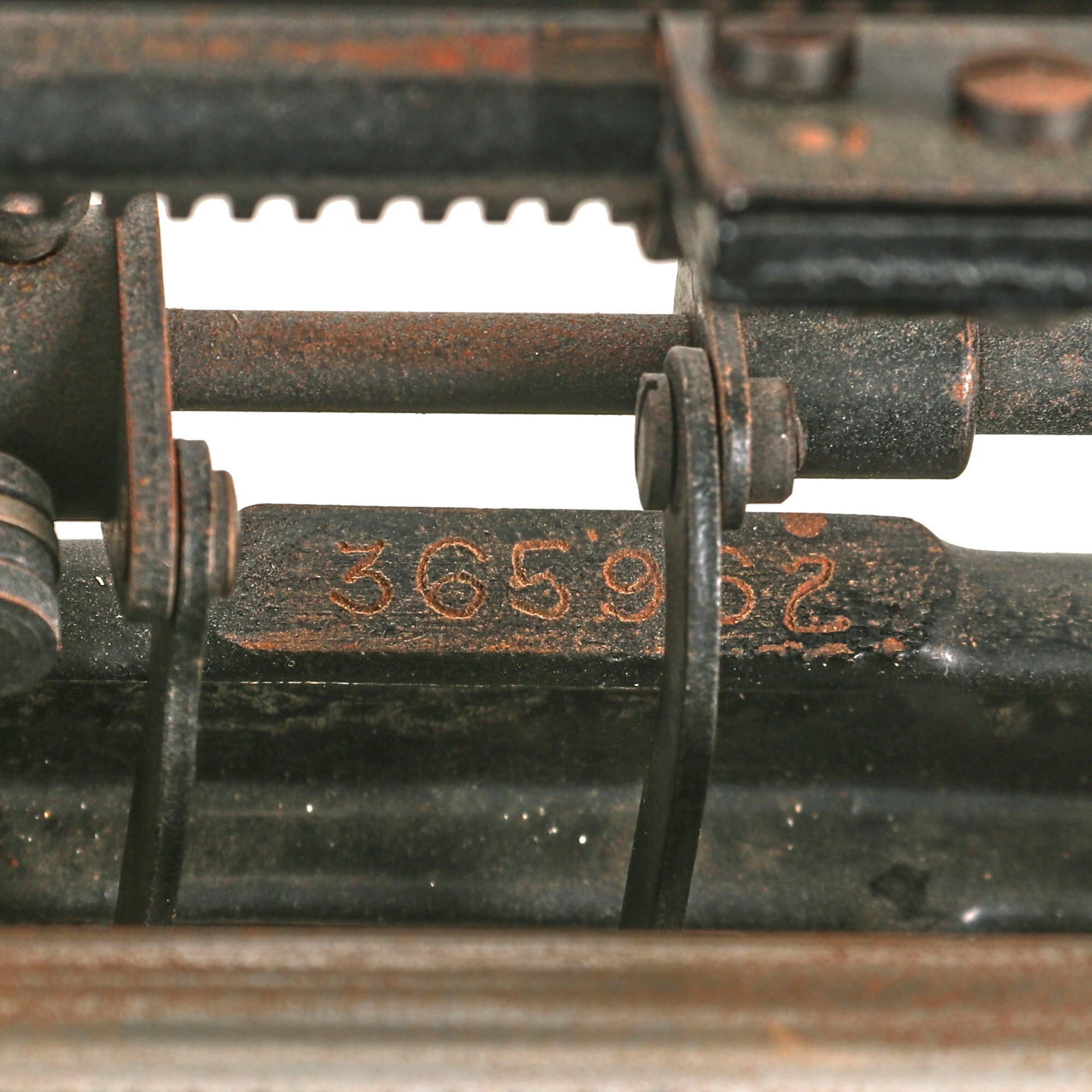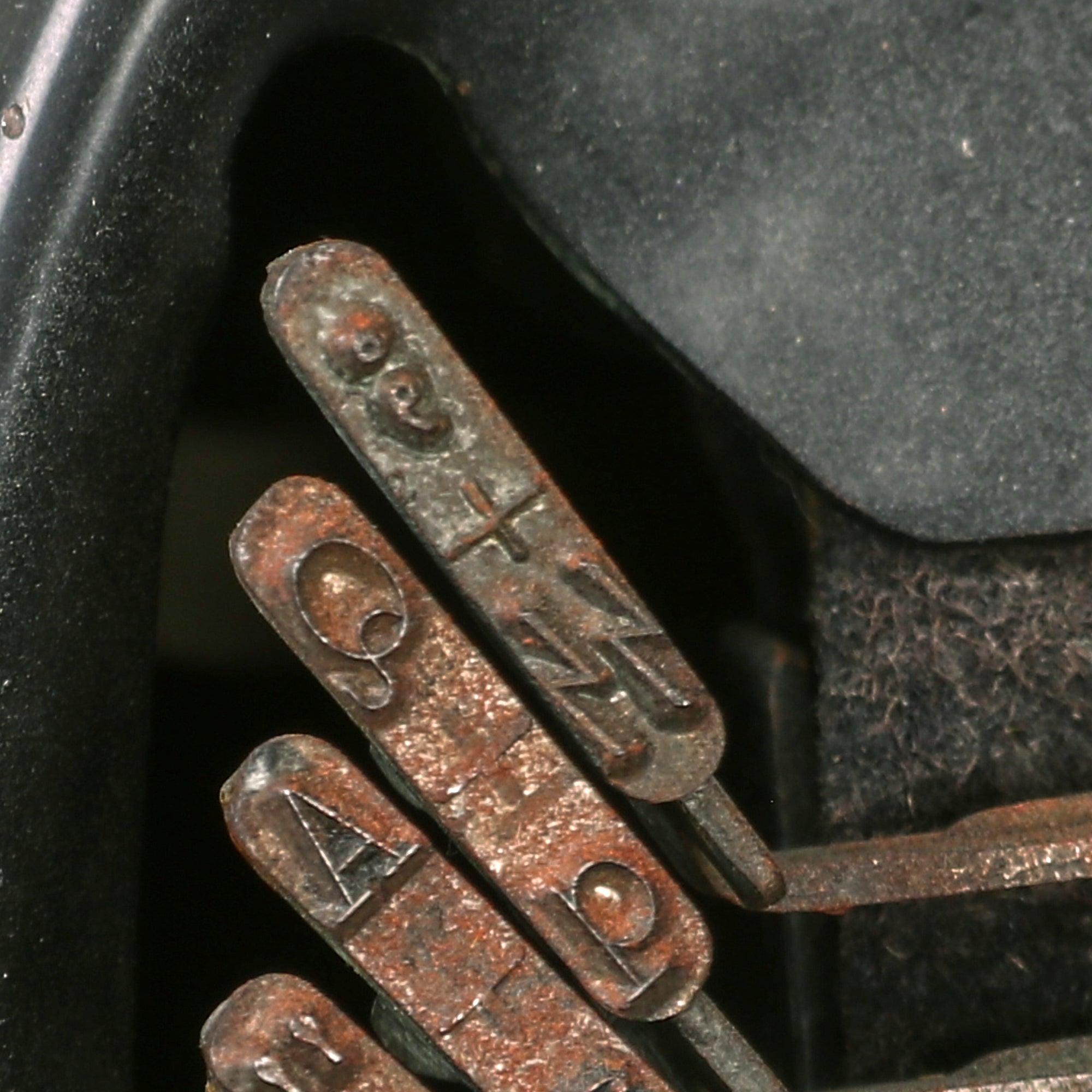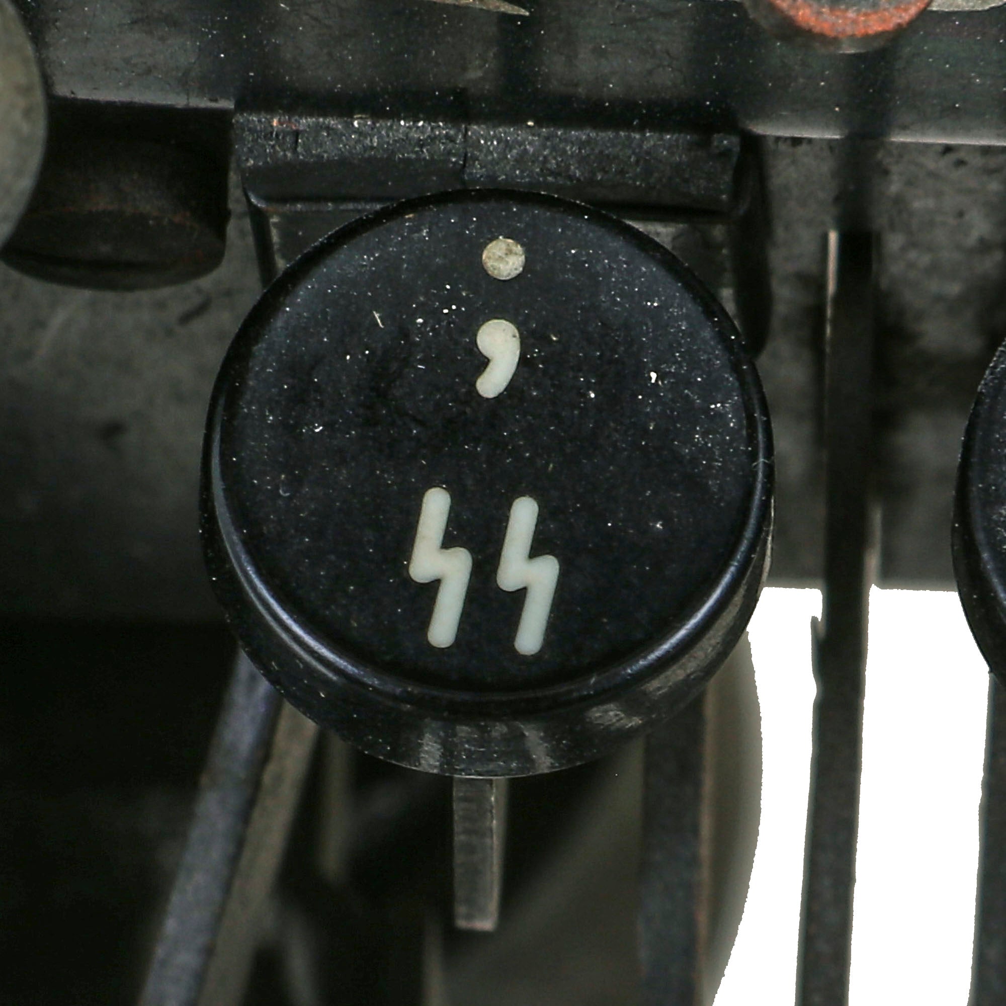 Now, the question most have is "what makes this an SS typewriter?". On this example, the key farthest to the upper left, which would normally be the number "1", is instead the double Sig rune emblem of the SS: ᛋᛋ. The key bar itself has this on it, and it is definitely the original one. Usually we see this as a "shift" symbol, but in this case it is the regular symbol, with ";" being the shift character. This also means that there is not a number "1" character, so we assume they would have used an uppercase i or lowercase L in its place. Very few of these survived the war intact, as most were modified for use post war with replacement of the key and striker.