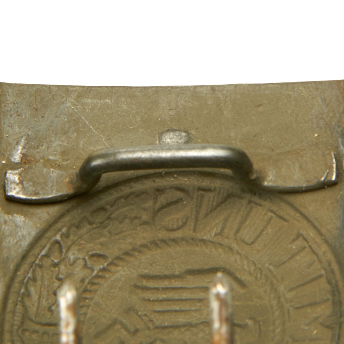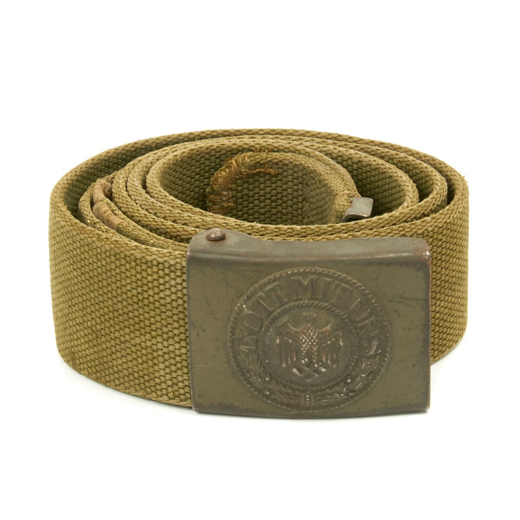 Original Item: Only One Available. This is a very rare totally genuine WWII DAK tropical waist belt with black steel Heer buckle. Buckle is die-stamped steel (magnetic), with an olive drab finish; maker marked but illegible; embossed with Wehrmacht eagle and motto “Gott Mit Uns” (God With Us); measuring 2.5” x 2”.