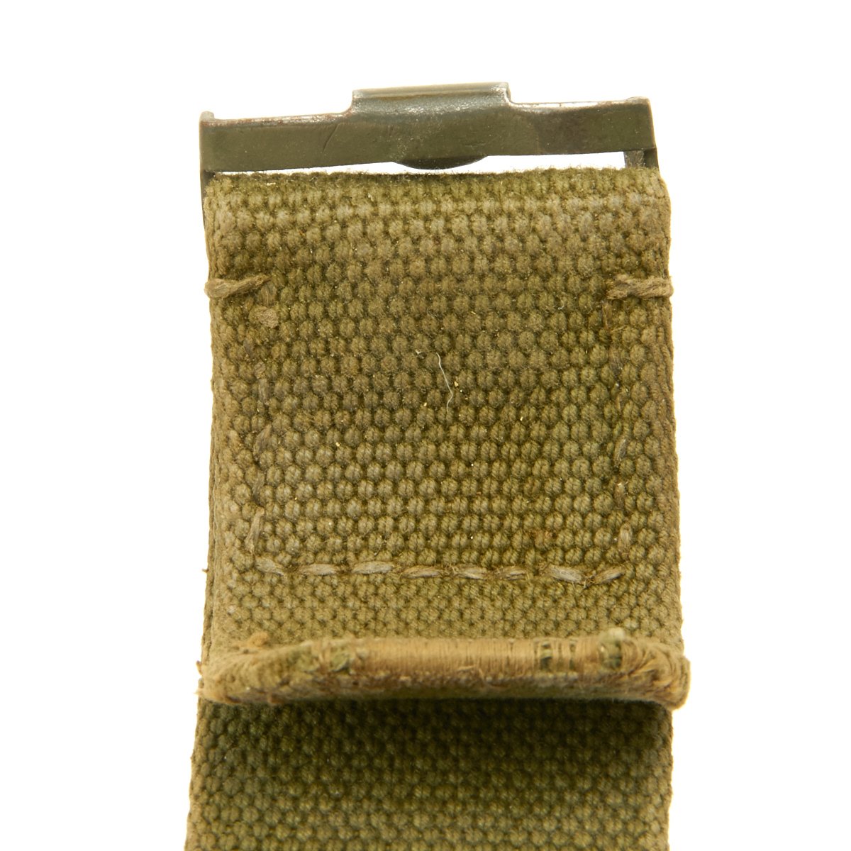 Olive-green colored web belt with intact black web tab with seven double vertically holes for length adjustment; measuring 39.5” x 1 3/4”.