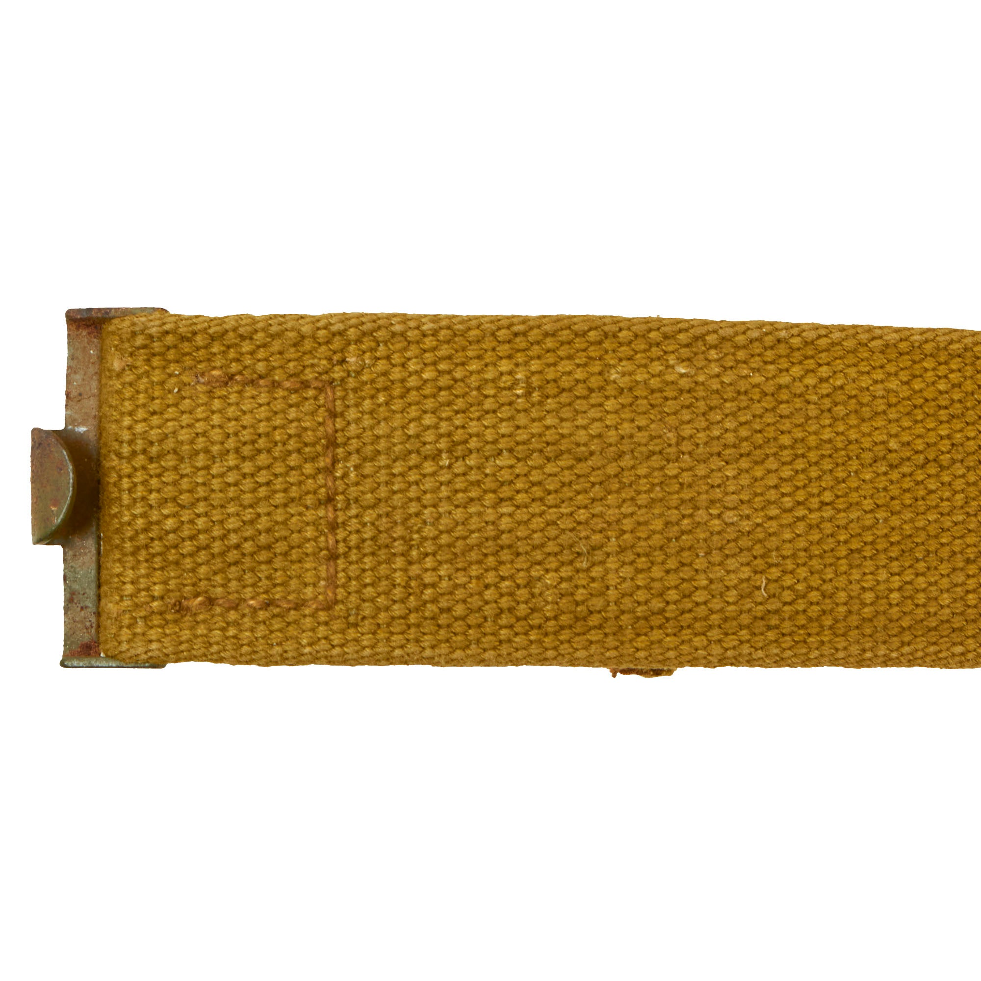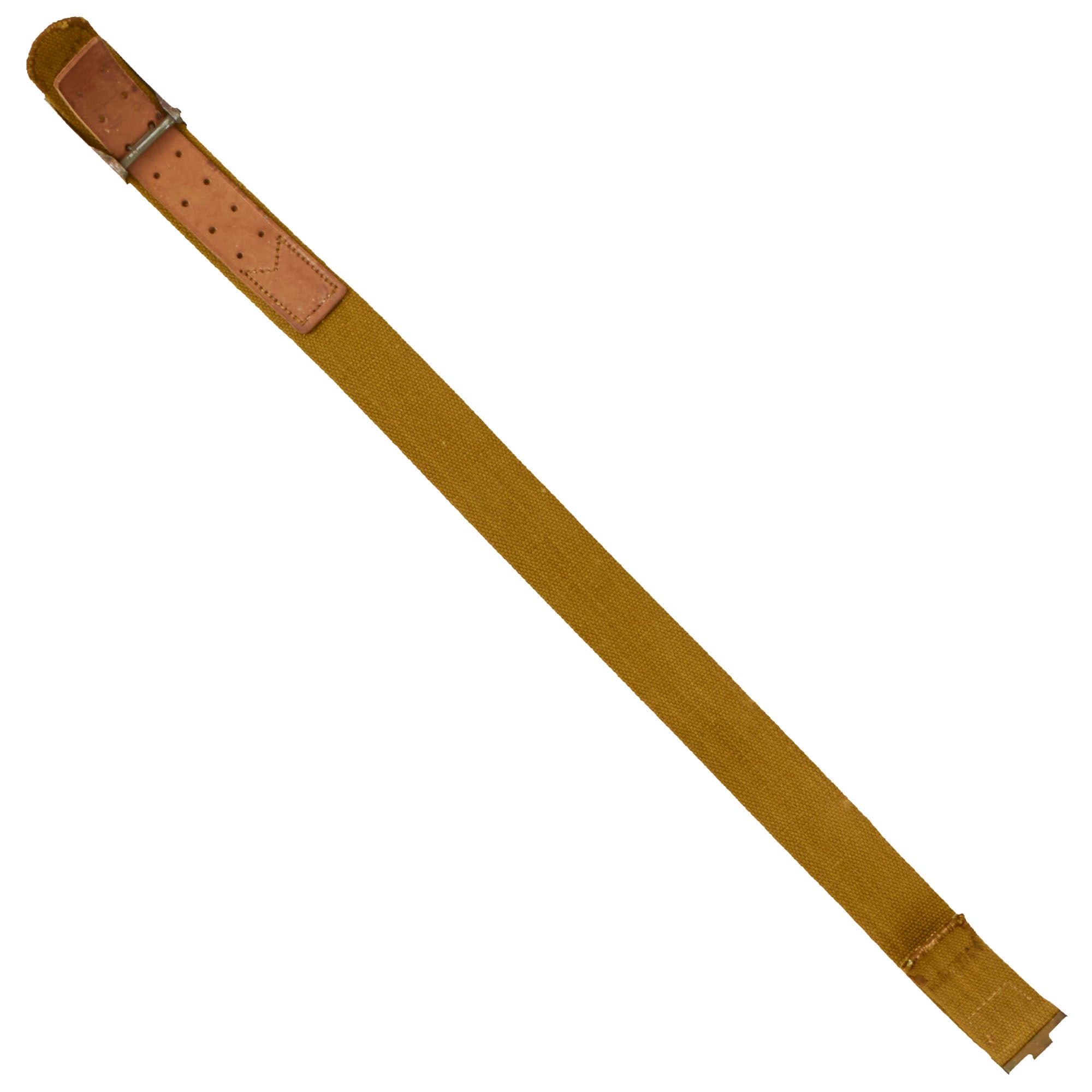 The DAK tan colored web belt has a brown leather tab with the usual seven double vertically holes for length adjustment. The brown end stitching is mostly intact, and the belt measures 30 1/2 inches in overall length. It also is marked with size 80 (cm), which is about 31.5 inches, so it may have shrunk a tad. The webbing is in almost unissued condition, with no staining, tears, etc. There are some faded markings near the clip end, but they are illegible.