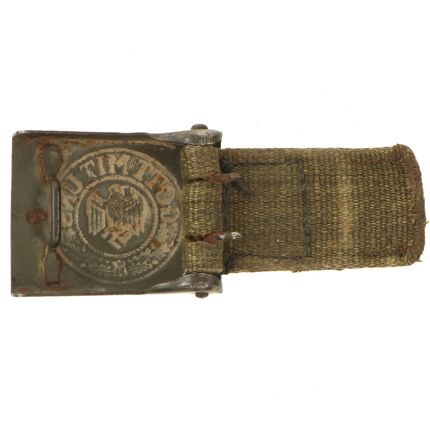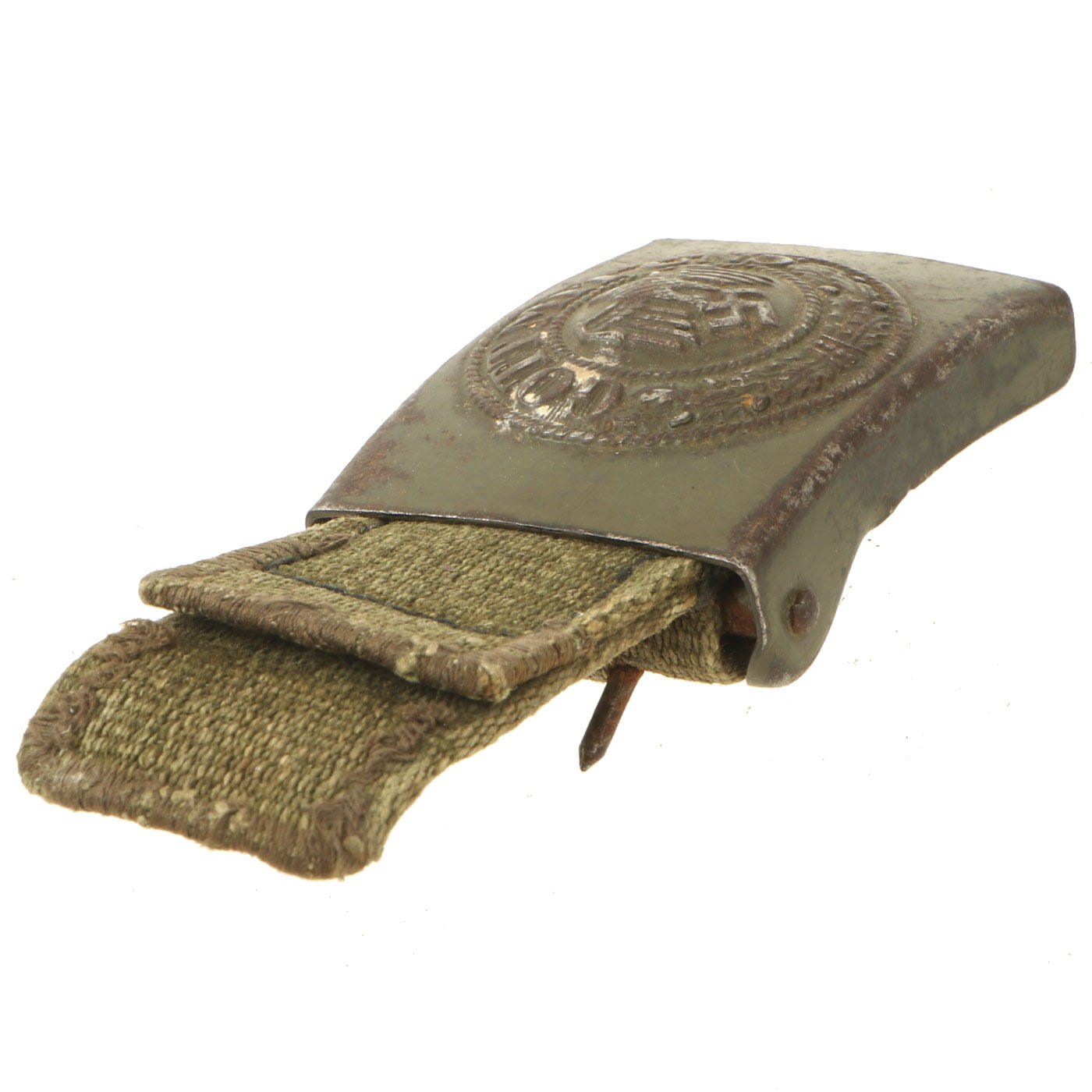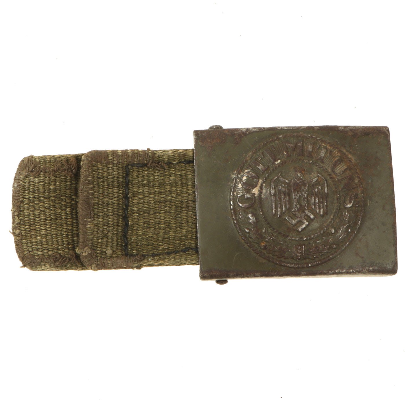 Original Item: Only One Available. This is a very rare totally genuine WWII Deutsches Afrikakorps (German Africa corps or DAK) tropical EM/NCO's Steel Painted Belt Buckle (Koppelschloß) with web pull tab. Nice solid used originals such as this example are very hard to come by. The Buckle is die-stamped steel (magnetic), with an olive drab finish. The front of the buckle is embossed with Wehrmacht eagle and motto GOTT MIT UNS (God [is] With Us) in German Black Letter Typeface. About 75% of the original paint remains on the front and back of the buckle, with some missing paint on the wear points. There is also some dried dirt on the reverse, possibly direct from Africa! The olive drab pull tab is very nice, with intact stitching and moderate wear. It is the correct darker green with tan stitching.