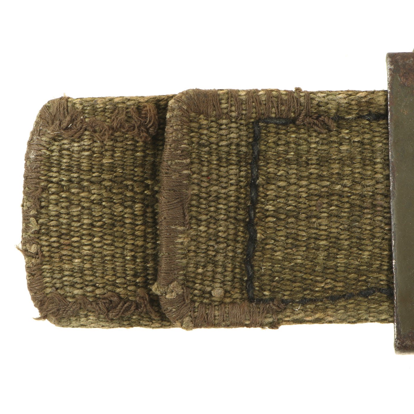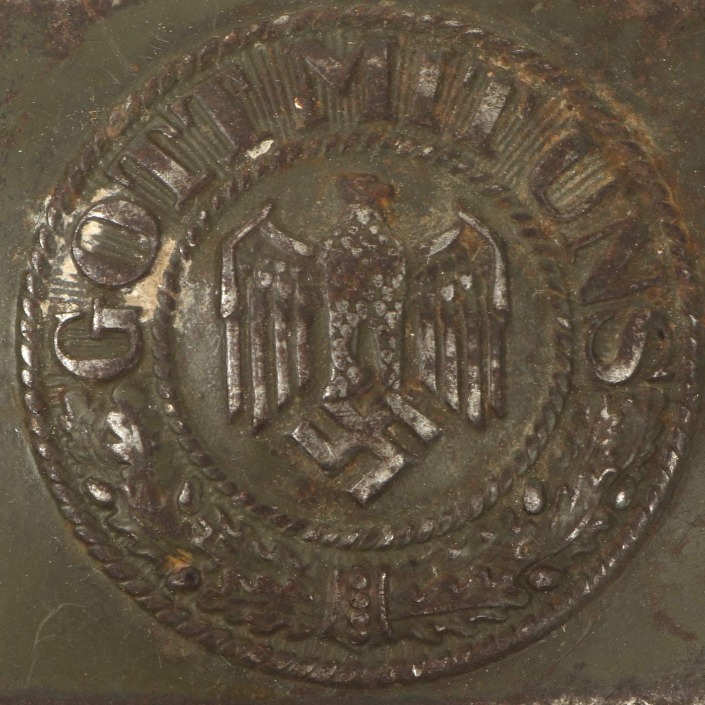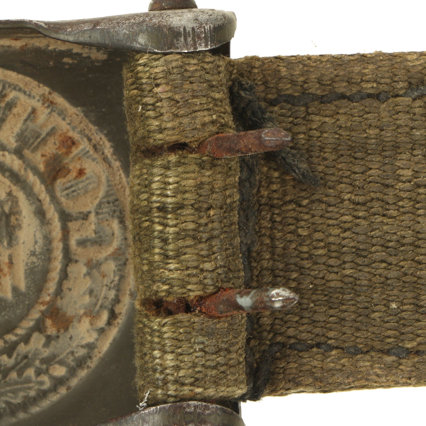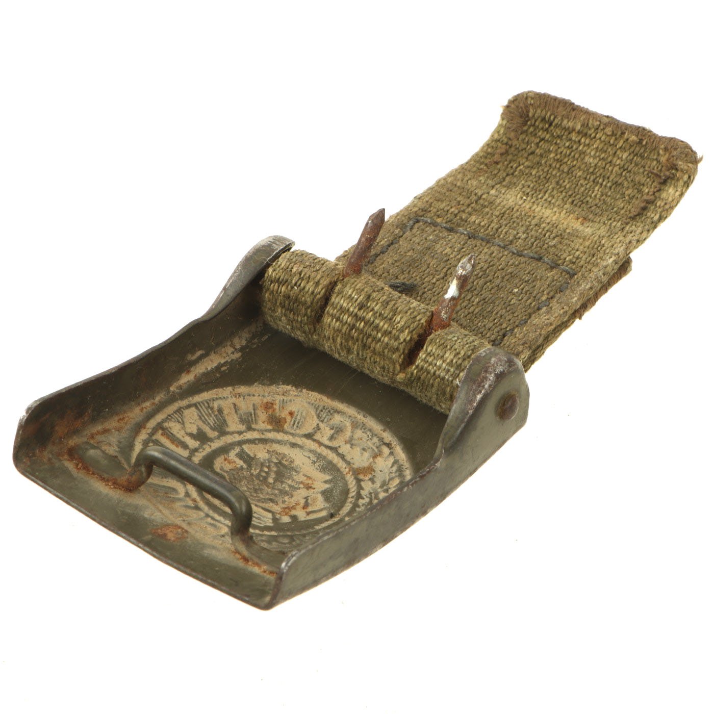 Original Item: Only One Available. This is a very rare totally genuine WWII Deutsches Afrikakorps (German Africa corps or DAK) tropical EM/NCO's Steel Painted Belt Buckle (Koppelschloß) with web pull tab. Nice solid used originals such as this example are very hard to come by. The Buckle is die-stamped steel (magnetic), with an olive drab finish. The front of the buckle is embossed with Wehrmacht eagle and motto GOTT MIT UNS (God [is] With Us) in German Black Letter Typeface. About 75% of the original paint remains on the front and back of the buckle, with some missing paint on the wear points. There is also some dried dirt on the reverse, possibly direct from Africa! The olive drab pull tab is very nice, with intact stitching and moderate wear. It is the correct darker green with tan stitching.