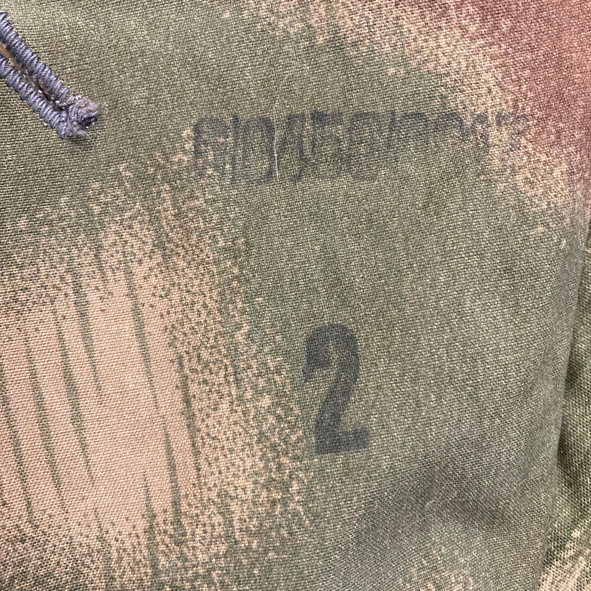 Many parkas reverse from camouflage to white, however this example does not and has a lovely gray rayon lining. Both the hood and waist drawstrings are present and fully functional. The six front closure buttons are all present, as are the two buttons at the end of each sleeve. They are all plastic or bakelite and are in very good condition, withy the stitching still strong. The camouflage exterior is in excellent condition, with strong coloring and very little fading. It does not show any major damage, and is still relatively stiff, indicating it did not see much use. This definitely is one of the best examples that we have seen. The interior shows some light wear and minor staining, but no major tears or other damage. There is no size stamp present or any other markings we can see. The internal belts for adjusting the fit look to be fully intact and functional.