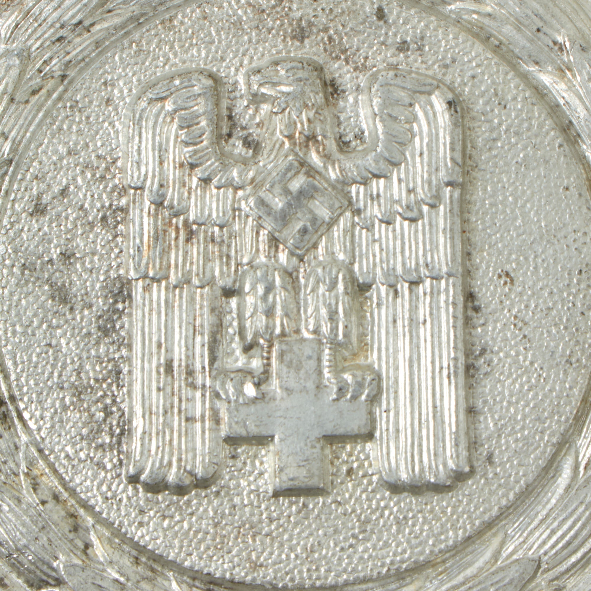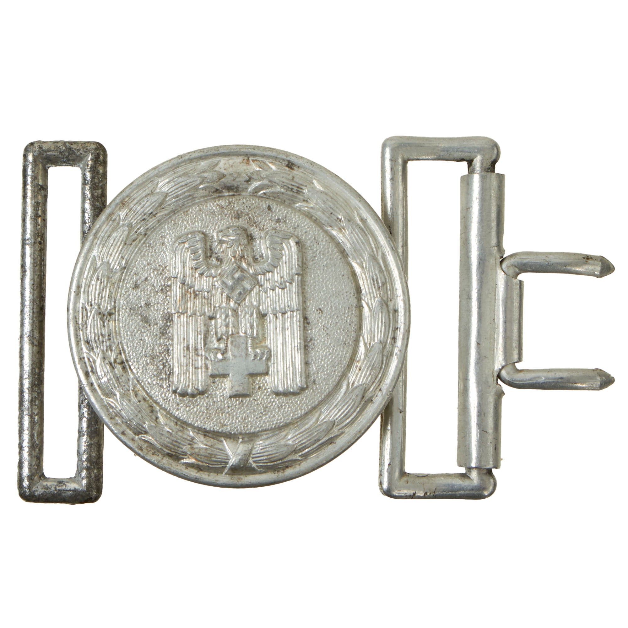 The front of the buckle a large pebbled field, with an eagle with down-swept wings clutching a "Red Cross" in its talons and with a mobile swas (hook cross) to its breast. This is all surrounded by an open-topped wreath of laurels. This buckle would normally be attached to a silver bullion "brocade" belt, used on dress occasions. Unfortunately we only have the buckle, and not the belt, and they are exceedingly rare.