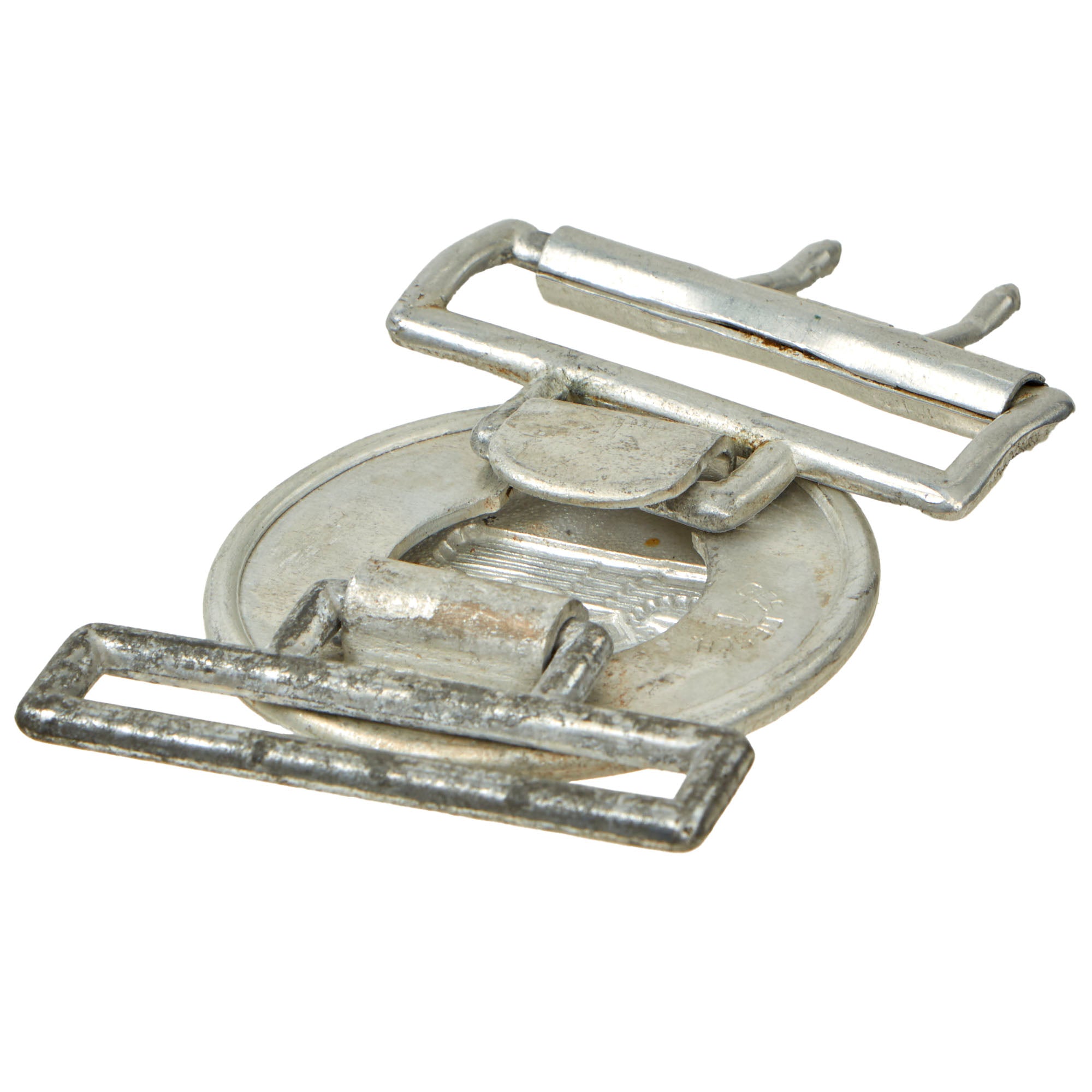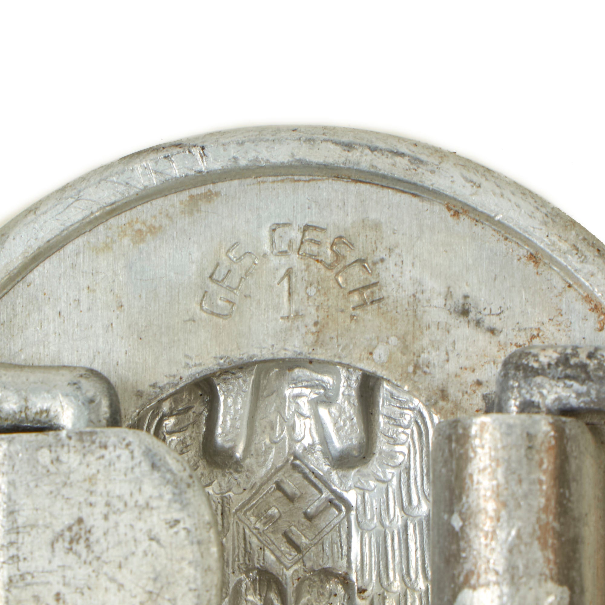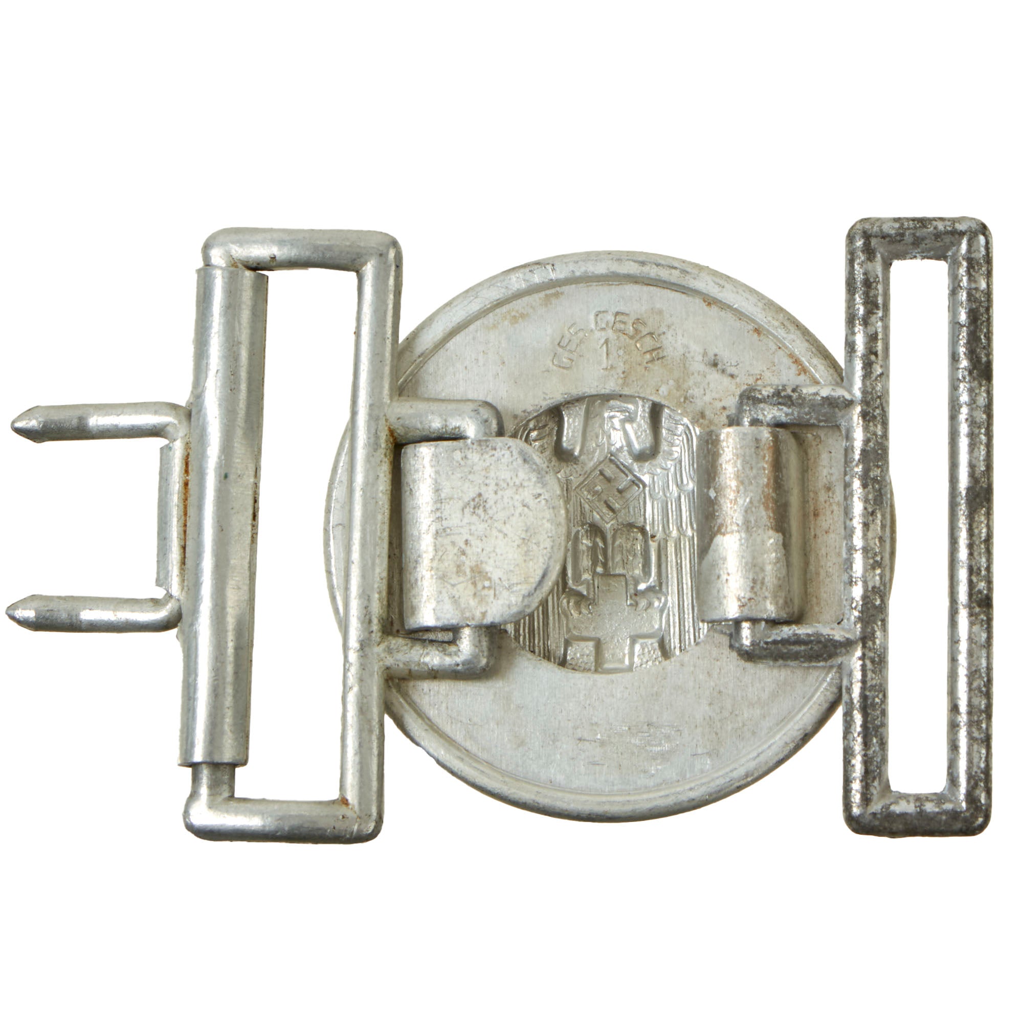 The buckle is in very good condition, showing wear and some oxidation, particularly on the box loop. A very attractive display piece that still retains all of the detail on the insignia. Also on the back is GES. GESCH. / 1, for "Gesetzlich Geschützt" (By-law Protected). We are not sure if the 1 is a maker code, but the buckle is otherwise unmarked. It may be a Pre-RZM designation.