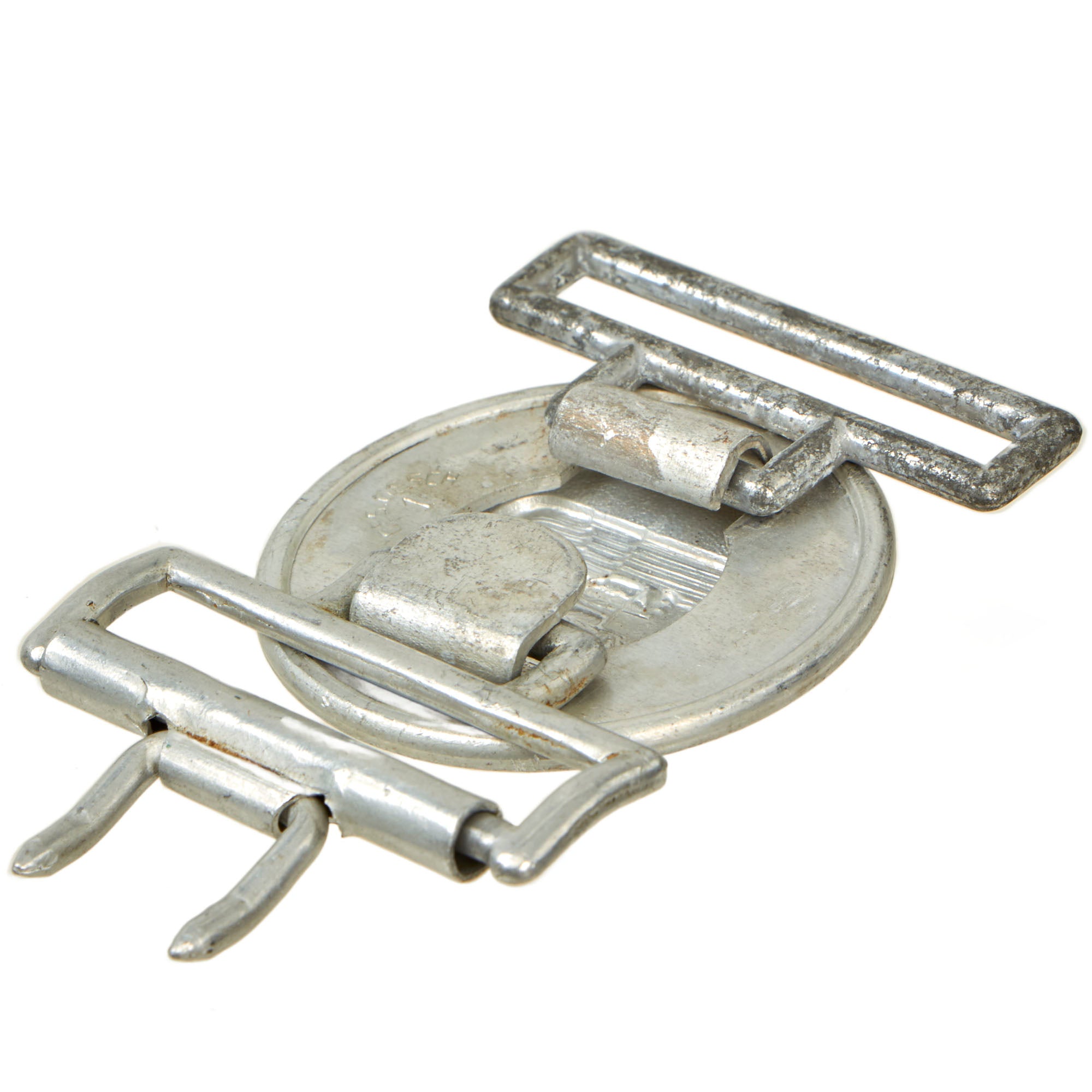 Original Item: Only One Available. This is a very nice service used example of a WWII German Red Cross (DRK) Officer's Brocade Dress Belt Buckle (Koppelschloß). This buckle features multi-piece aluminum construction, with a 50mm, slightly convex, round central portion, with a clip on the back, and still has the box loop attached to the back. Also included is the matching box loop with size adjustment clip for the other side of the belt.
