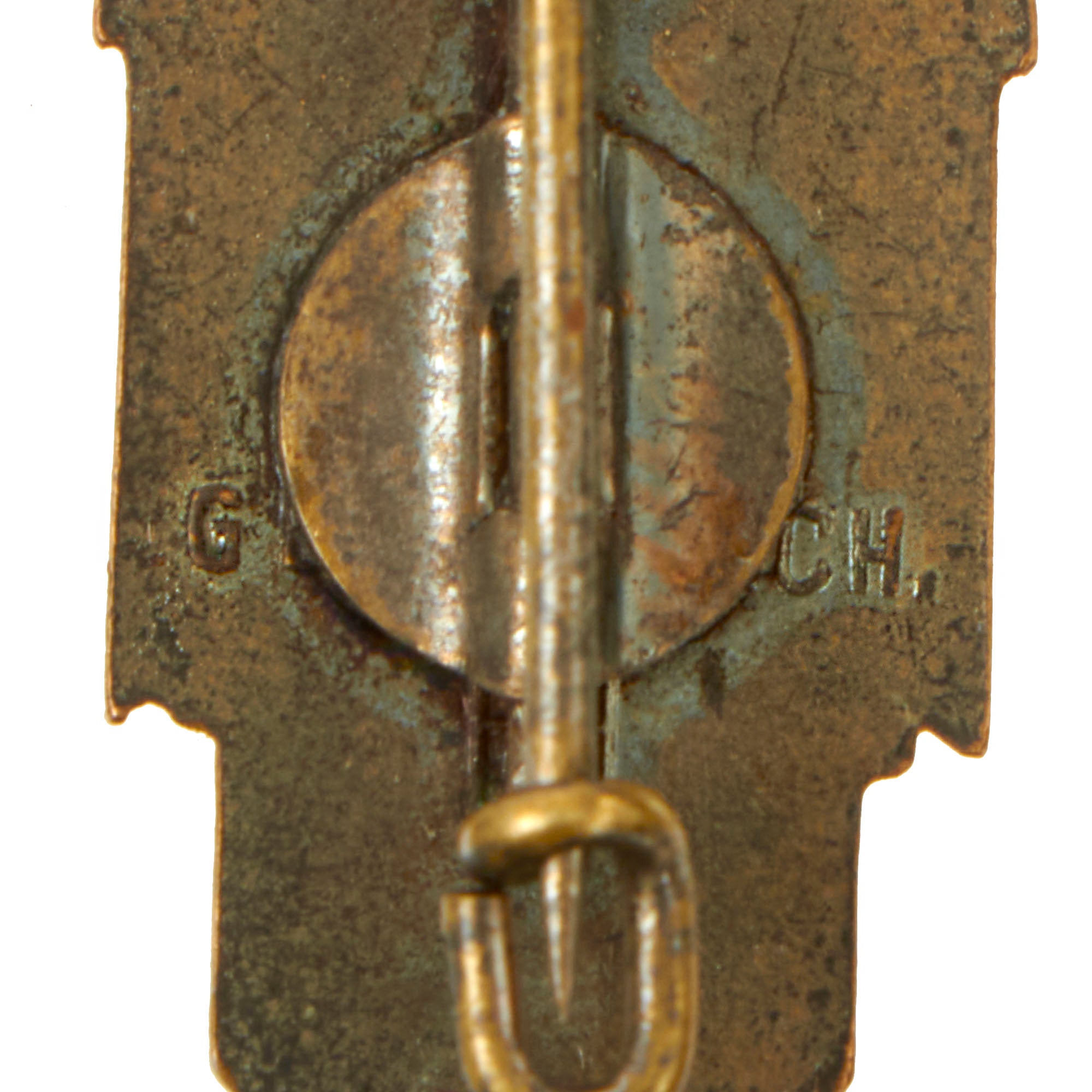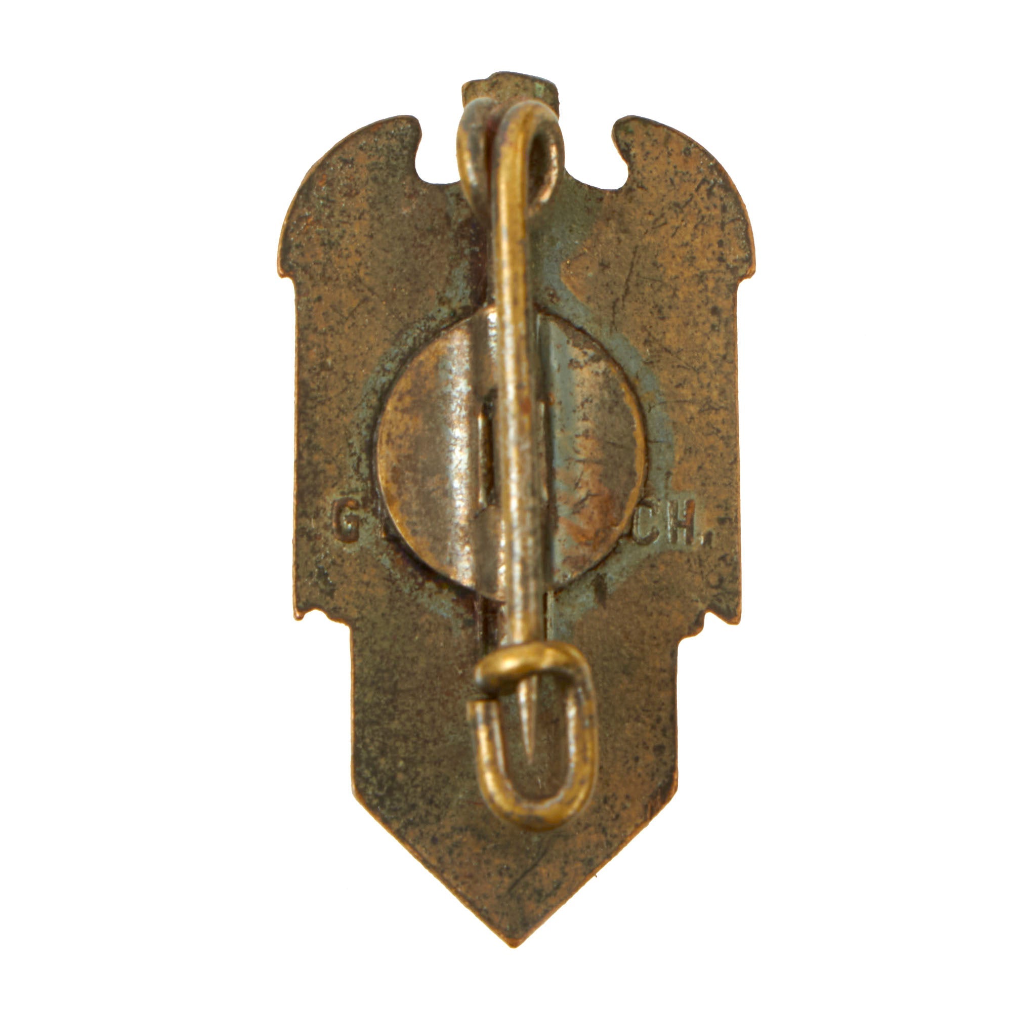 This is a very nice example of a Reich Colonial League membership badge pin, showing a closed winged eagle perched on top of an enameled RKB shield insignia, which was based on the flag used by the German East Africa Company. Measures approximately 24mm H x 13mm W, and is in very good condition. The badge looks to be made from silvered brass, and does show wear through to the base material. The enamel is in very good shape, showing no cracking. Ready to add to your collection!