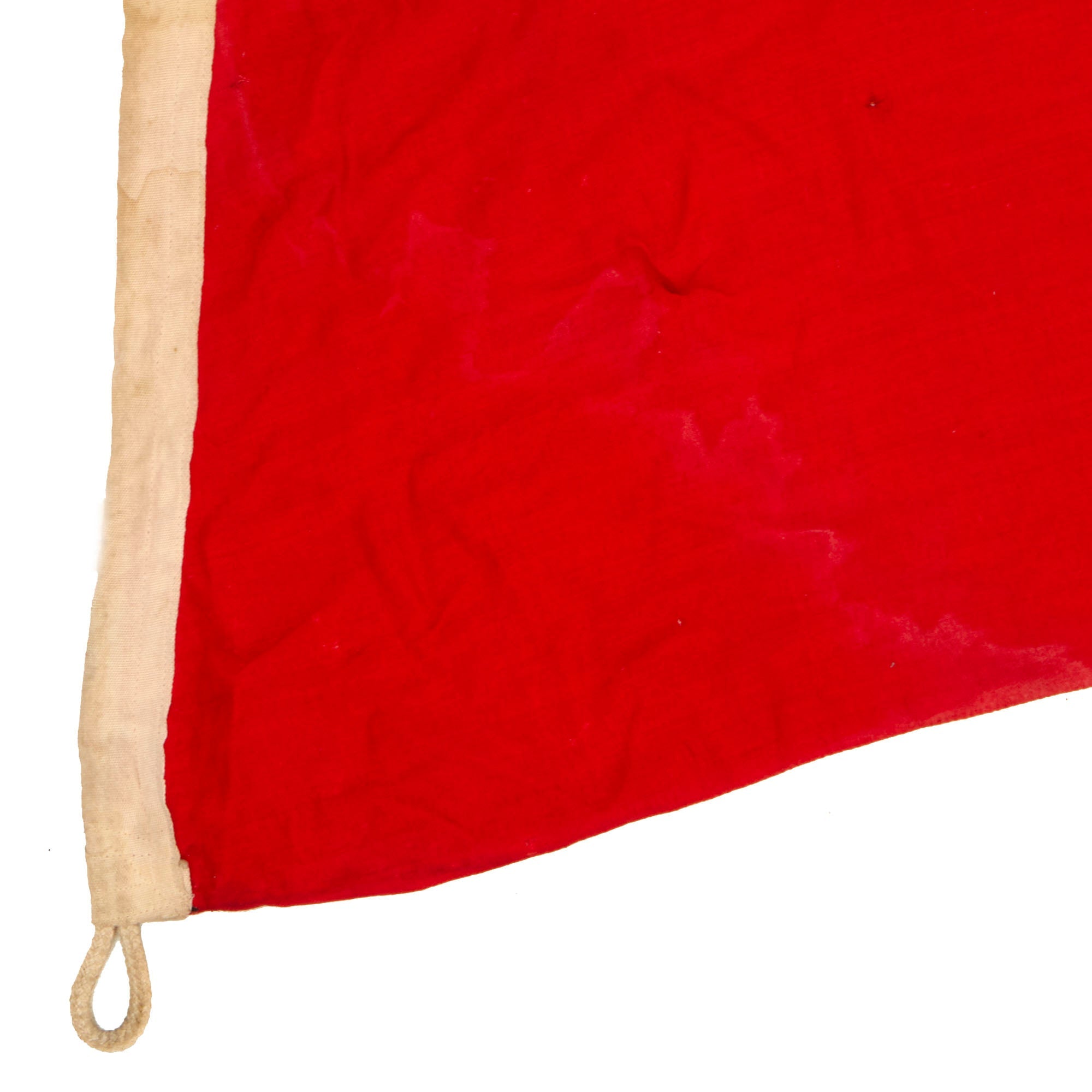 Condition is good, with small holes from wear, or possibly moth, and overall age toning. There are some small holes and gears, but no major damage. It has a white canvas header, with a white rope halyard inside that terminates in loops on either end. A very nice example, ready to add to your collection!