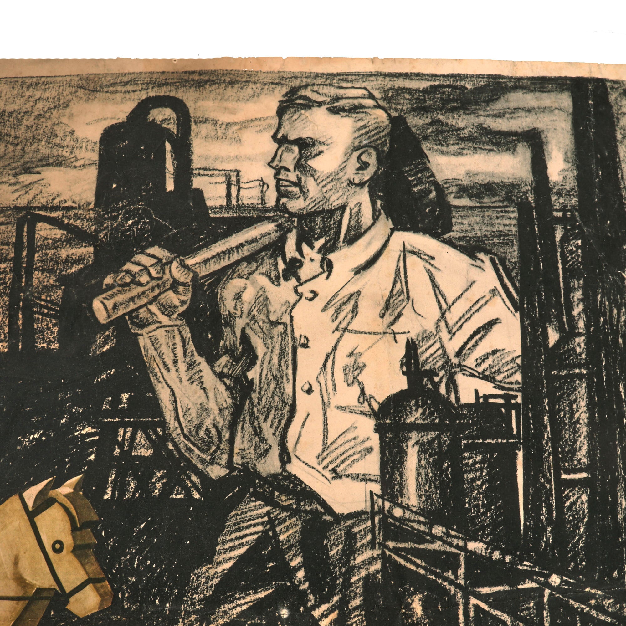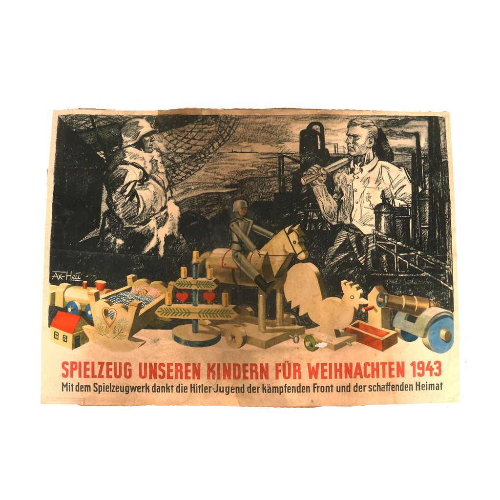 Original Item. Only One Available. This is a great German propaganda poster encouraging men of industry and in the military to fight for their families who need Christmas gifts during 1943, one of the most decisive years of World War II. The poster measures 23" x 33”, and features a soldier in the field and an industrial worker in the factory in the background with several children’s toys in the foreground with the text: