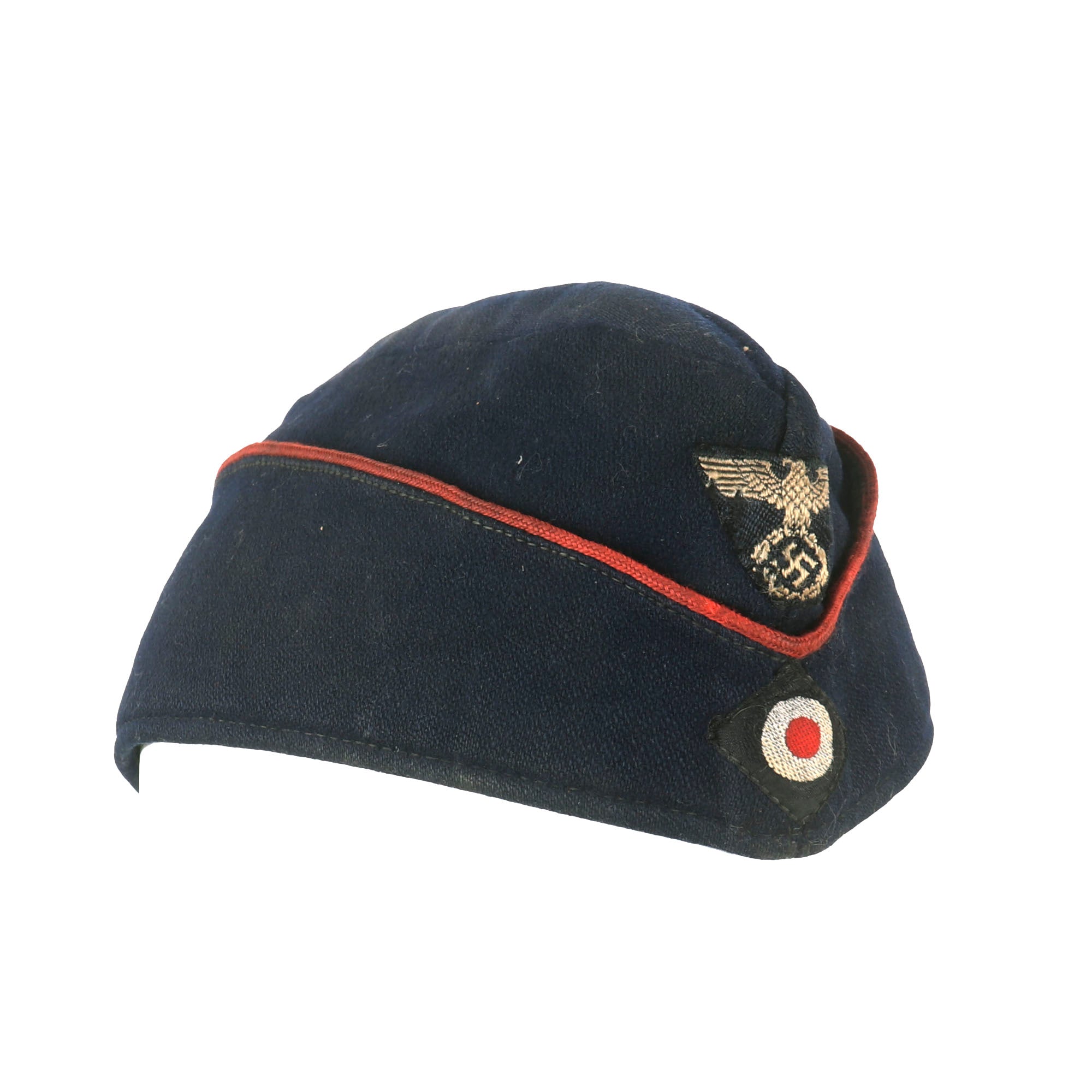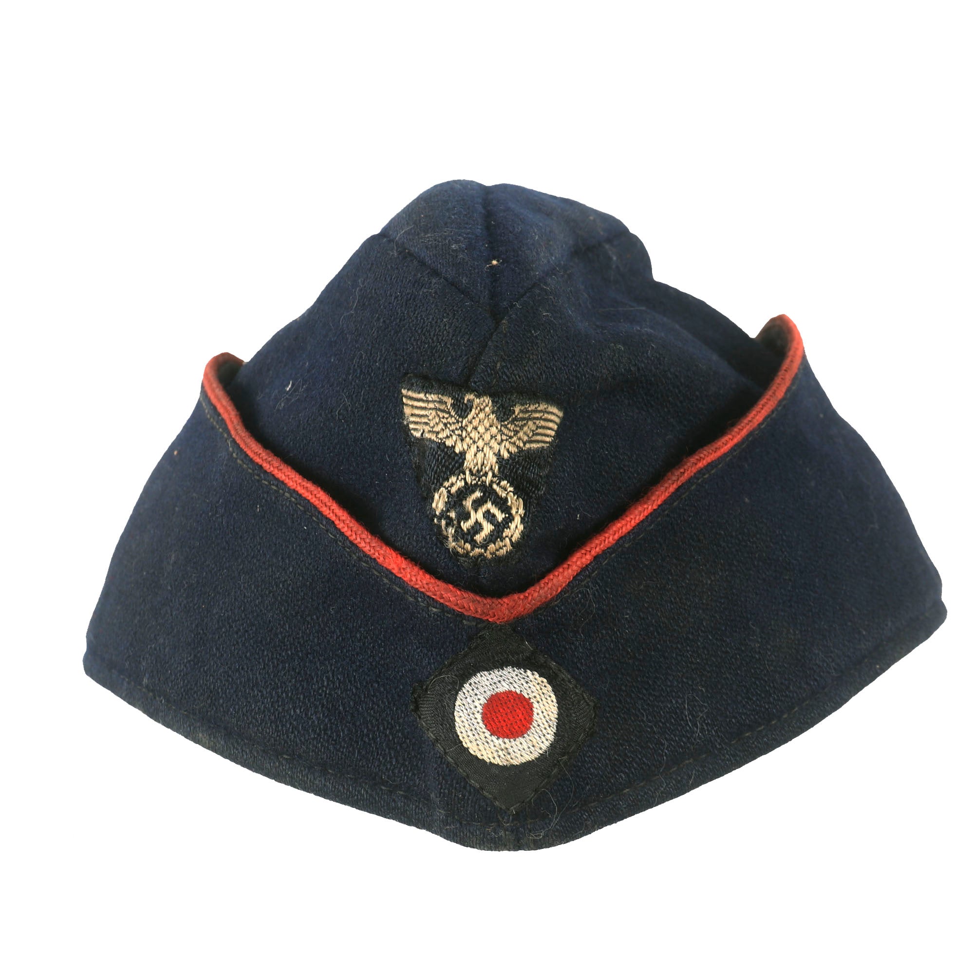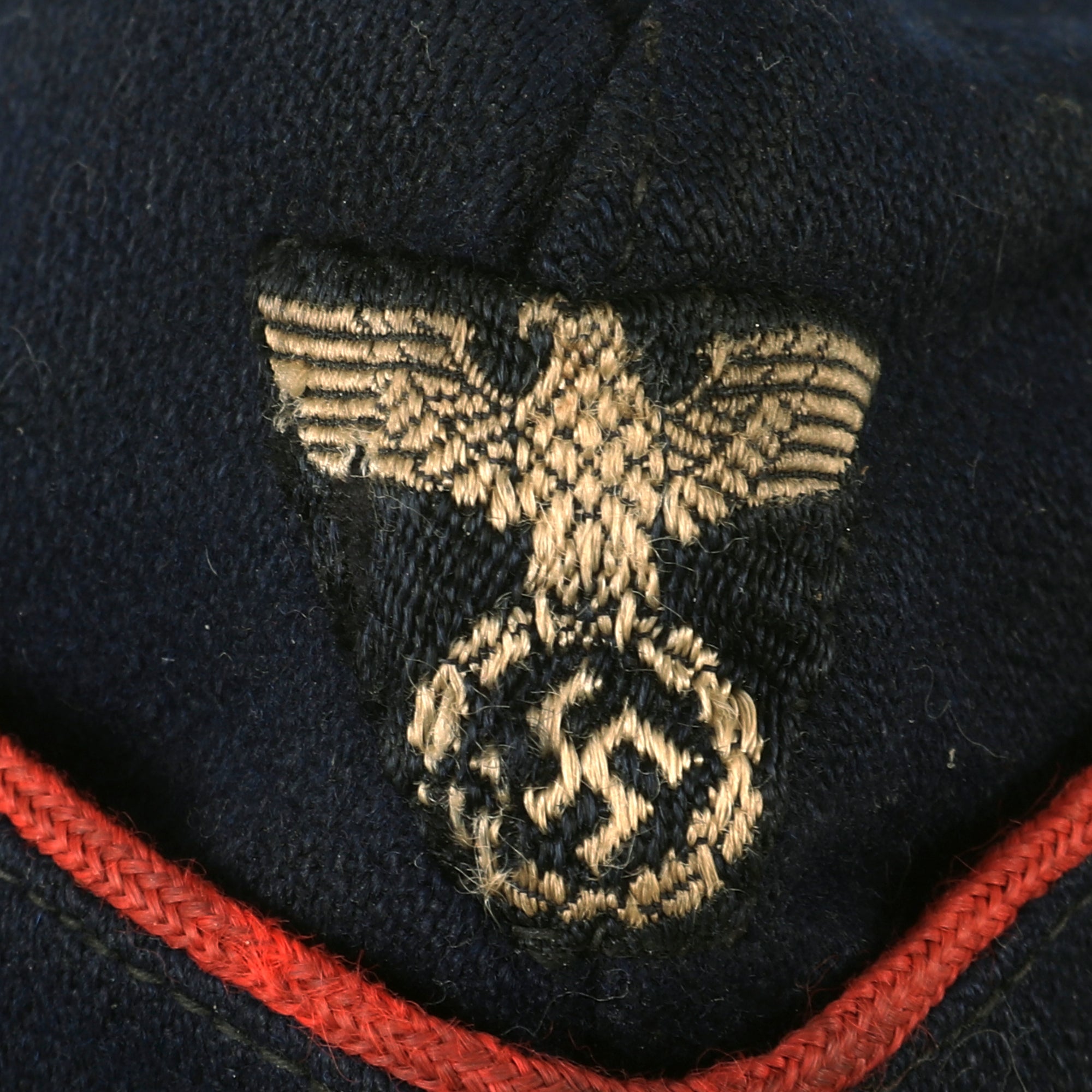 The design is similar to the overseas caps worn by the Kriegsmarine, as they do not have the scallop on the fold down flap around the side. It is fabricated from navy blue wool gabardine, and features the standard orange/red piping around the top of the fold down flap. The upper front bears the correct Reichspost BeVo embroidered style eagle, and there is a tri-color cockade attached below this on the front of the flap. The interior of the cap is lined with black canvas, which shows staining and wear from use. There is no maker or RZM tag.