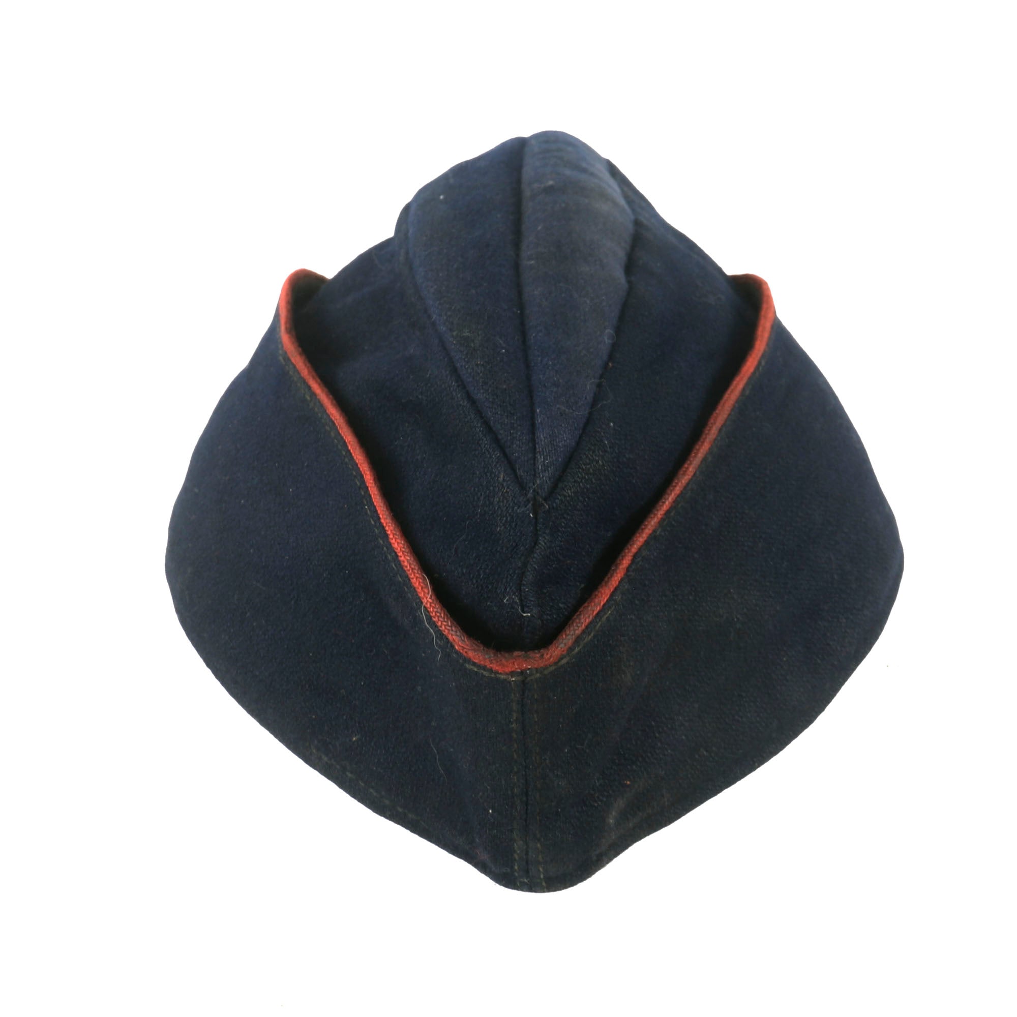 The overall condition shows the typical wear from service, which has worn away some of the fuzzy "nap" of the wool outer shell. There is a small bit of fraying in the red piping but it still displays very well. Overall a heavily worn cap but a scarce piece.