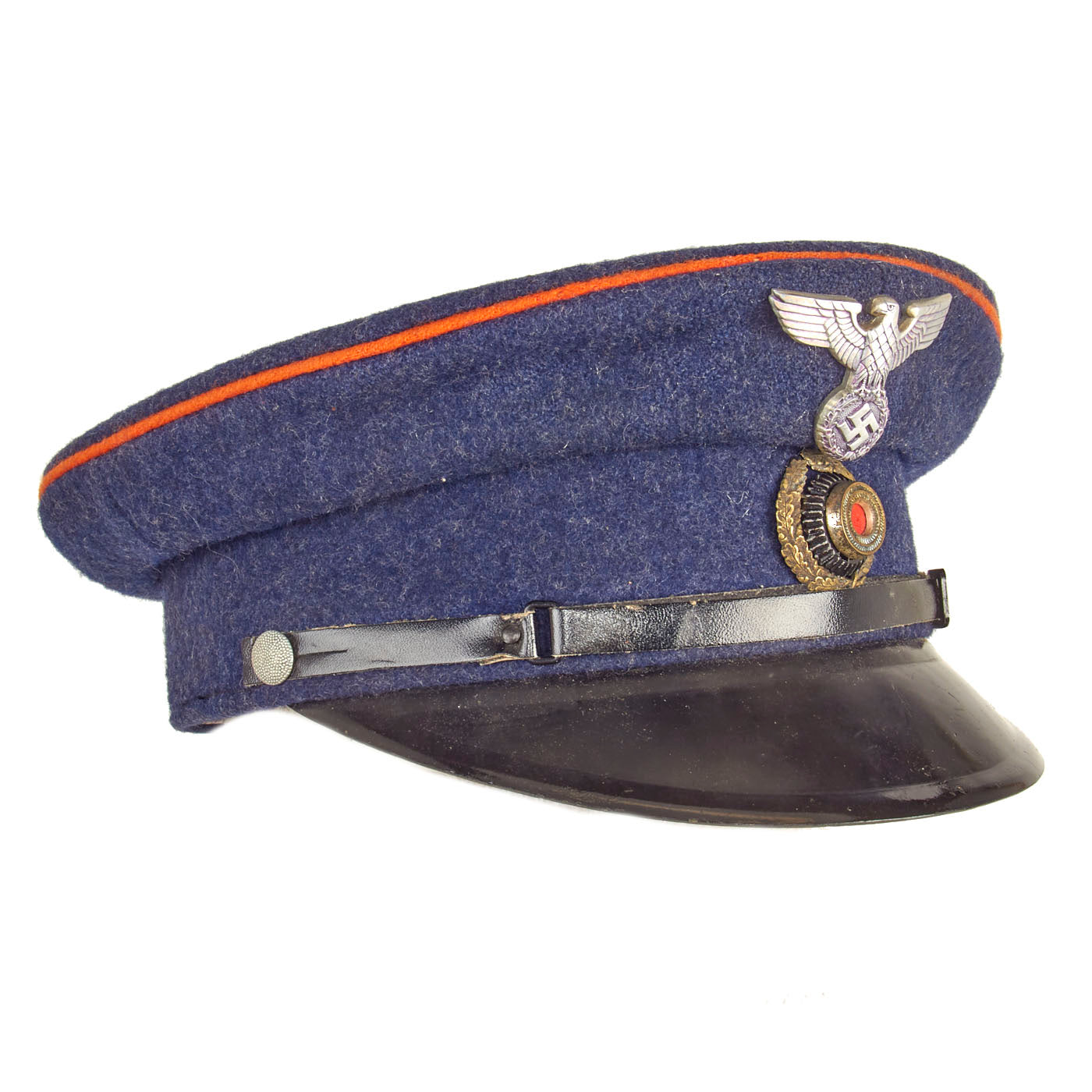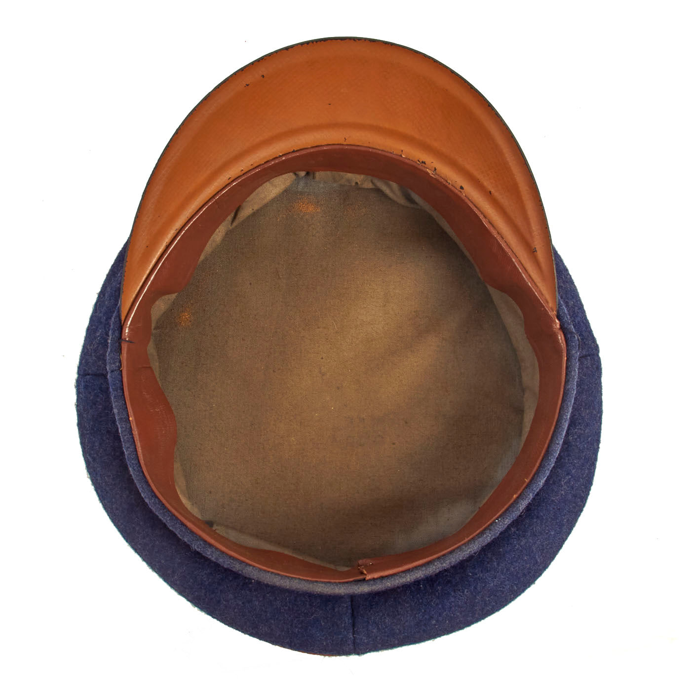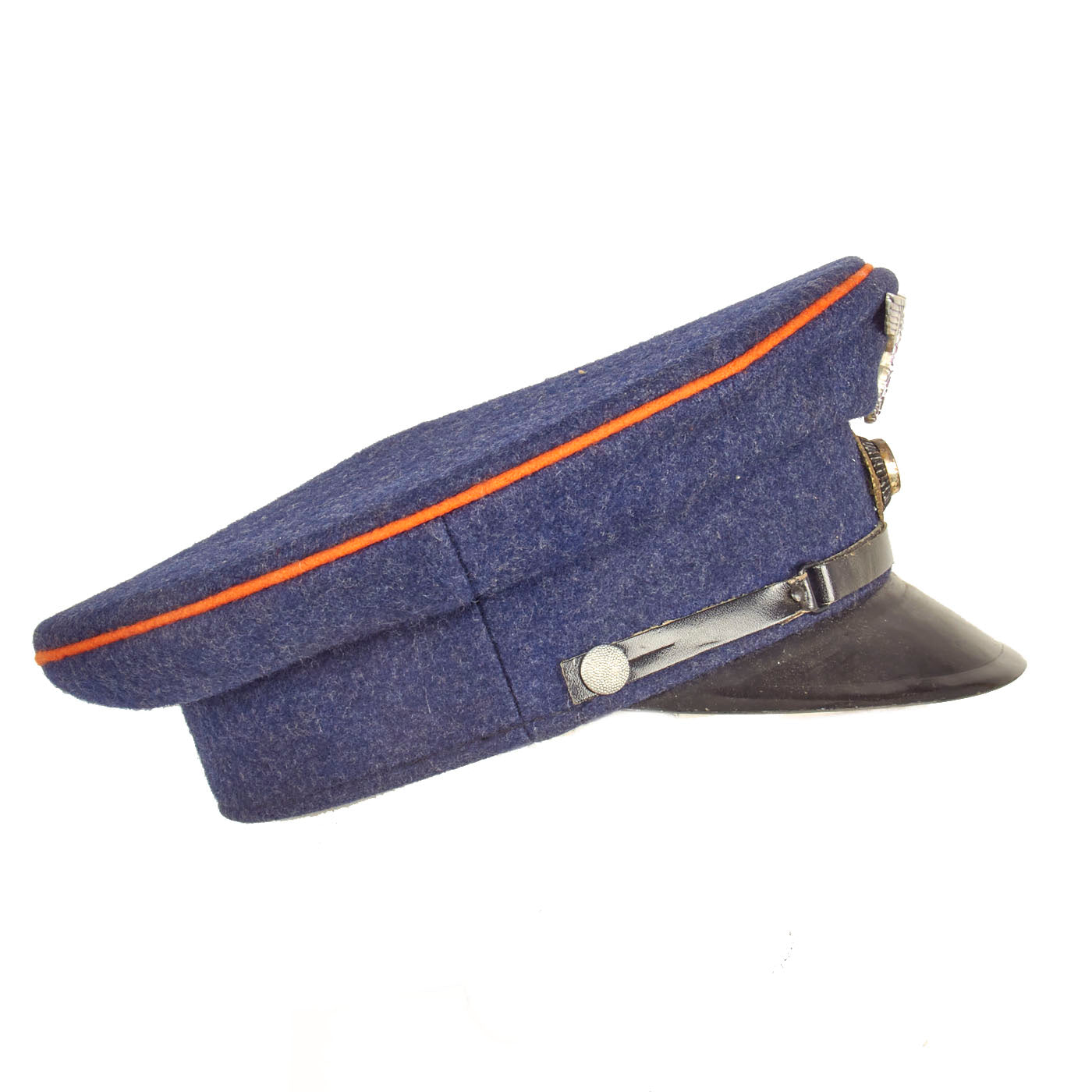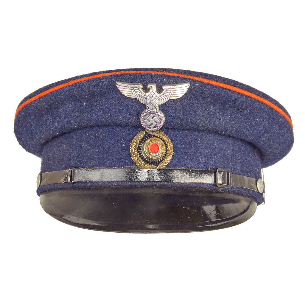 This visor is attributed to a Postschaffner, or “Post Conductor” as it translates to. The blue wool visor is in lovely condition and features the standard orange piping around the top, stamped NSDAP eagle clutching a mobile swas in its talons and a lovely cockade beneath that. Both pebbled buttons on the side for the chin strap are present as well as the decorative chin strap. The black visor has minor crazing present with most of the glossy finish still present. The interior lining is a lovely dark gray with a complete sweatband. There is no stampings or other marking present. We measured the visor and it is approximately 58cm.